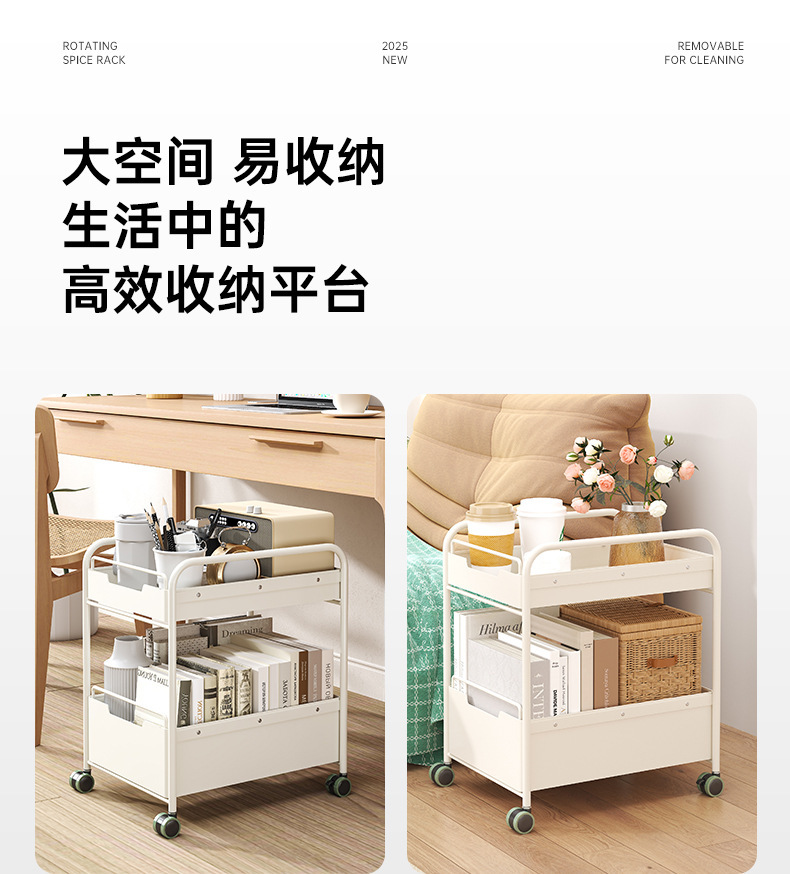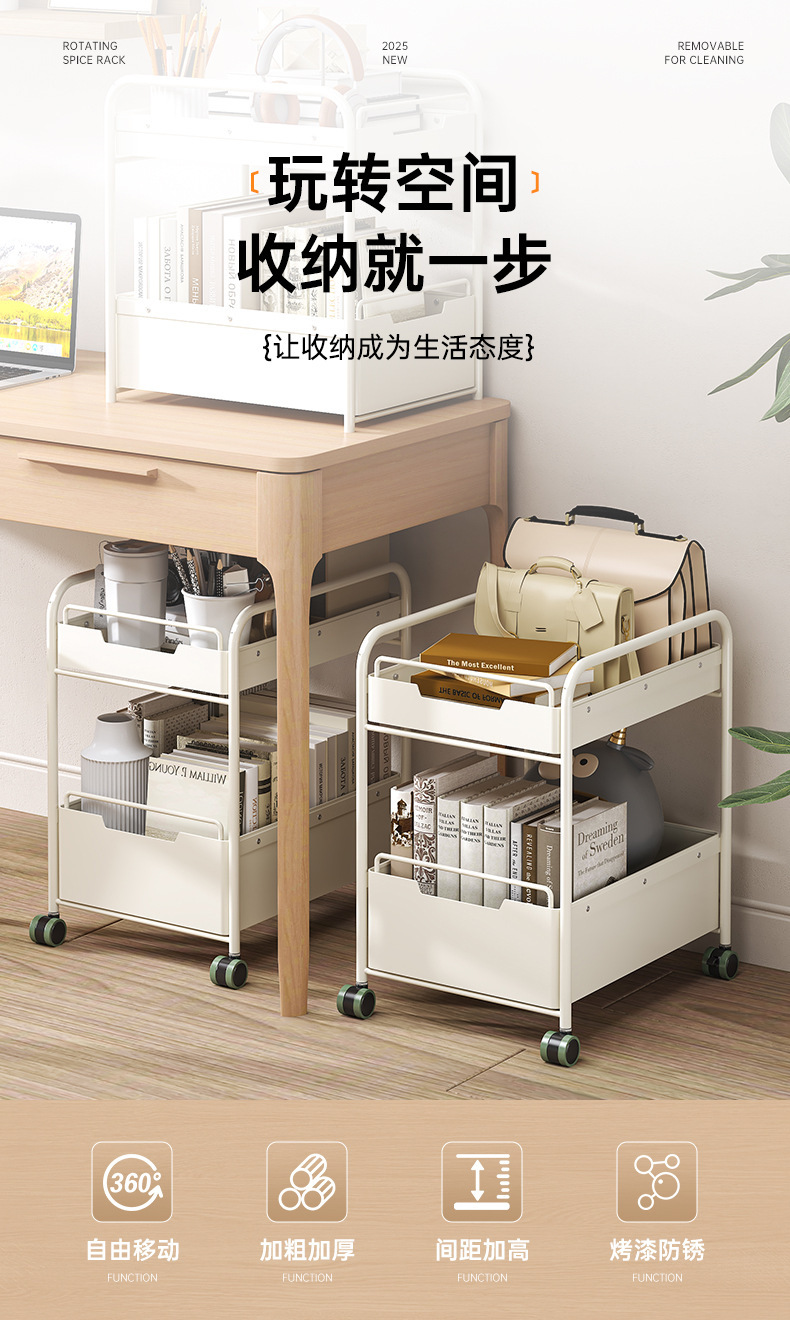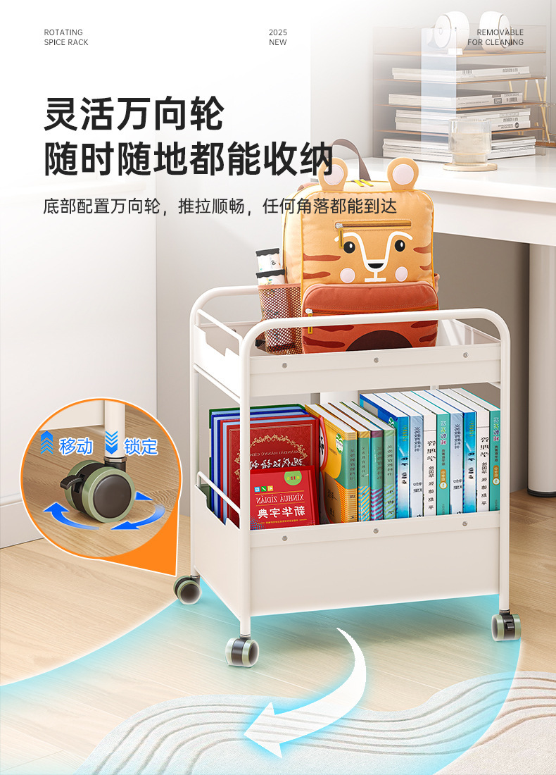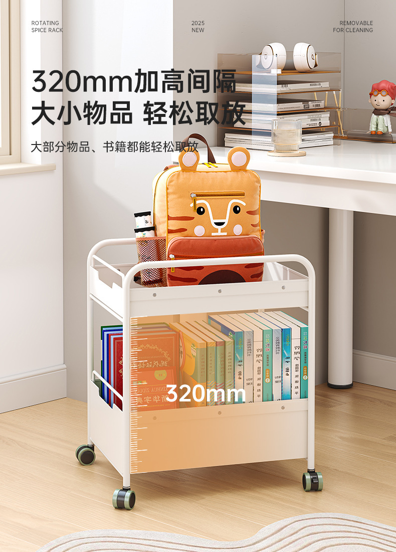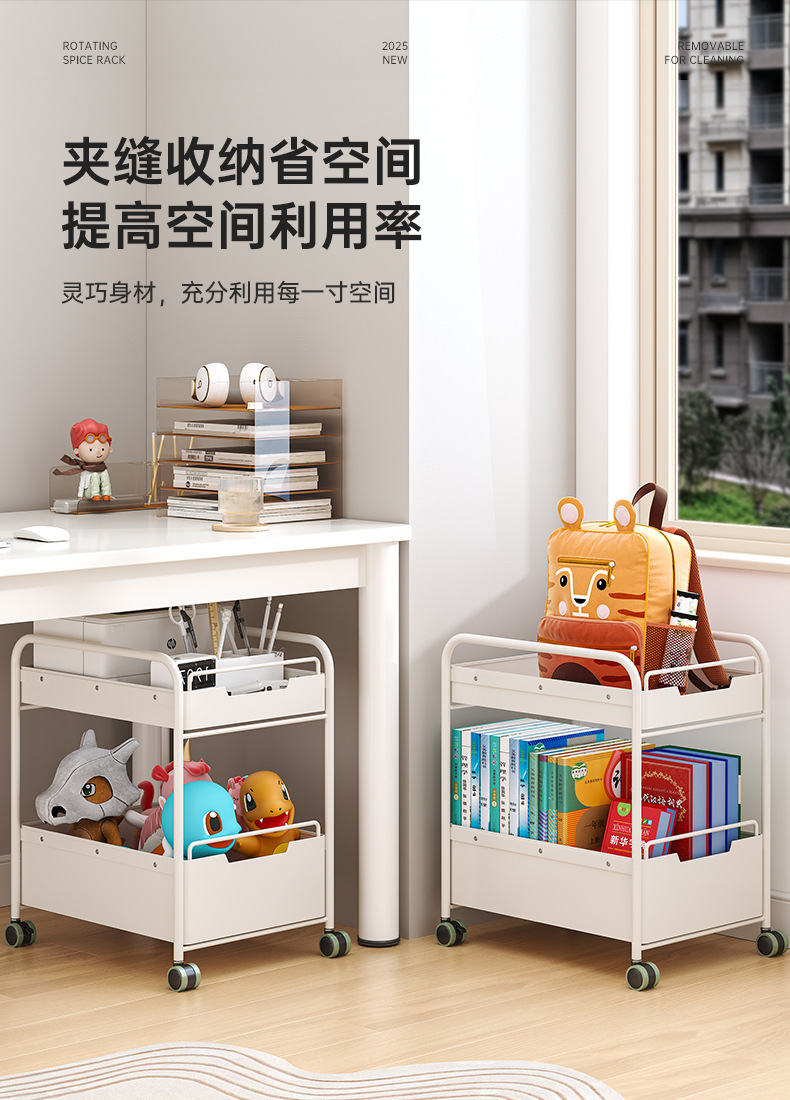 책가방과 책을 위한 책상 아래 이동식 수납선반, 어린이 간식과 장난감을 위한 바닥선반, 유모차, 테이블 옆 수납선반