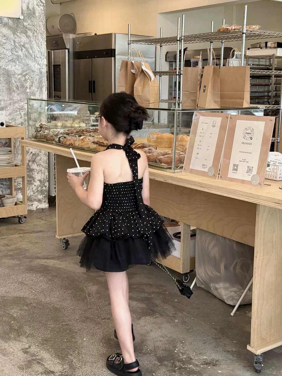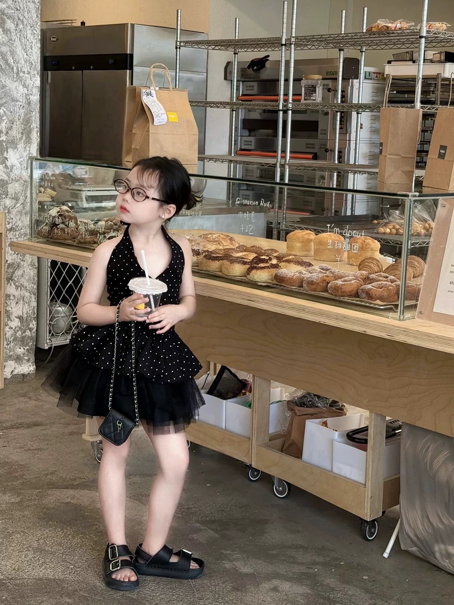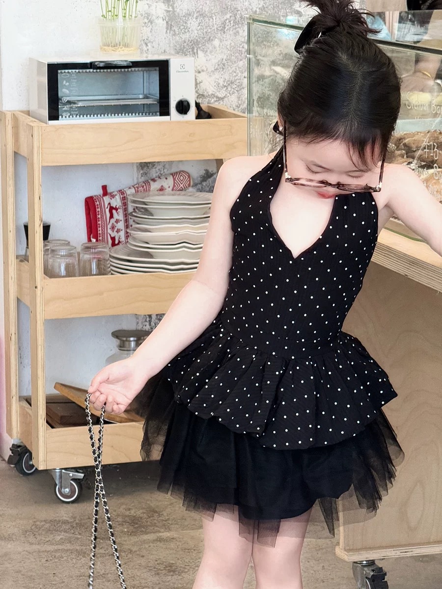 한국 스타일 여름 홍콩 스타일 홀터넥 탑 도트 무늬 서스펜더 + 복고풍 검은 거즈 스커트 스커트스토어 가기