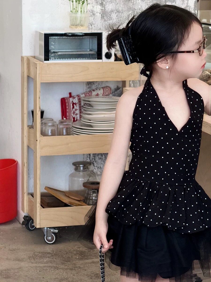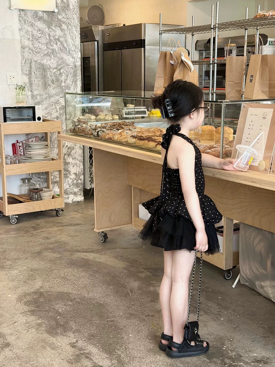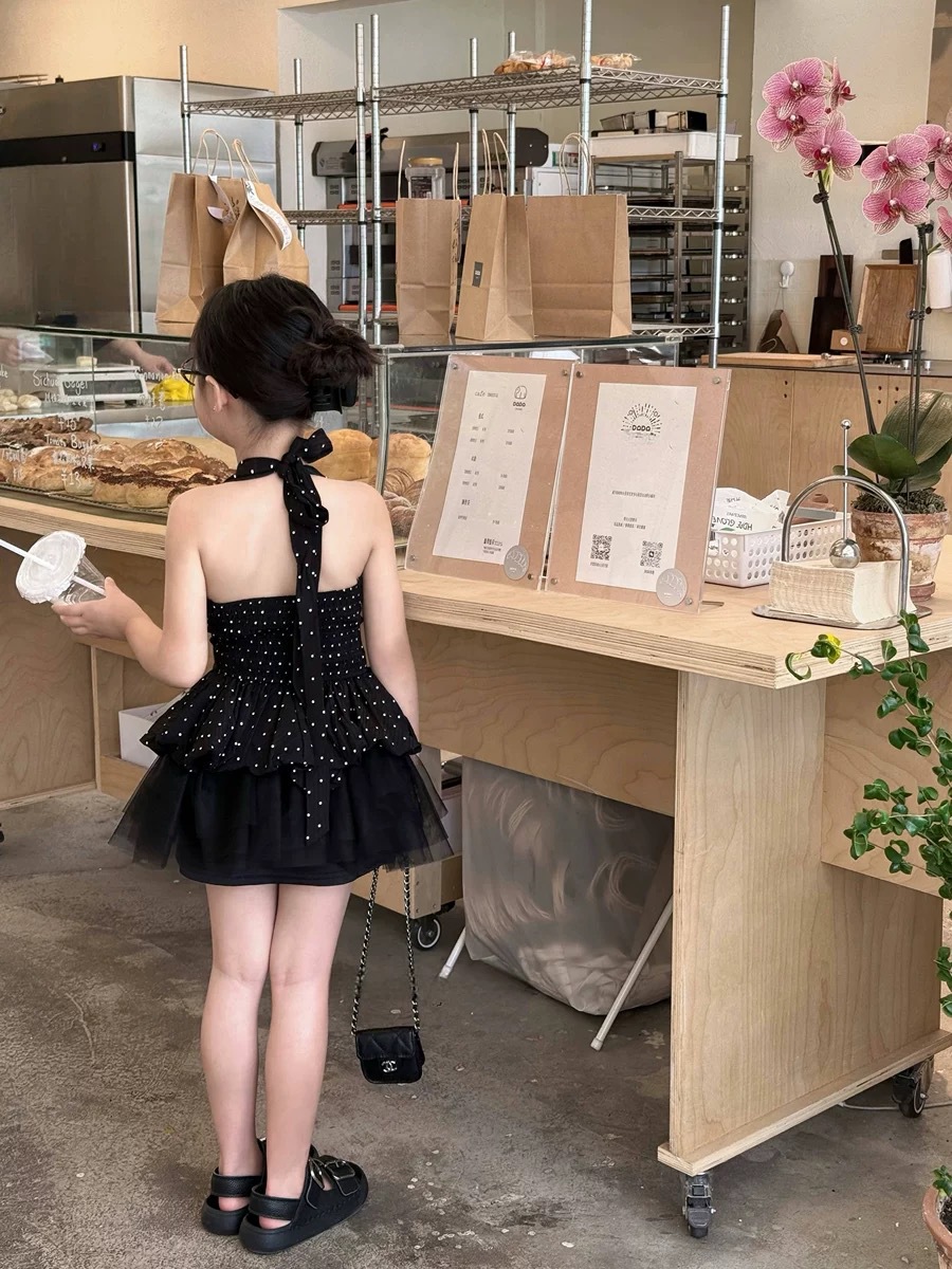 한국 스타일 여름 홍콩 스타일 홀터넥 탑 도트 무늬 서스펜더 + 복고풍 검은 거즈 스커트 스커트스토어 가기