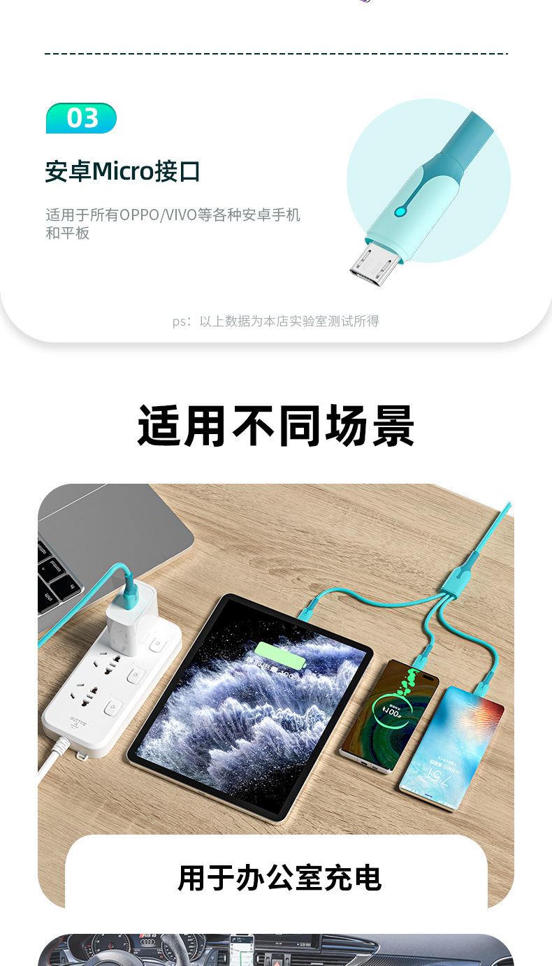 3-in-1 데이터 케이블, 1-3 충전 케이블, Apple, Huawei 및 Android 휴대폰에 적합한 초고속 충전 세트 플러그