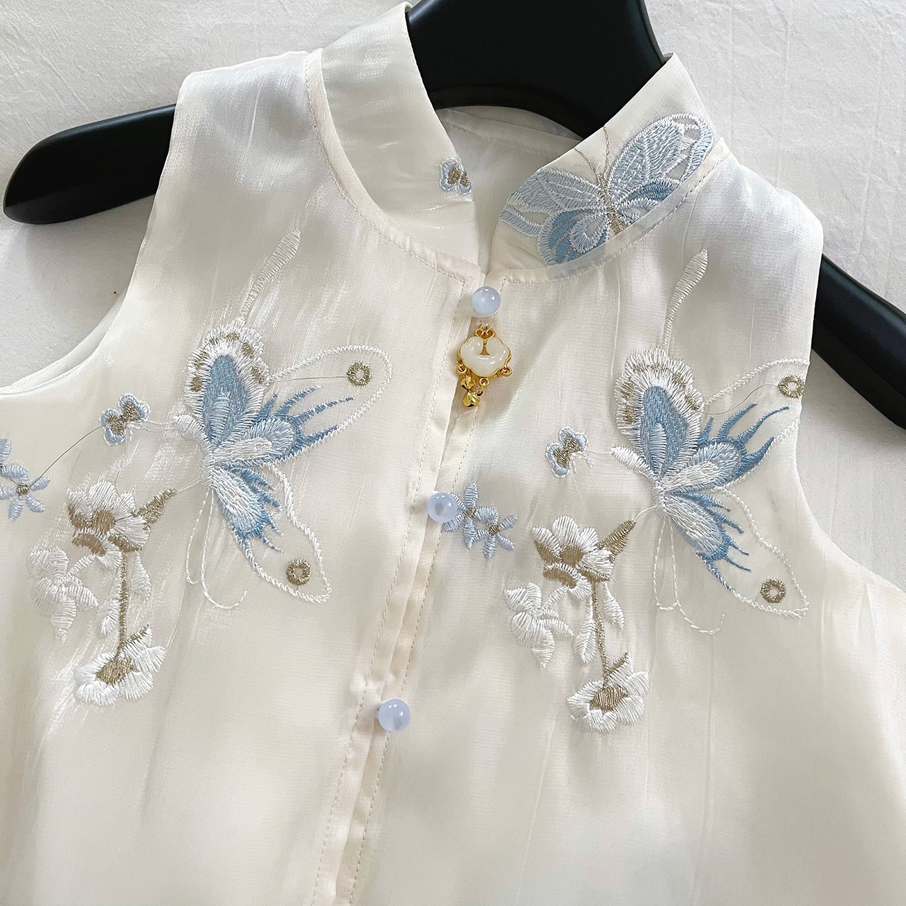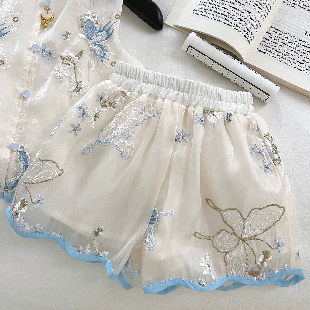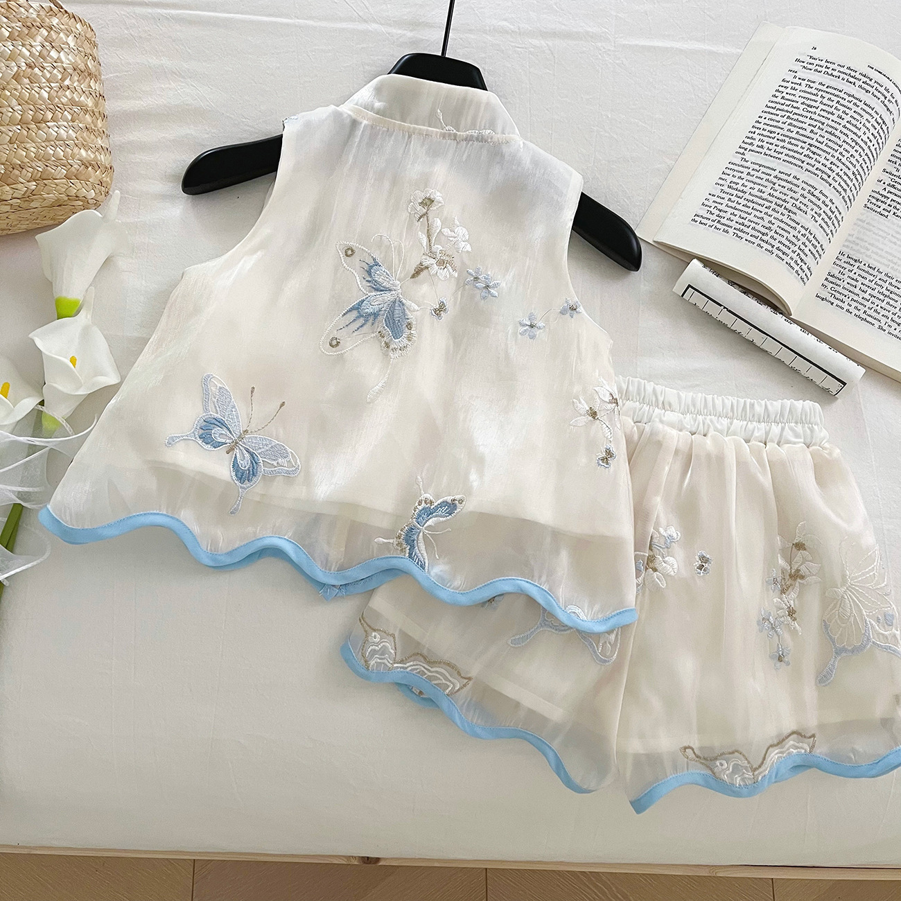 2025 고대 스타일 새로운 중국 스타일 소녀 여름 정장 수 놓은 반바지 정장 아기 꽃 중국 스타일 투피스 세트