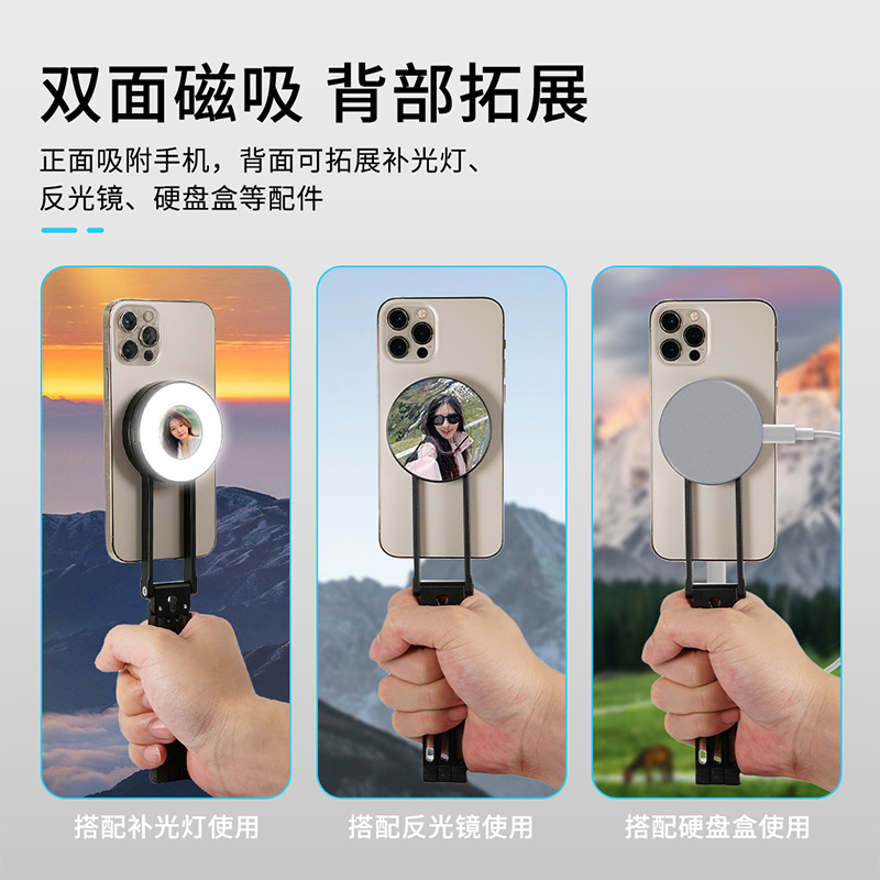 4.创意拓展,正面吸附手机,反面吸附配件(自拍镜、补光灯、硬盘盒等),任意搭配,好拍摄。