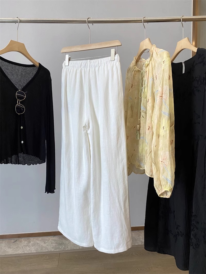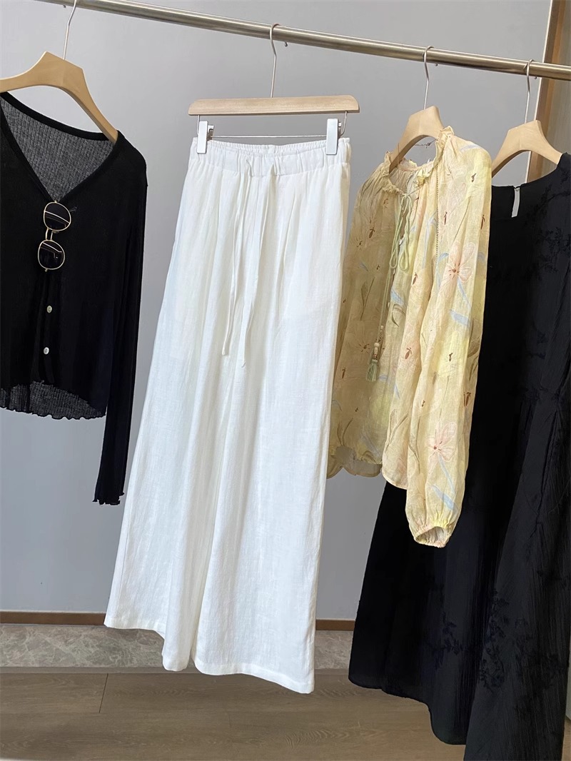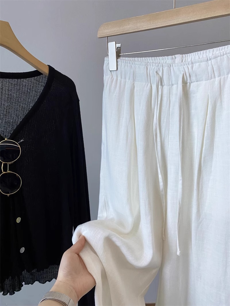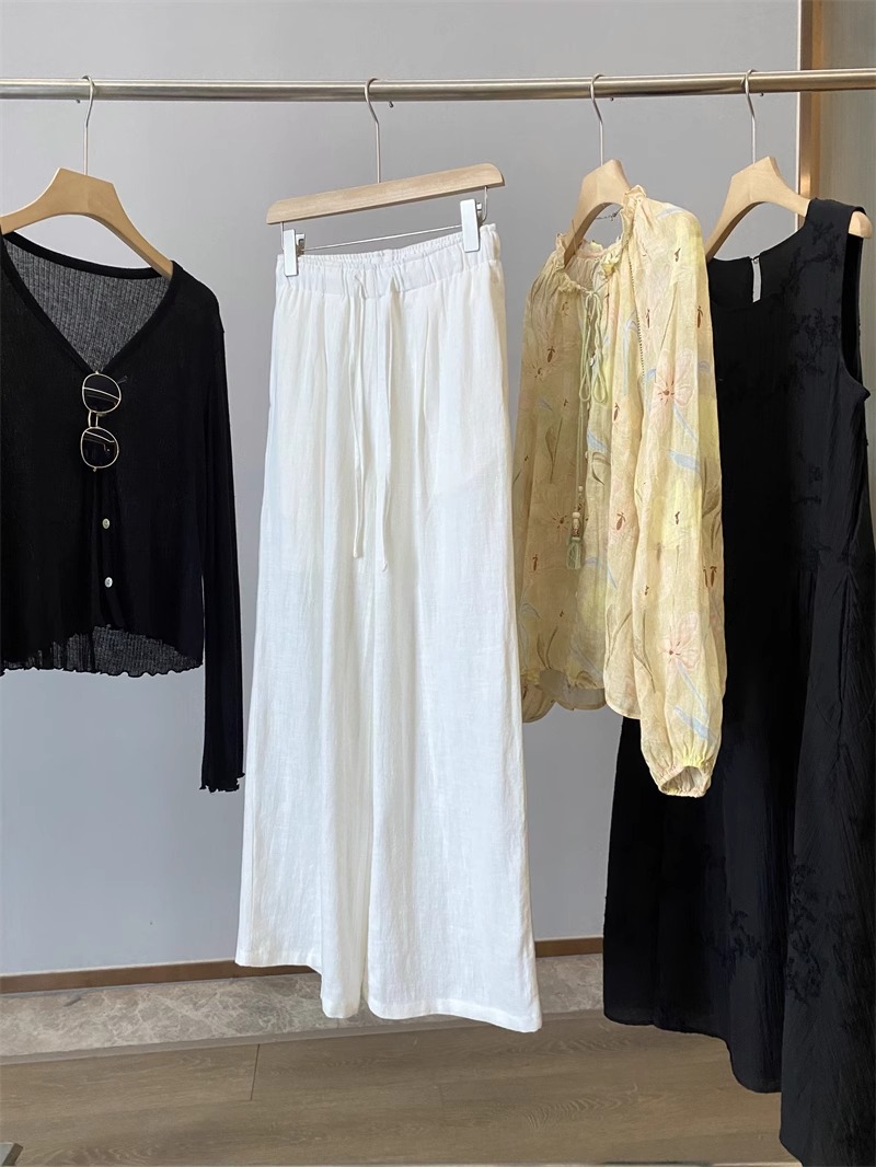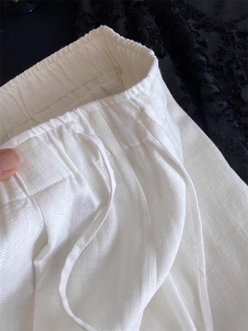 휴일 스타일 하이 퀄리티 drawstring 탄성 허리 슬림 흰색 넓은 다리 바지 여성의 2025 여름 새로운 캐주얼 바지스토어 가기