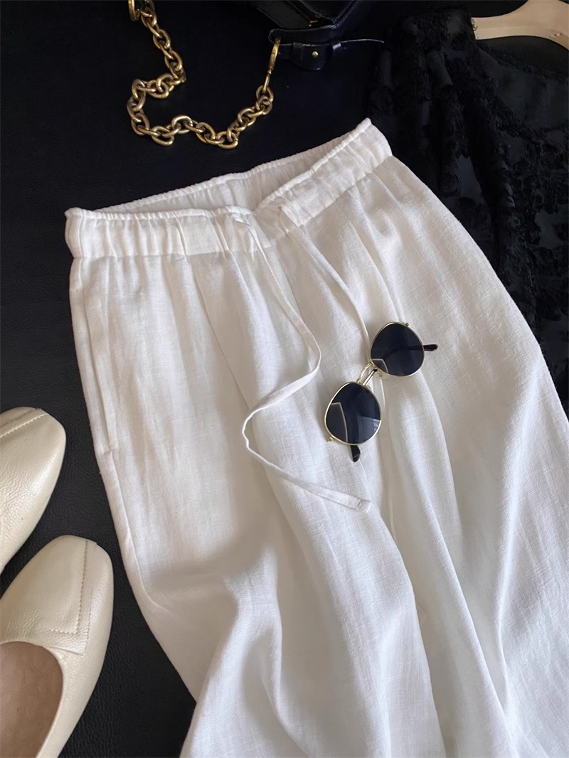 휴일 스타일 하이 퀄리티 drawstring 탄성 허리 슬림 흰색 넓은 다리 바지 여성의 2025 여름 새로운 캐주얼 바지