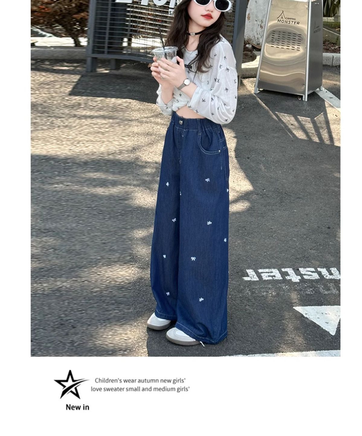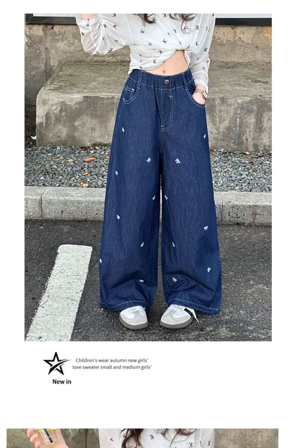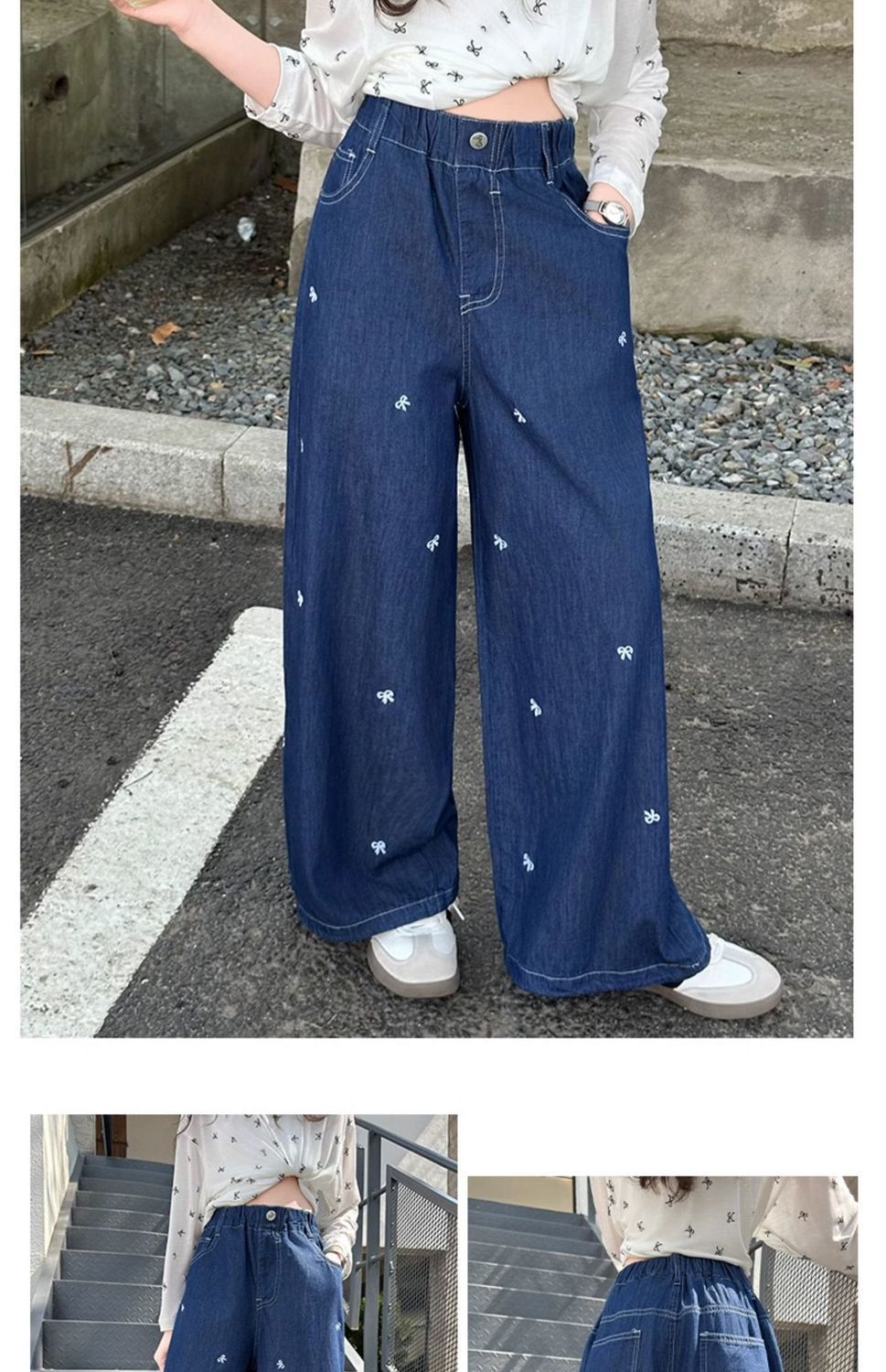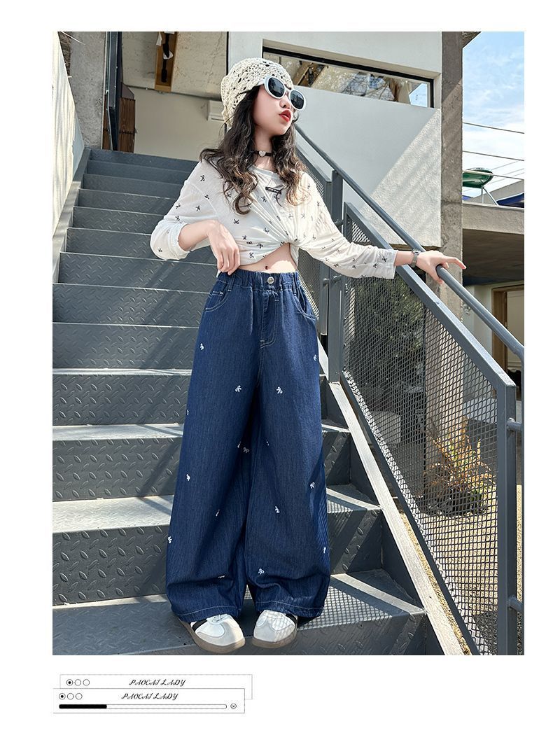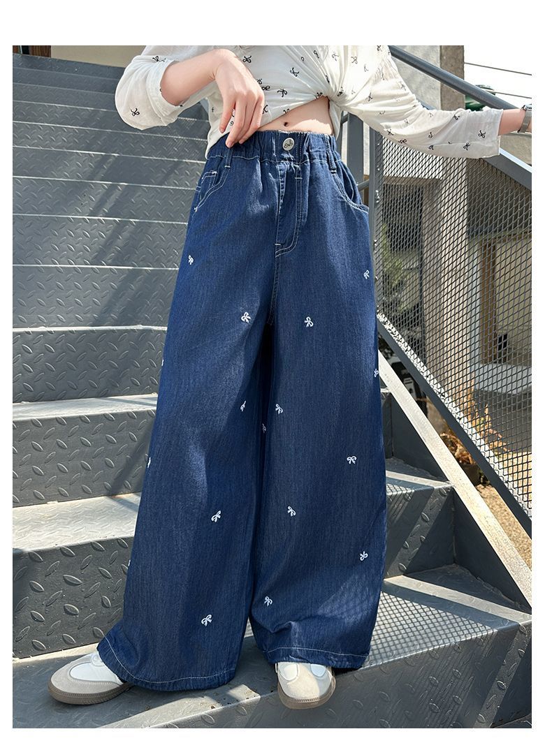 여아 청바지 여름 2025 새로운 한국 스타일 중대형 아동 스타일 보우 바지 루즈한 와이드 팬츠 트렌디스토어 가기