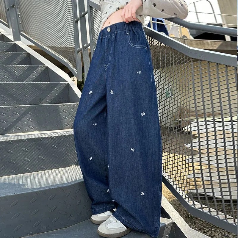 여아 청바지 여름 2025 새로운 한국 스타일 중대형 아동 스타일 보우 바지 루즈한 와이드 팬츠 트렌디