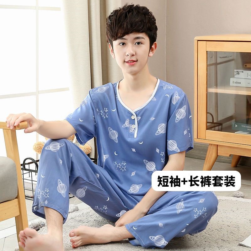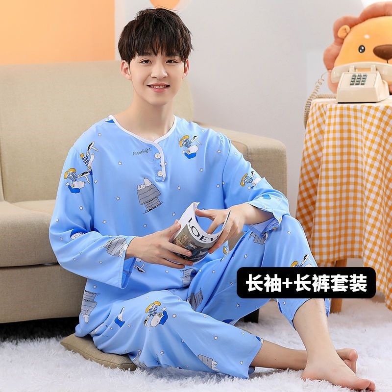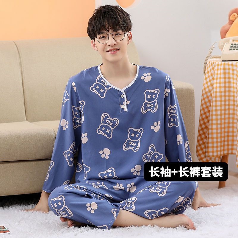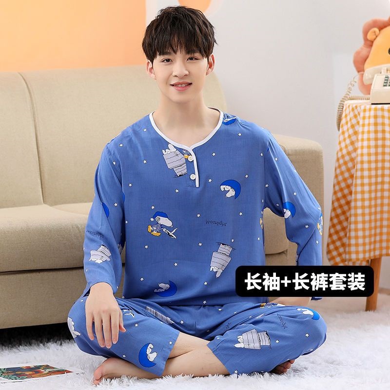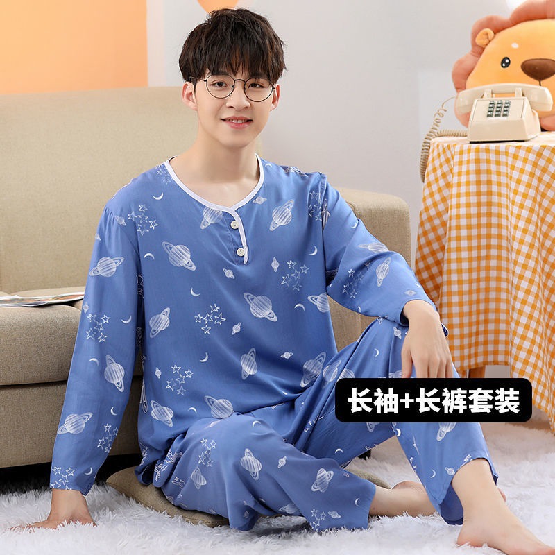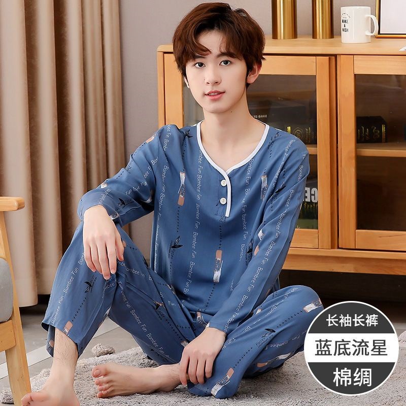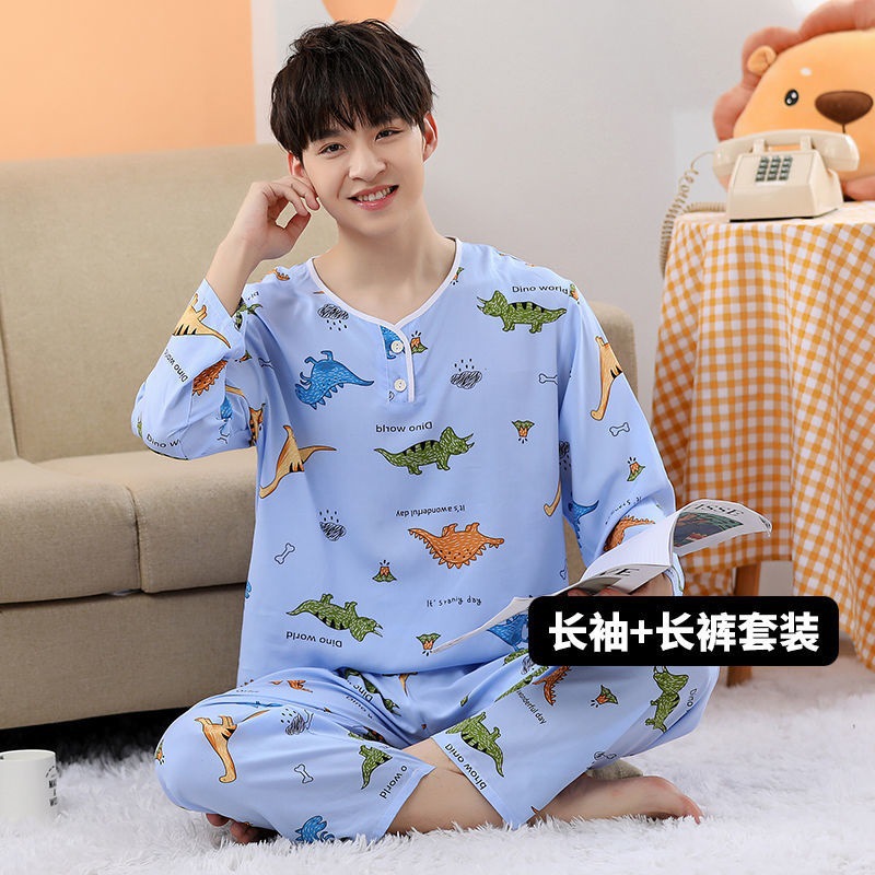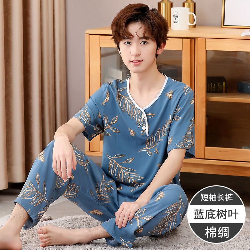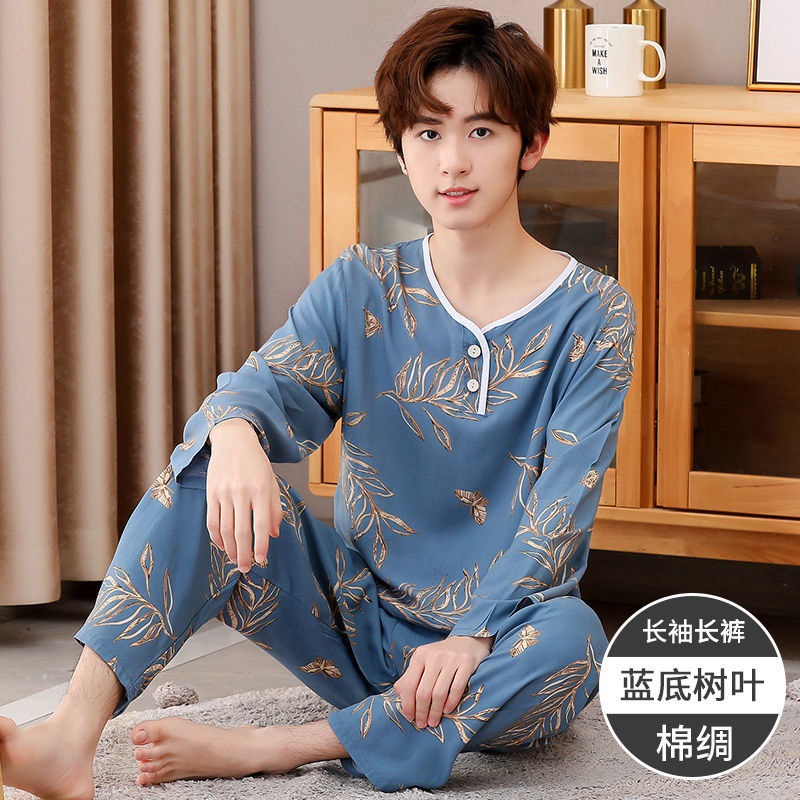 남자를위한 코튼 실크 잠옷 큰 소년과 소년을위한 여름 얇은 스타일 긴 소매 코튼 실크 세트 청소년 남성 홈 의류스토어 가기