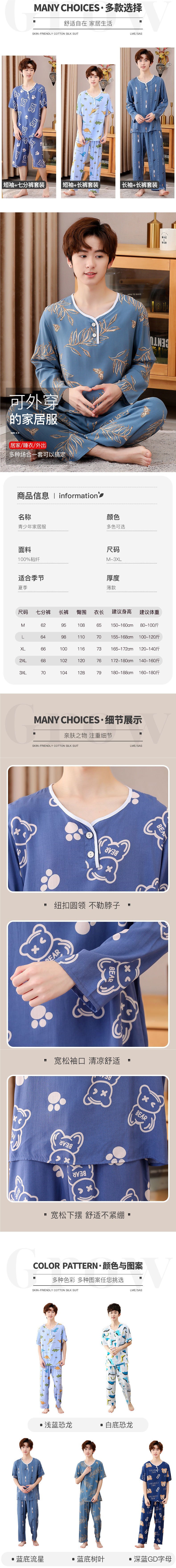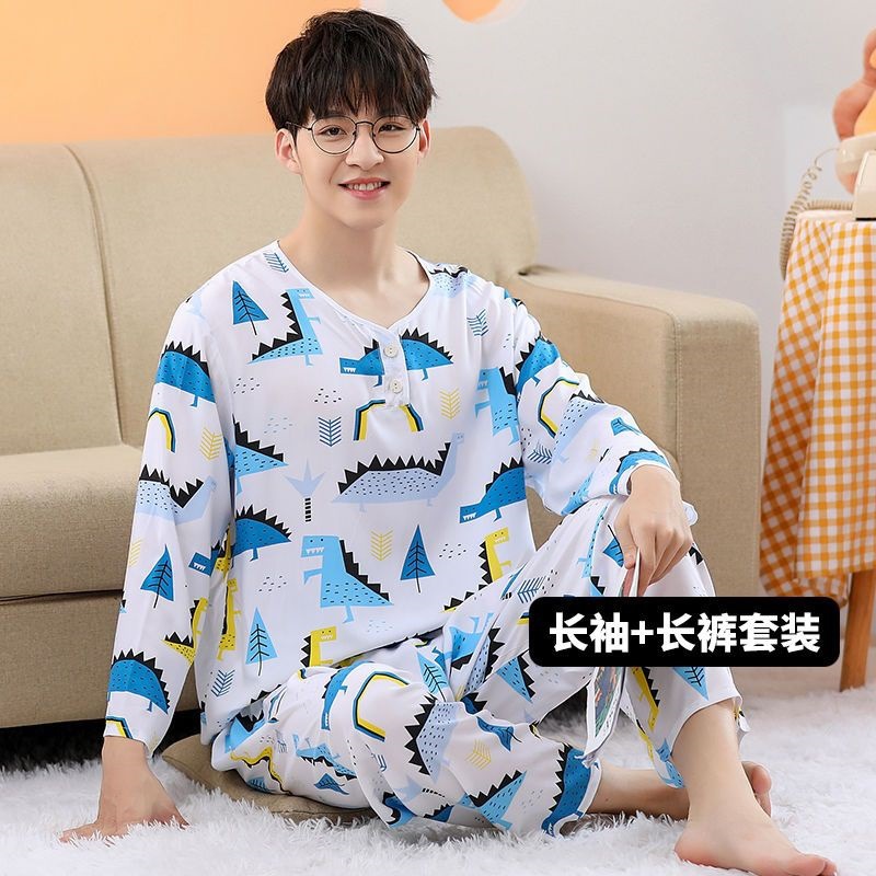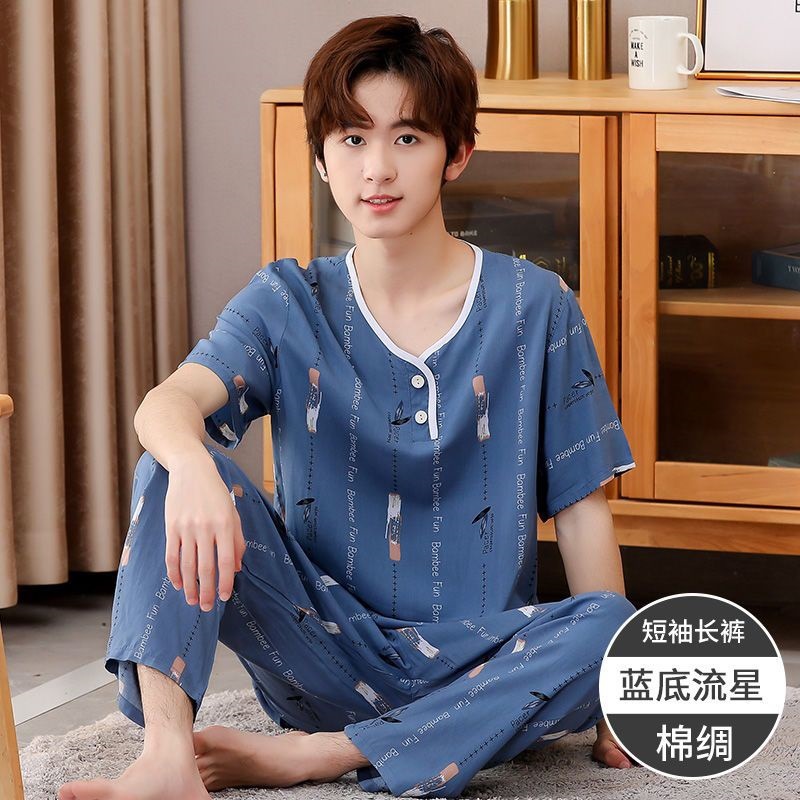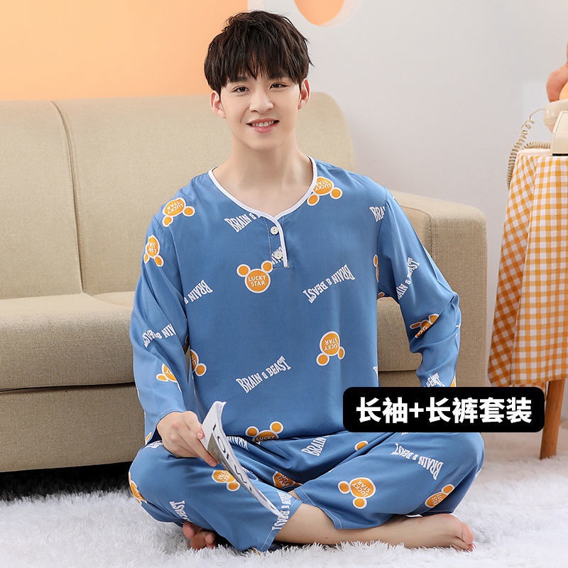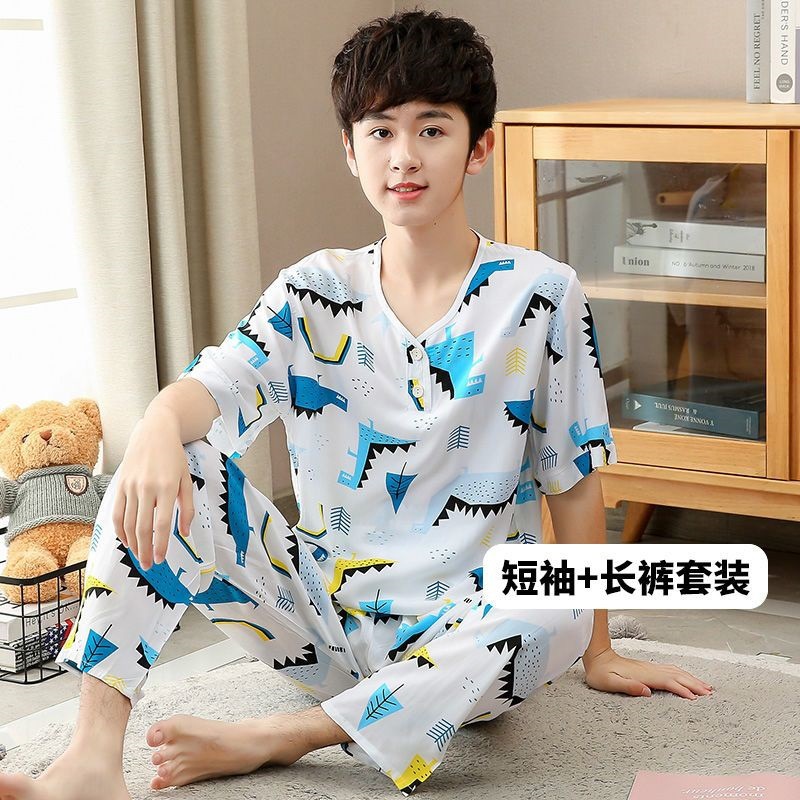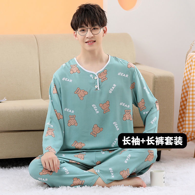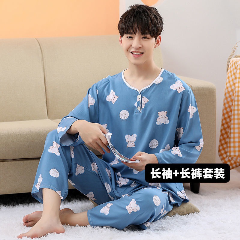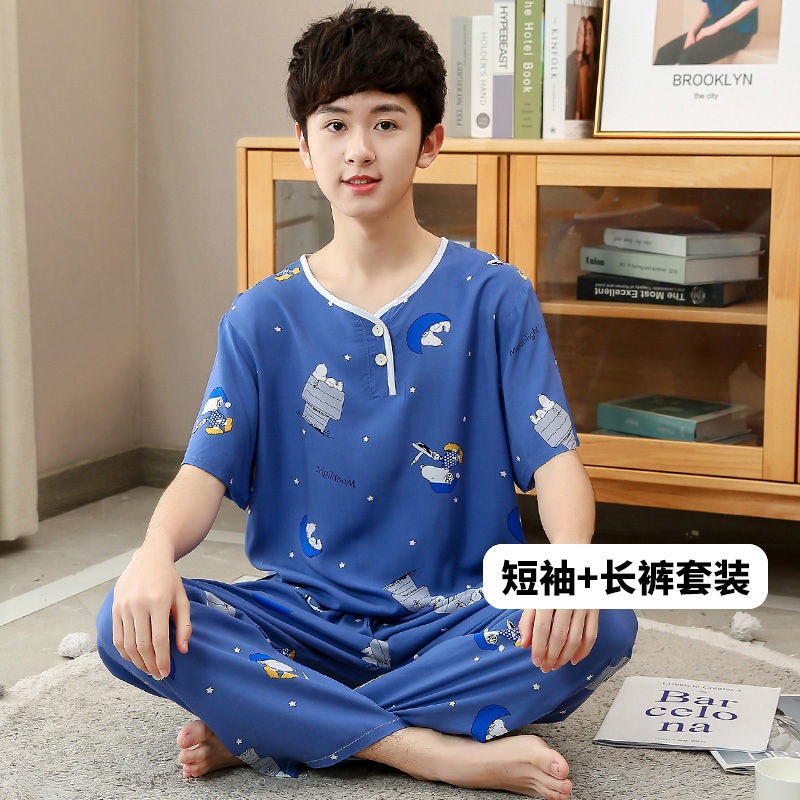남자를위한 코튼 실크 잠옷 큰 소년과 소년을위한 여름 얇은 스타일 긴 소매 코튼 실크 세트 청소년 남성 홈 의류스토어 가기