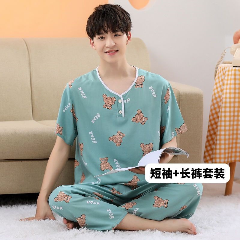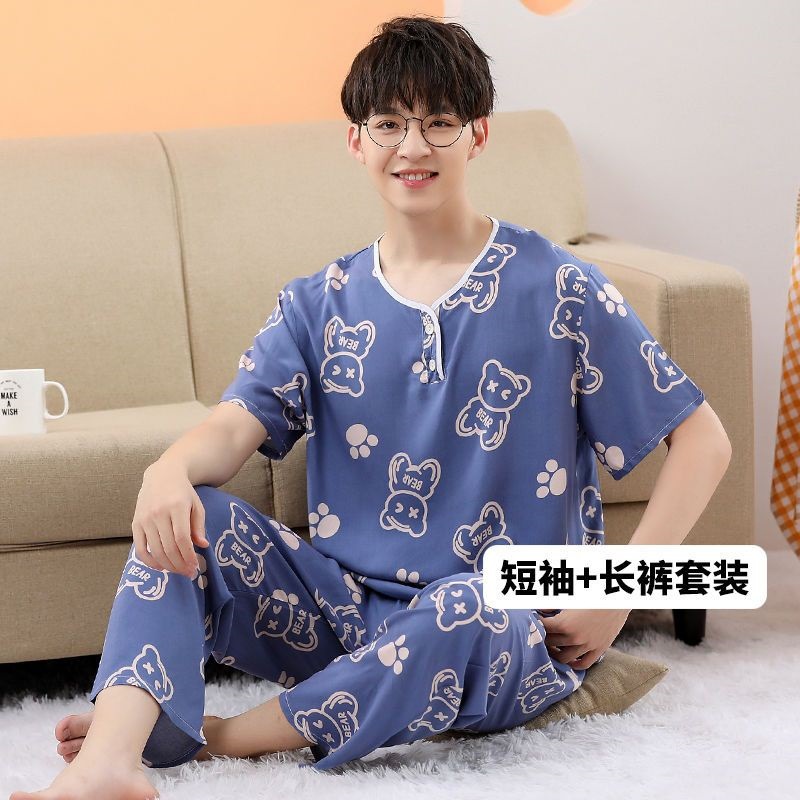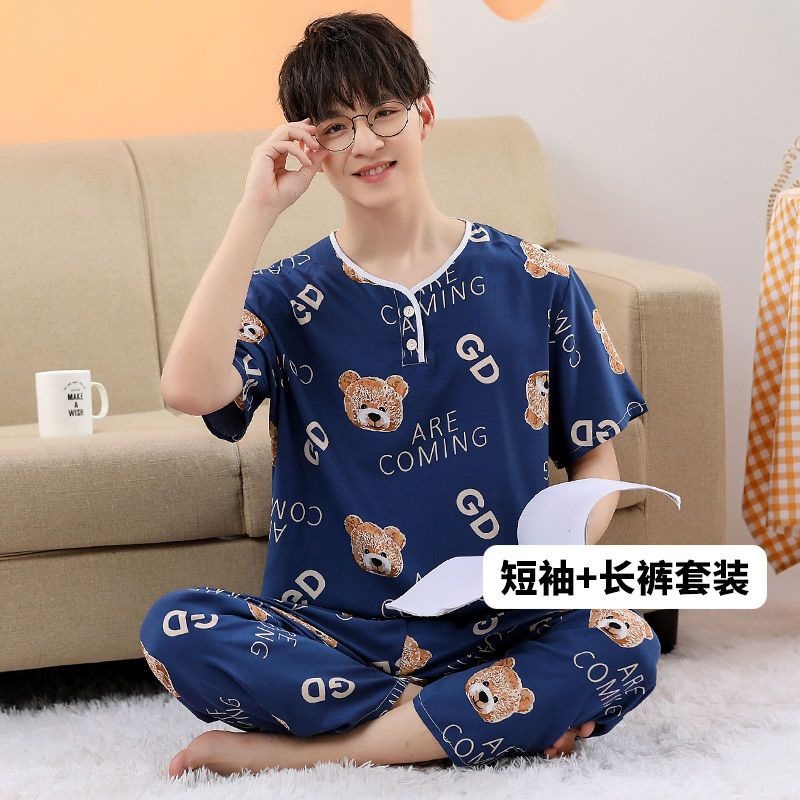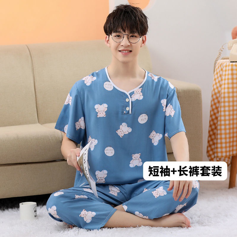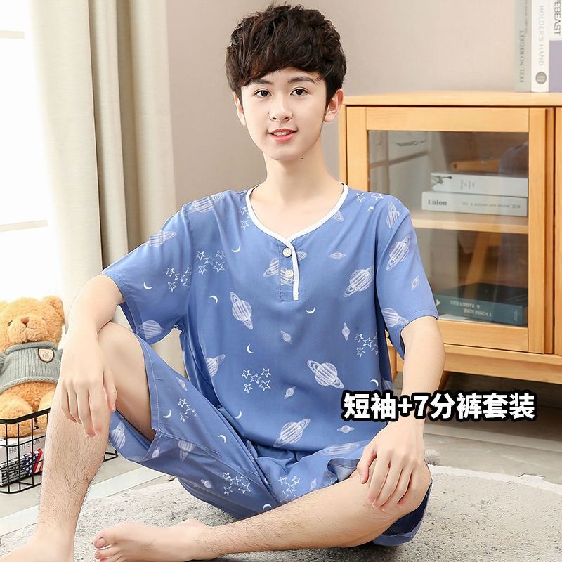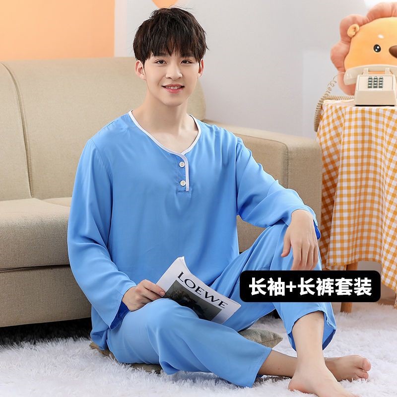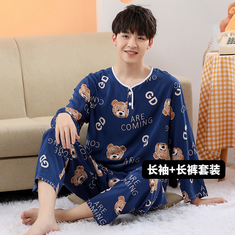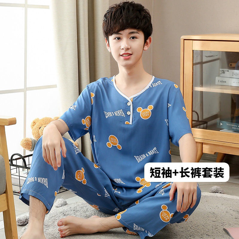 남자를위한 코튼 실크 잠옷 큰 소년과 소년을위한 여름 얇은 스타일 긴 소매 코튼 실크 세트 청소년 남성 홈 의류스토어 가기