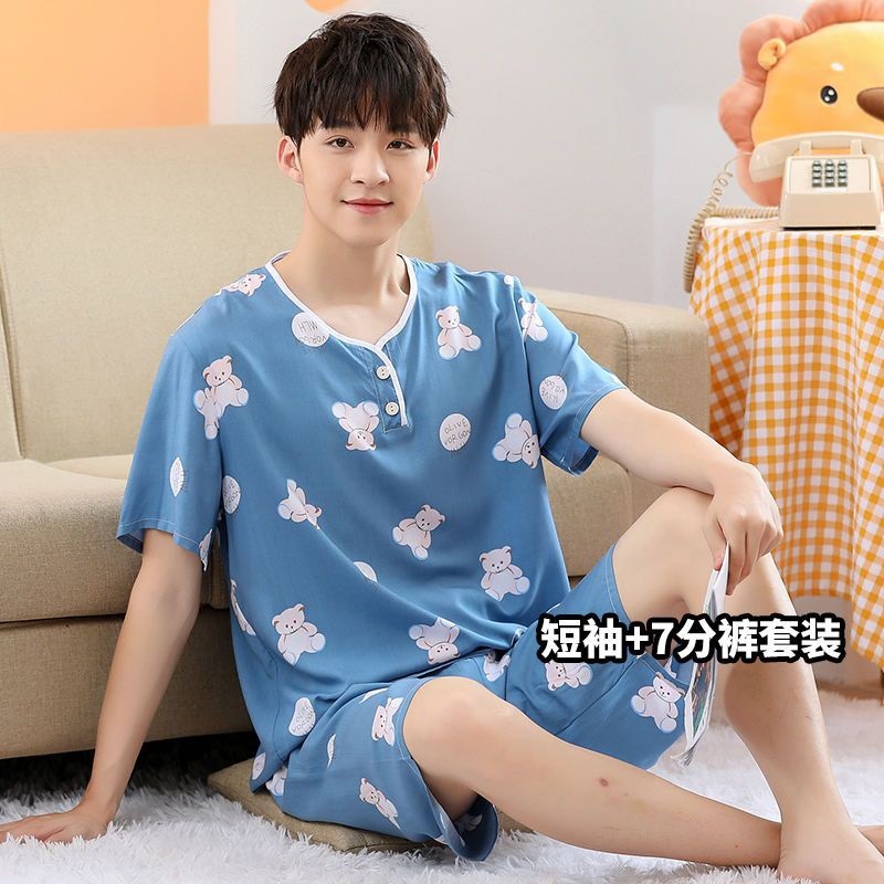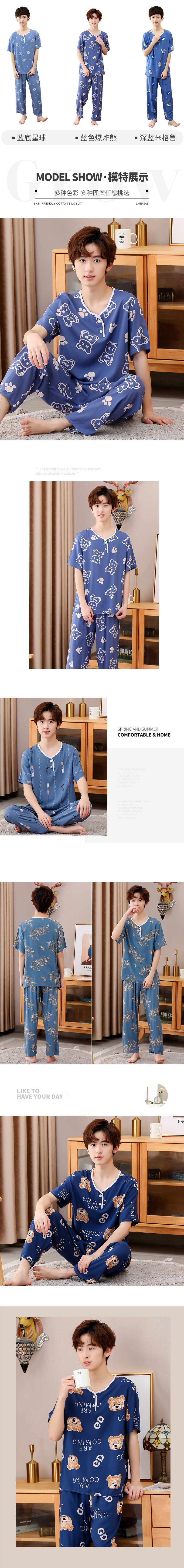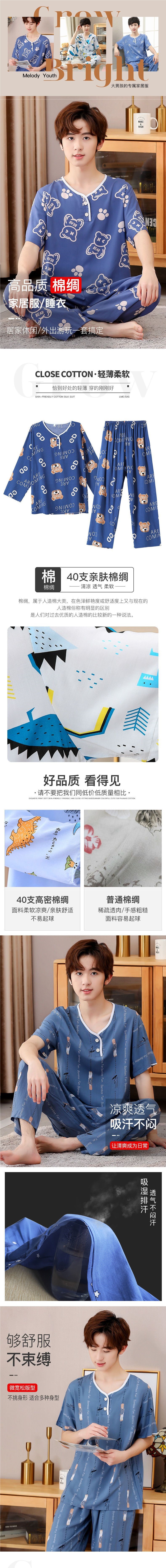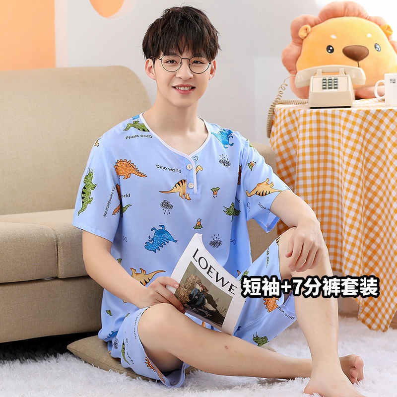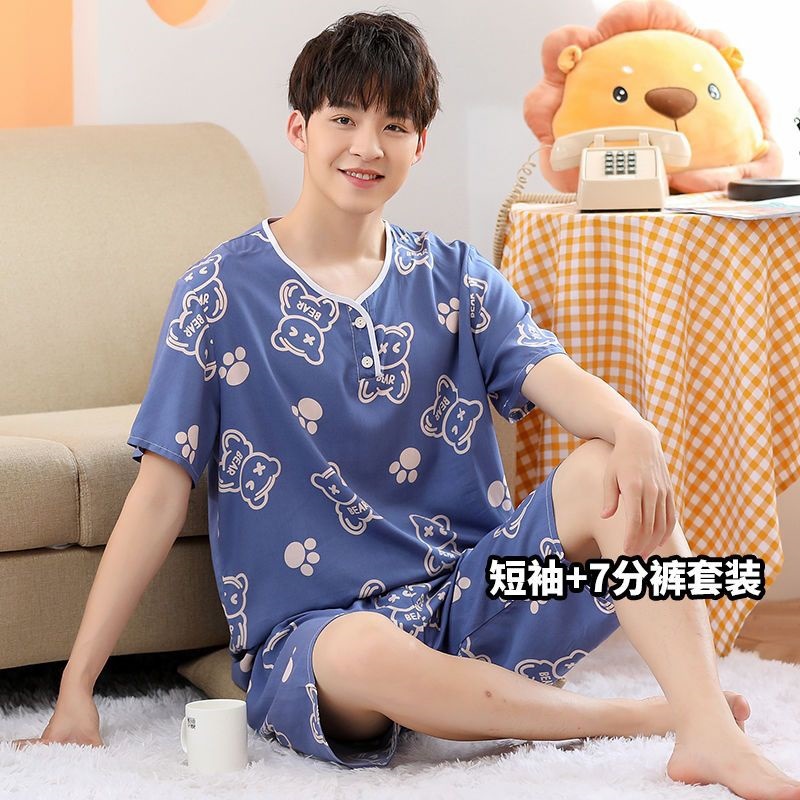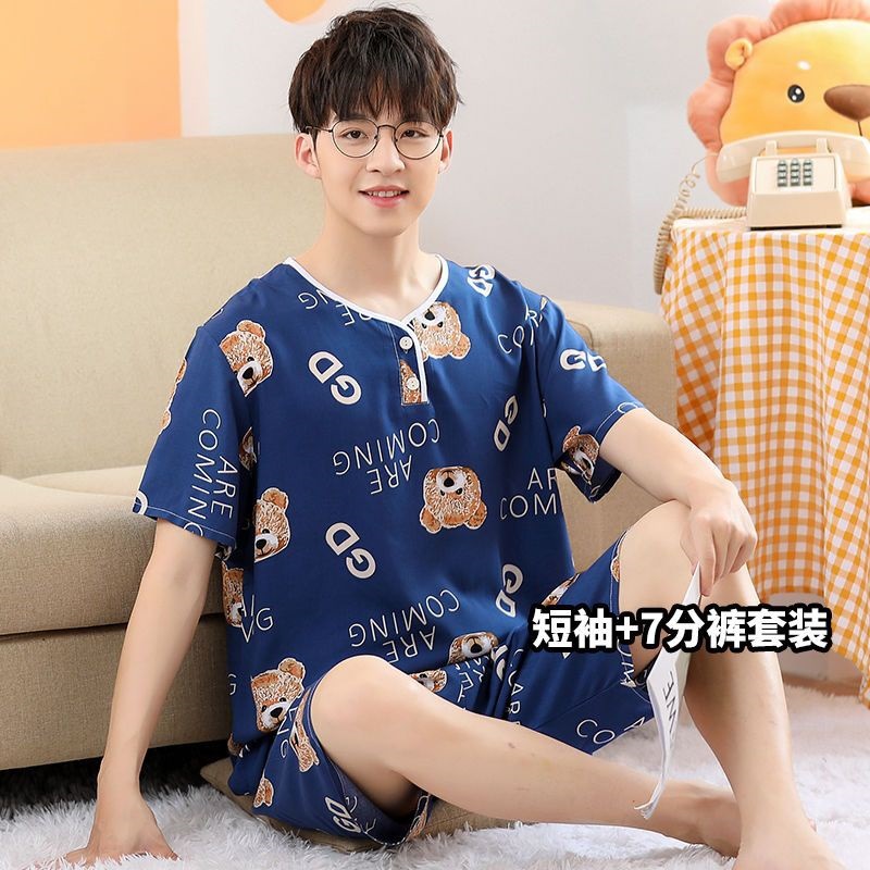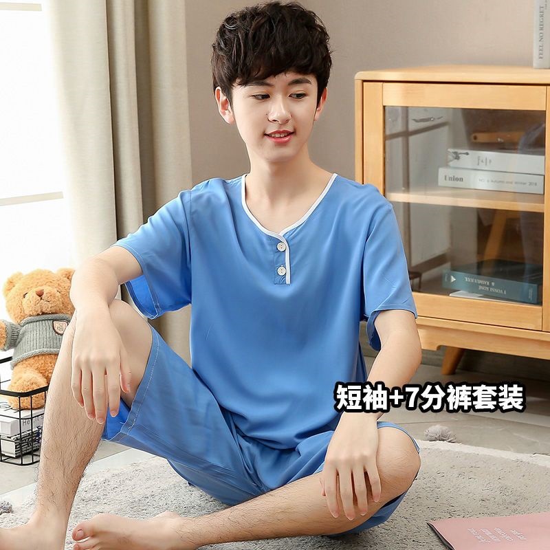 남자를위한 코튼 실크 잠옷 큰 소년과 소년을위한 여름 얇은 스타일 긴 소매 코튼 실크 세트 청소년 남성 홈 의류스토어 가기
