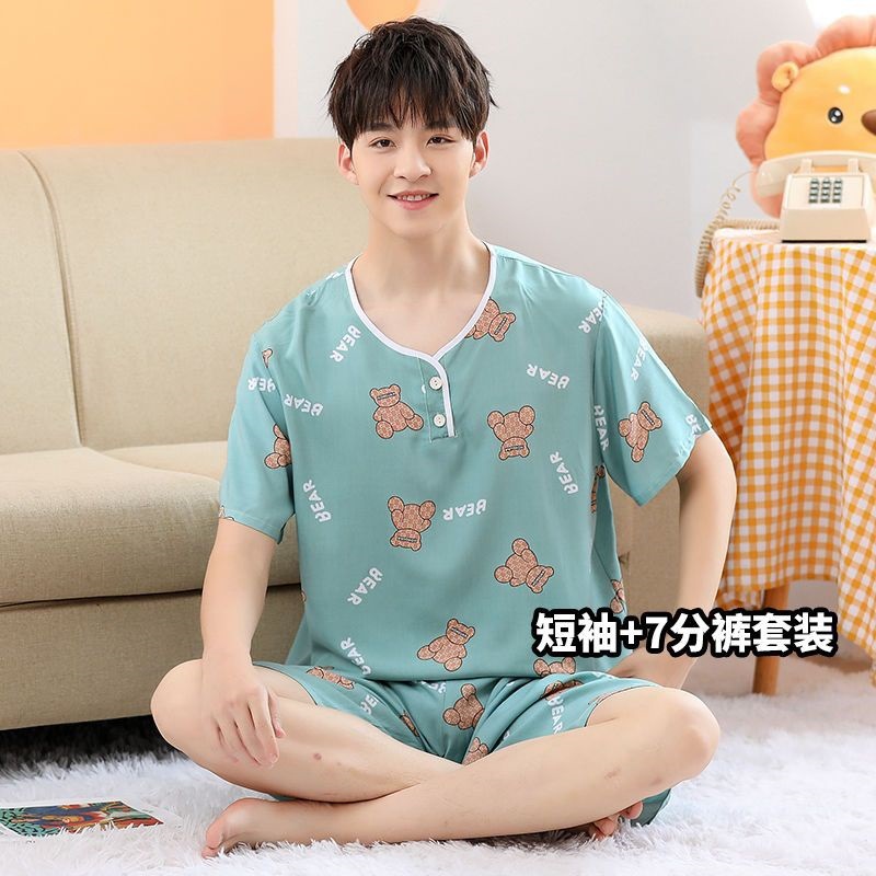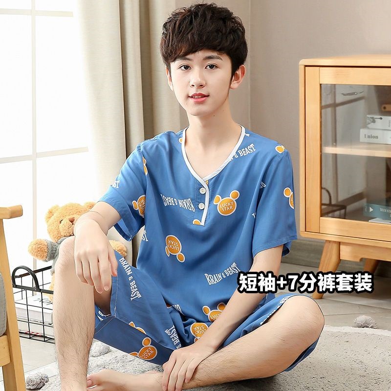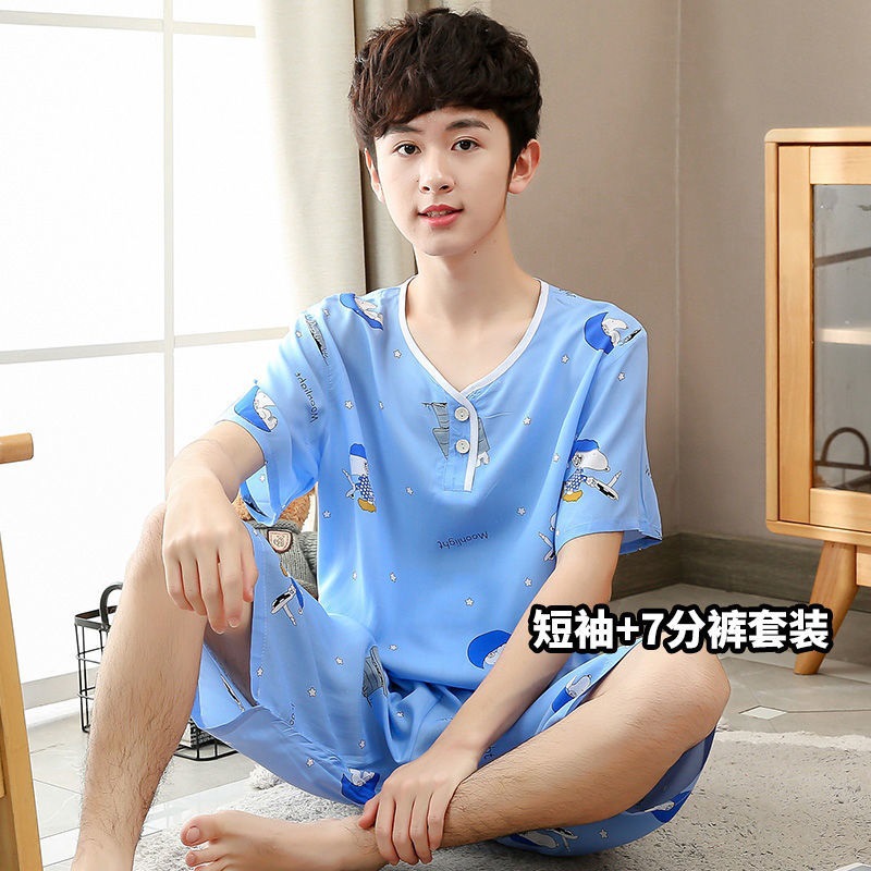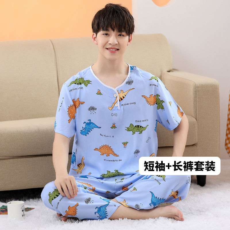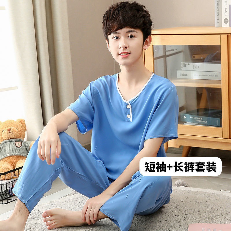 남자를위한 코튼 실크 잠옷 큰 소년과 소년을위한 여름 얇은 스타일 긴 소매 코튼 실크 세트 청소년 남성 홈 의류
