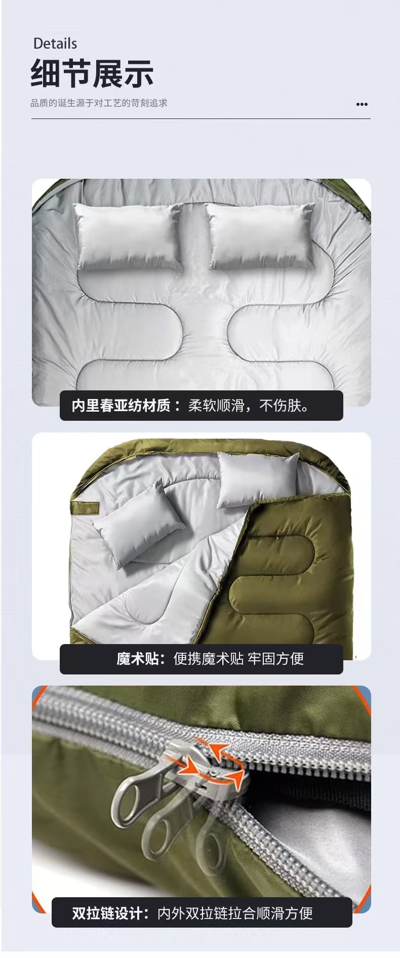 두 개의 봉투와 모자가 달린 성인용 침낭, 휴대용 이중 목적 방수 야외 여행 분리형 침낭, 사계절 캠핑 침낭스토어 가기