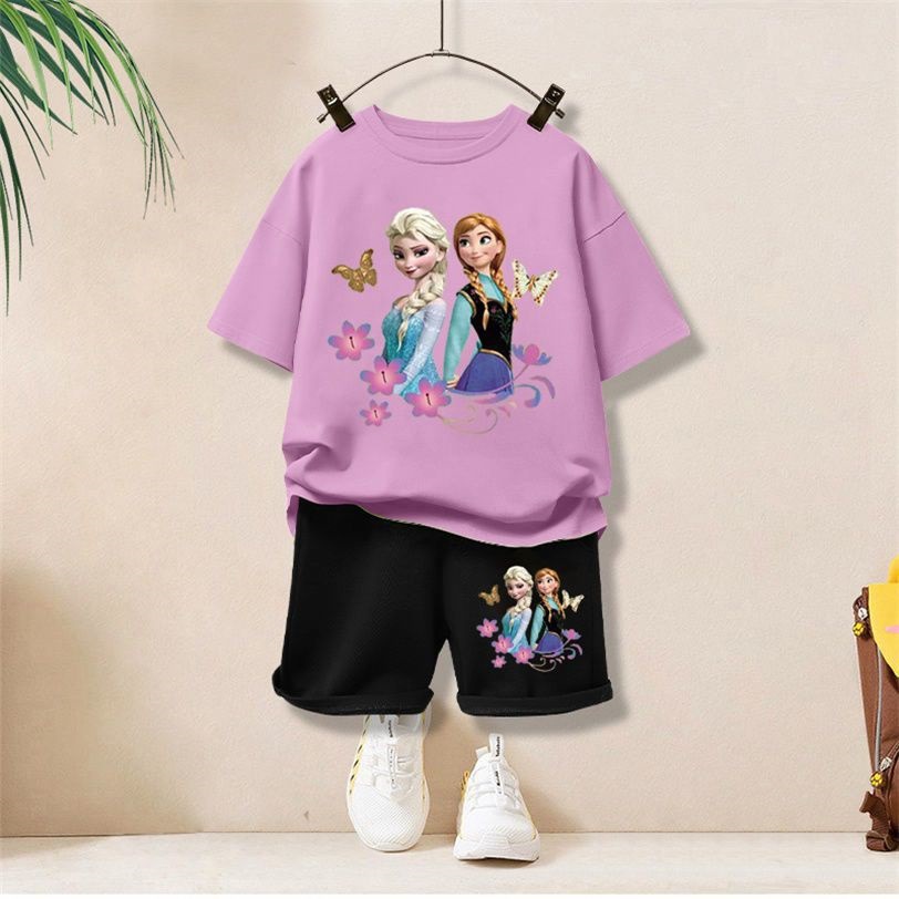 여자 스포츠 정장 2023 새로운 스타일 어린이 유행 반팔 티셔츠 만화 아동 의류 여름 어린이