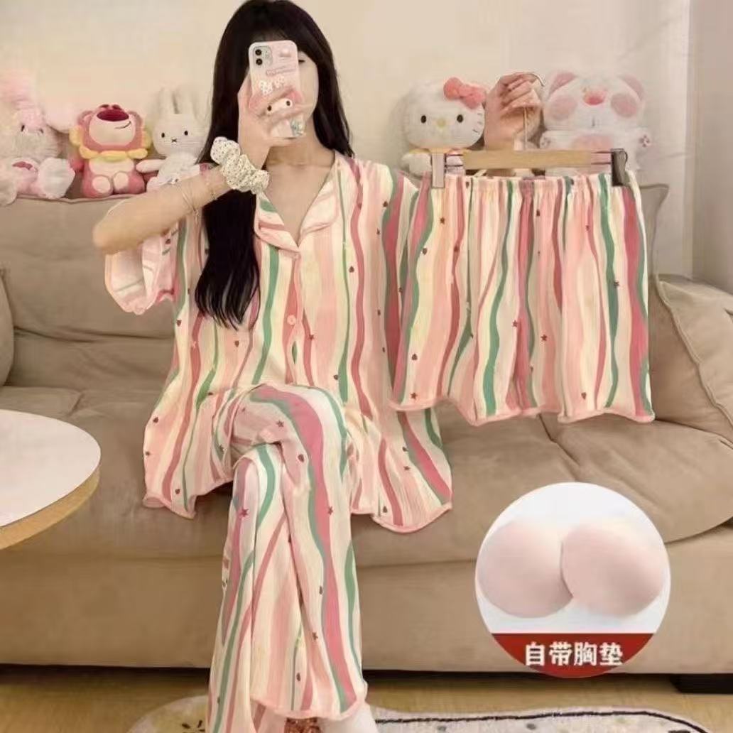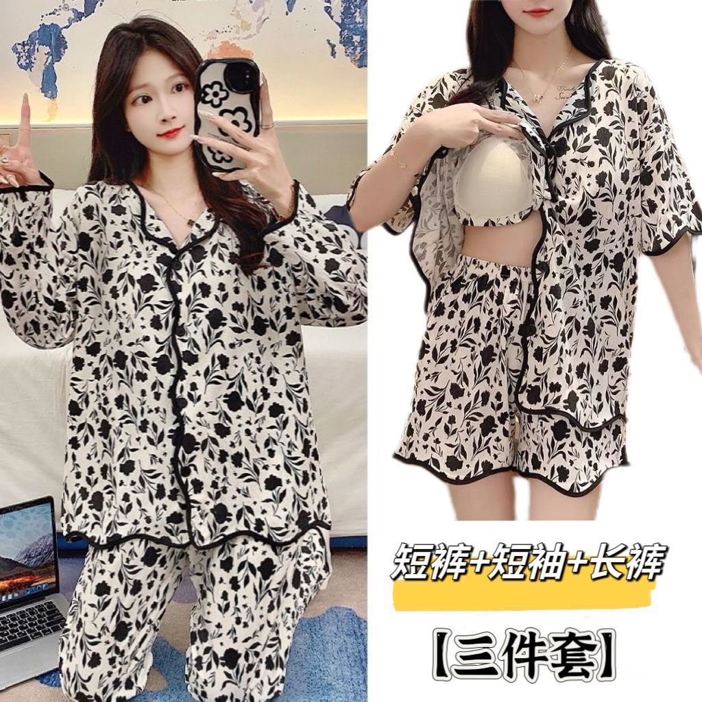 2025 폭발적인 3 피스 세트 가슴 패드 잠옷 여성 여름 얇은 반팔 여성 홈웨어 Sleepwear