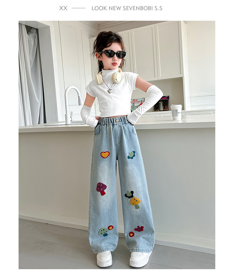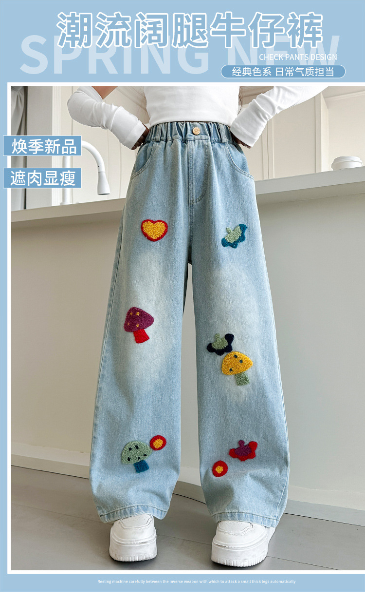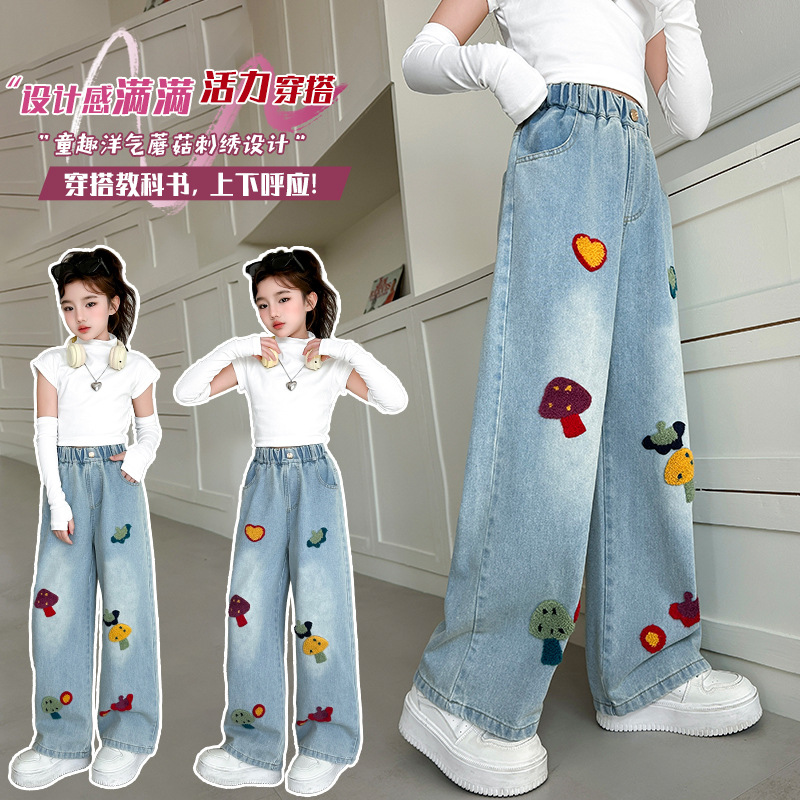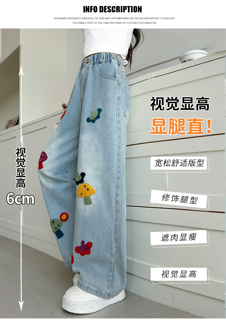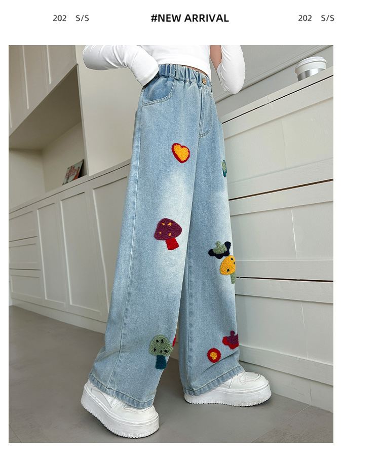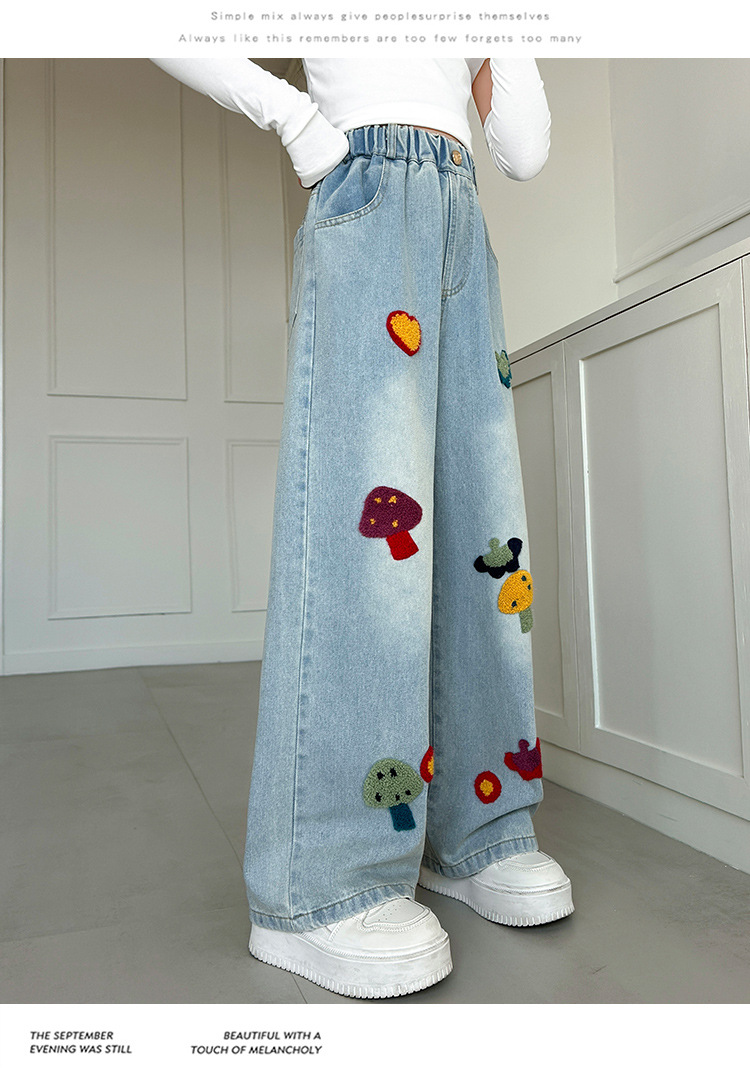 2025 새로운 봄, 가을 느슨한 청바지 한국 스타일 소녀 스트레이트 캐주얼 학생 버섯 수건 수 놓은 와이드 레그 바지