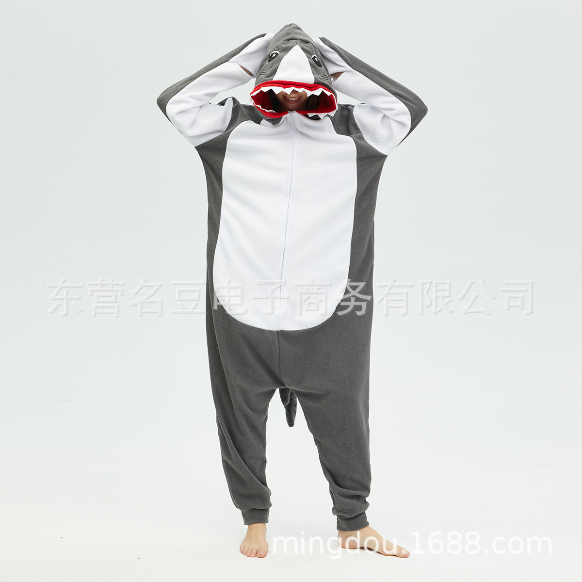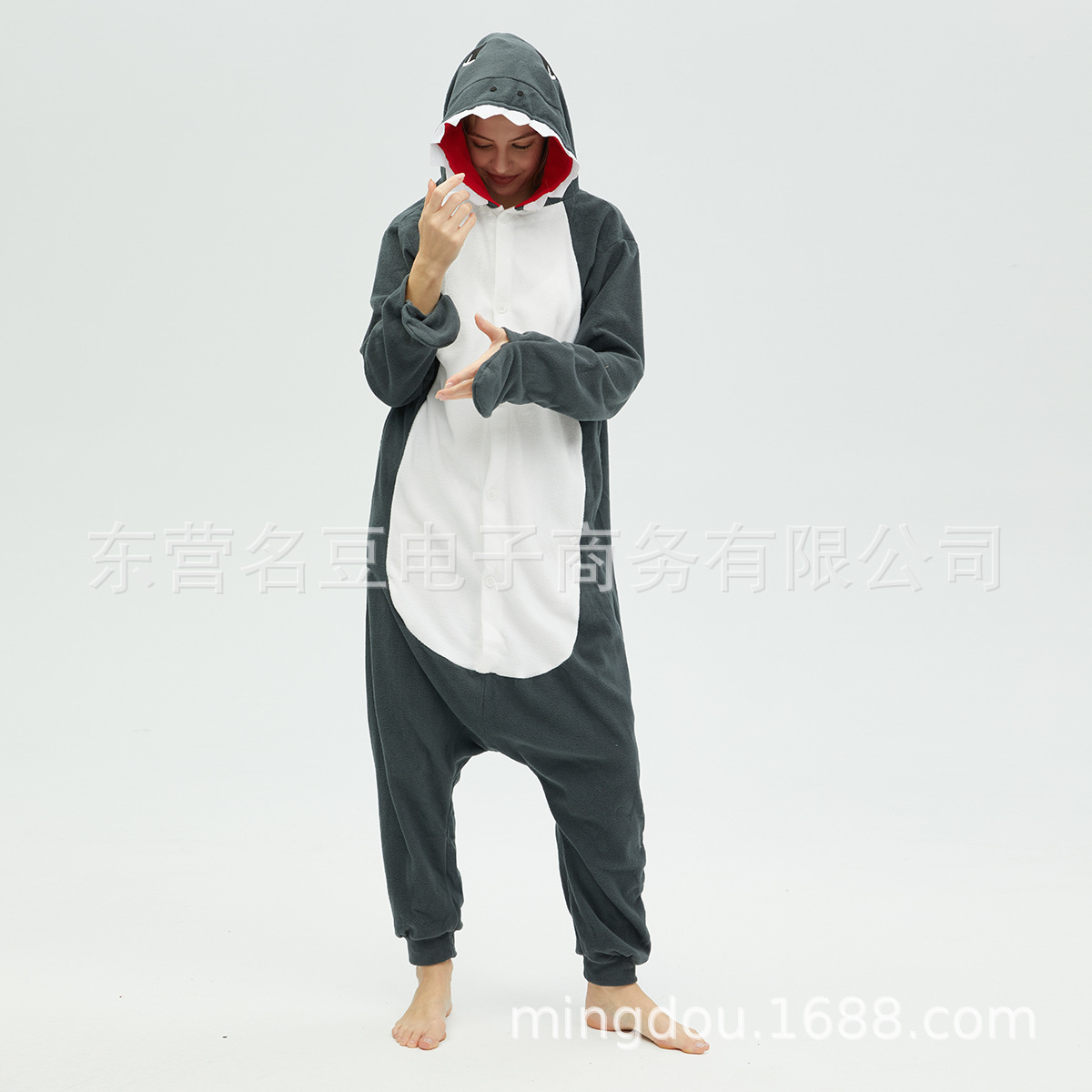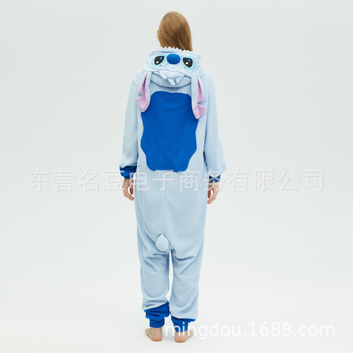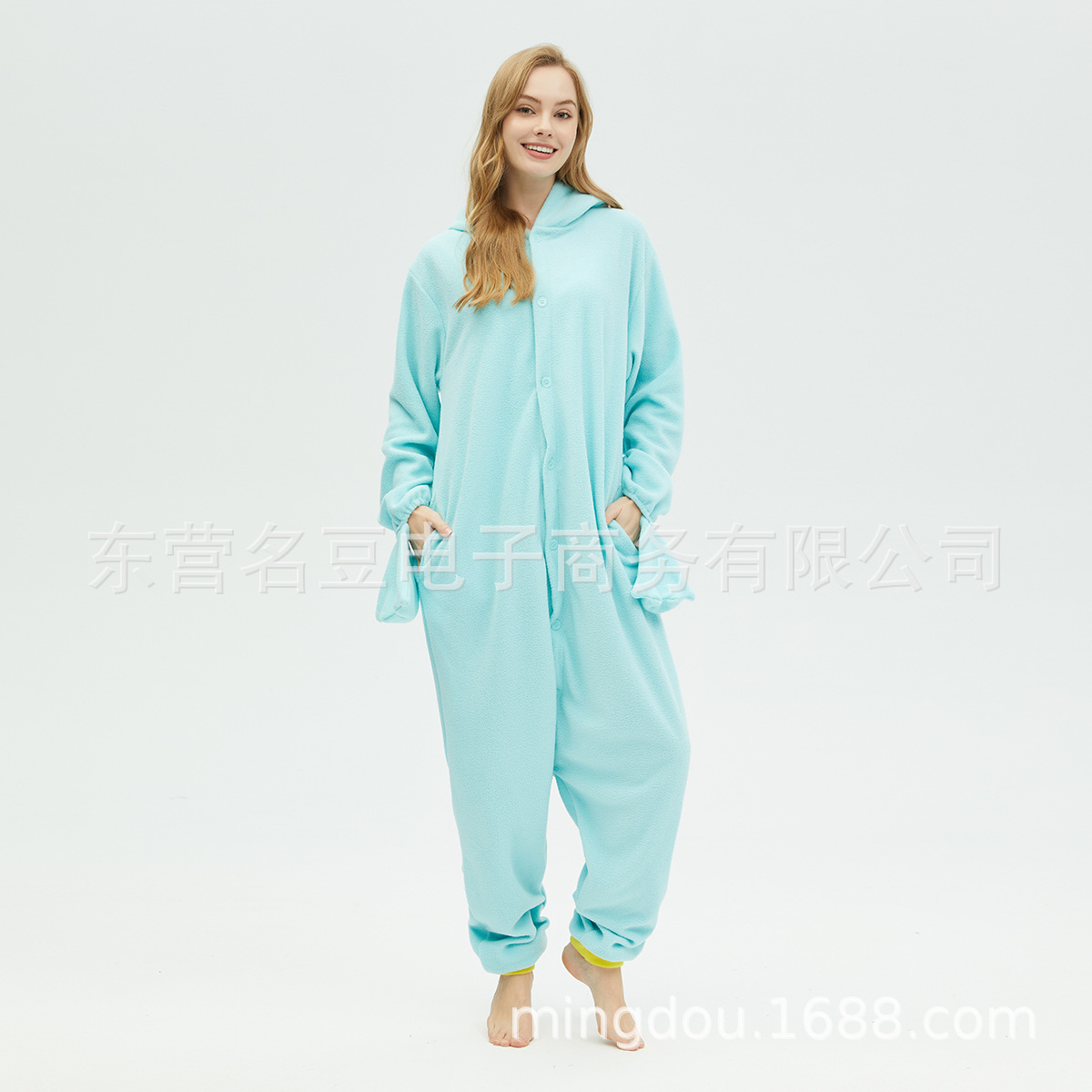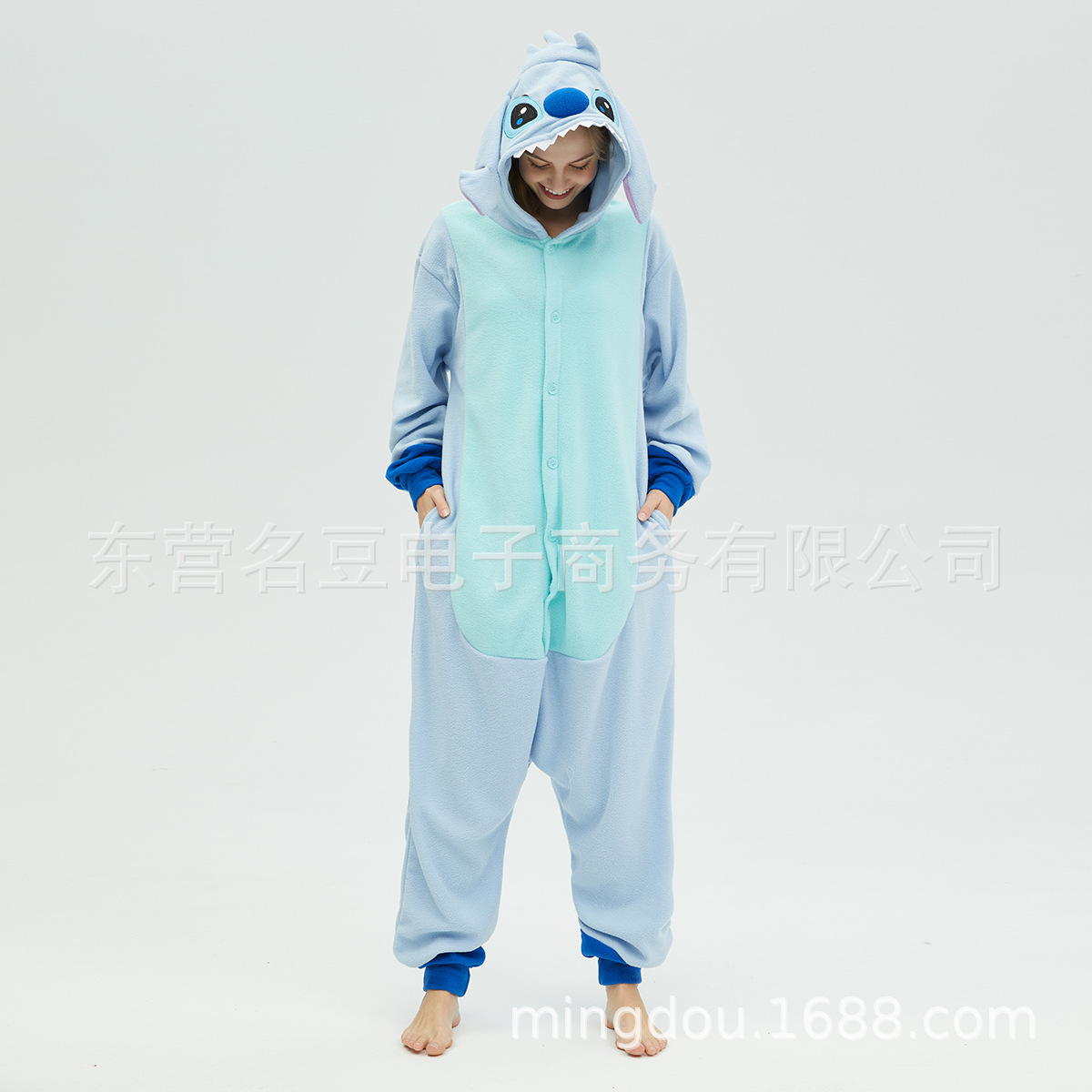 대외 무역 인기 스티치 만화 원피스 잠옷 폴라 플리스 상어 긴팔 커플 잠옷 성인 가정복스토어 가기