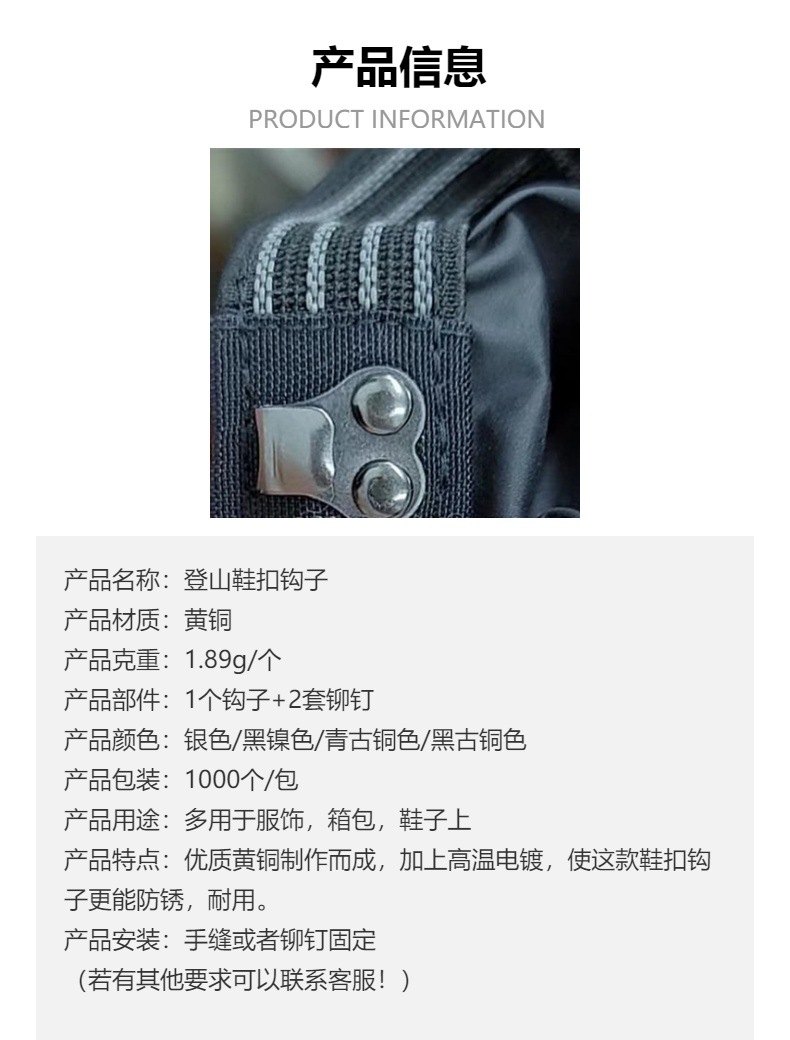 공장에서 공급하는 하드웨어 녹 방지 하이킹 신발 버클 후크, 노동 보호 신발, 리벳이 있는 구리 버클, 고정 가방 링크 후크스토어 가기