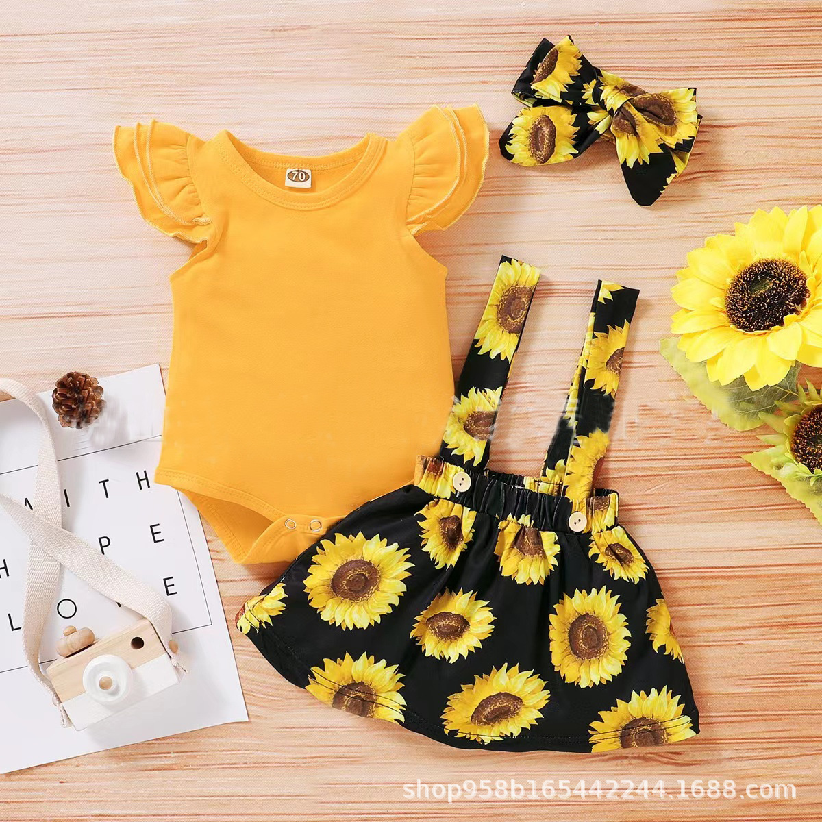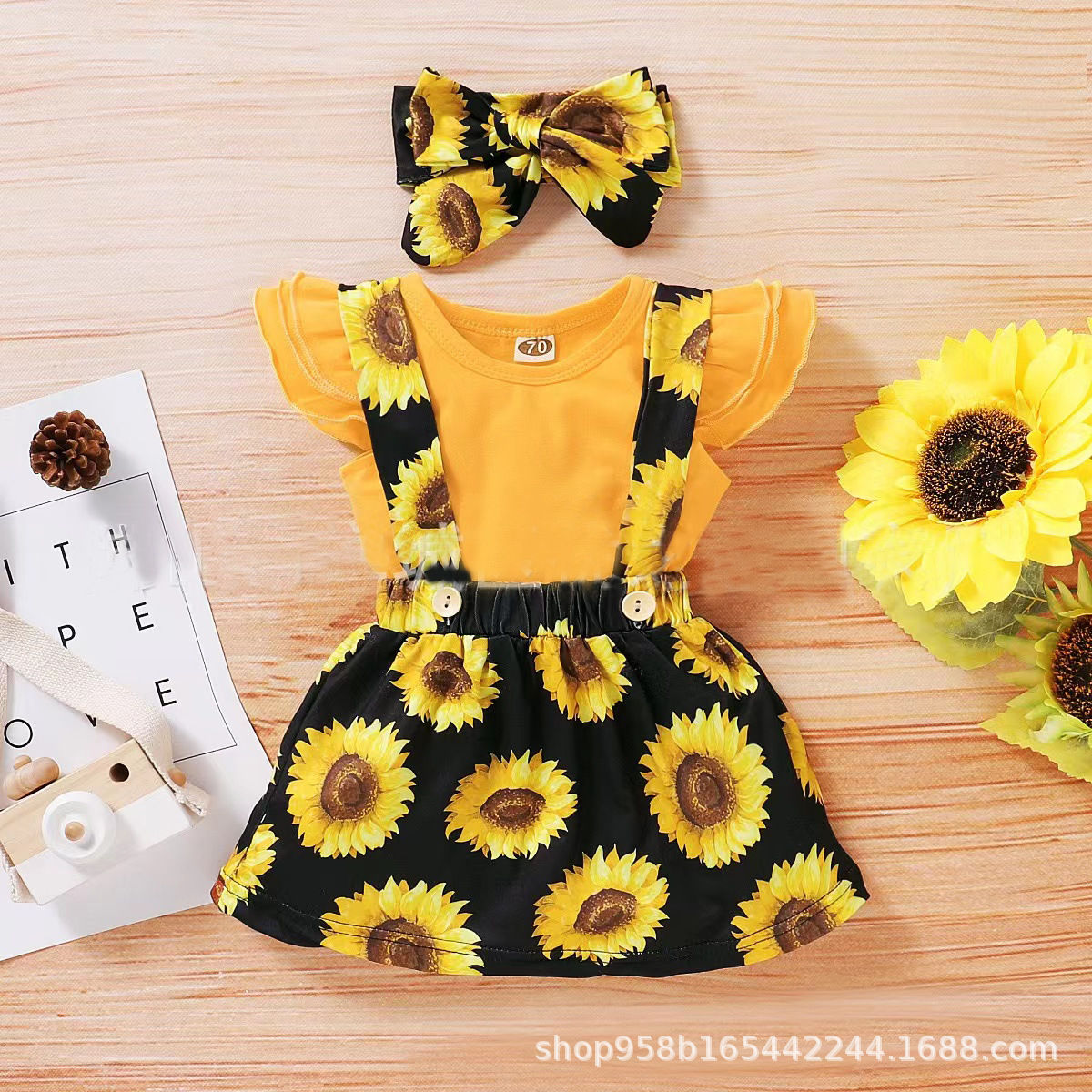 Ins 유아 쉬폰 보우 세트 해바라기 머리띠 아기 서스펜더 스커트 투피스 세트 도매 하렘 아우터스토어 가기
