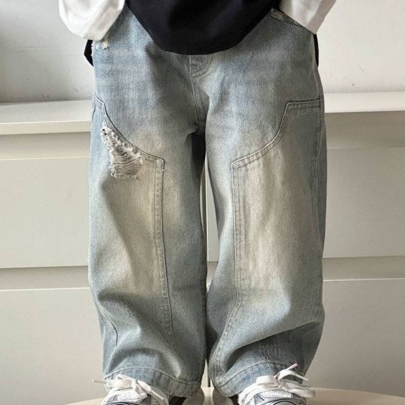 소년 청바지 2025 봄과 가을 새로운 어린이 복고풍 바느질 넓은 다리 바지 잘 생긴 유행 유행 유행 유행 외주스토어 가기