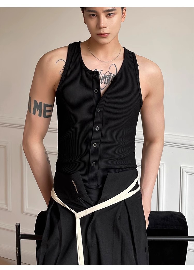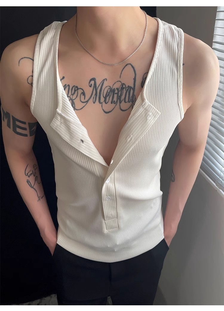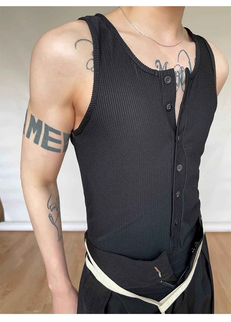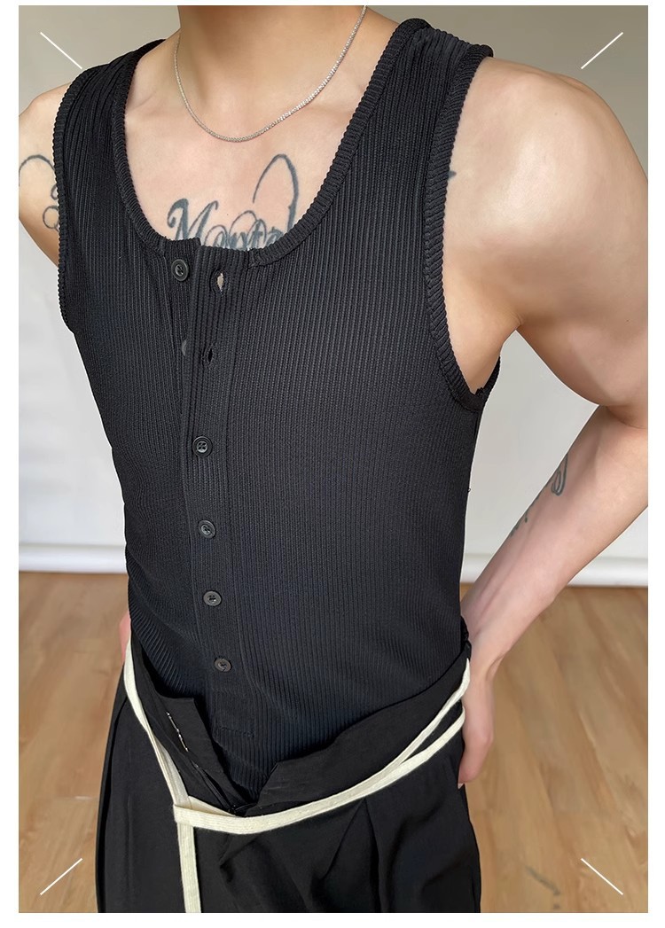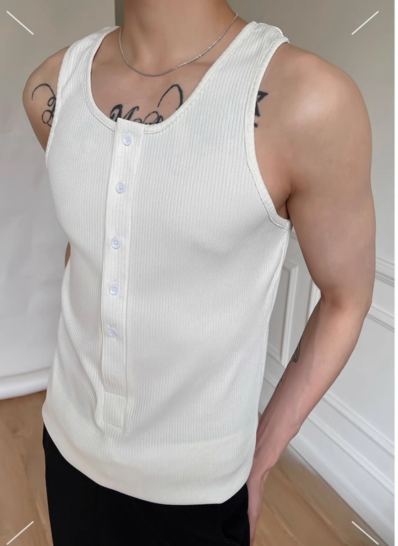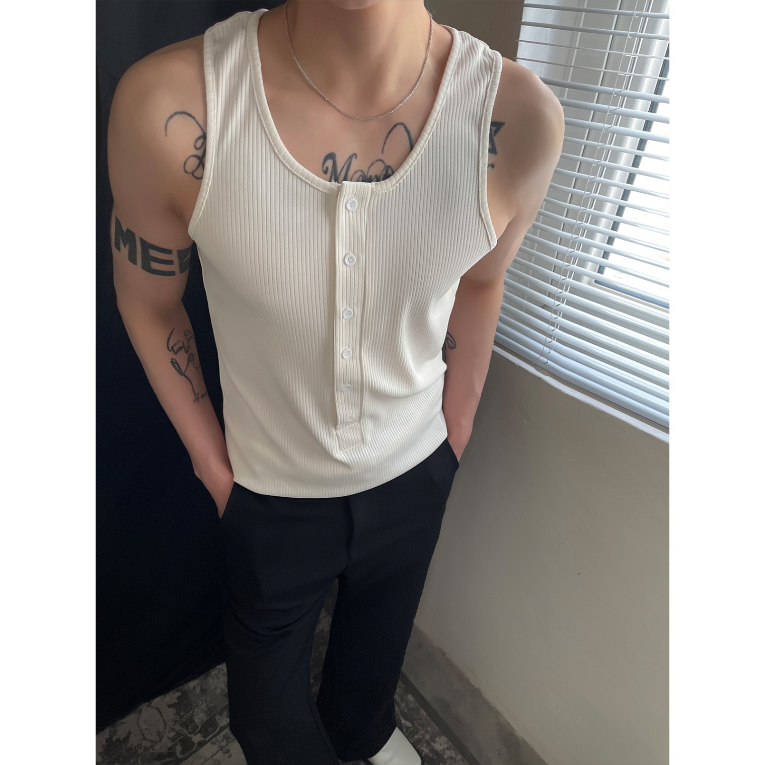 여름 맞춤형 남성 타이트 조끼 한국 버튼 디자인 민소매 남성 조끼 솔리드 컬러 니트 스웨트 조끼 통기성스토어 가기