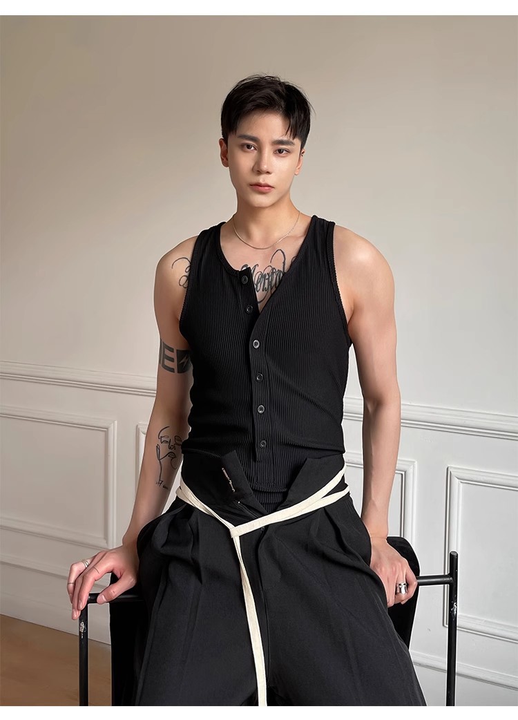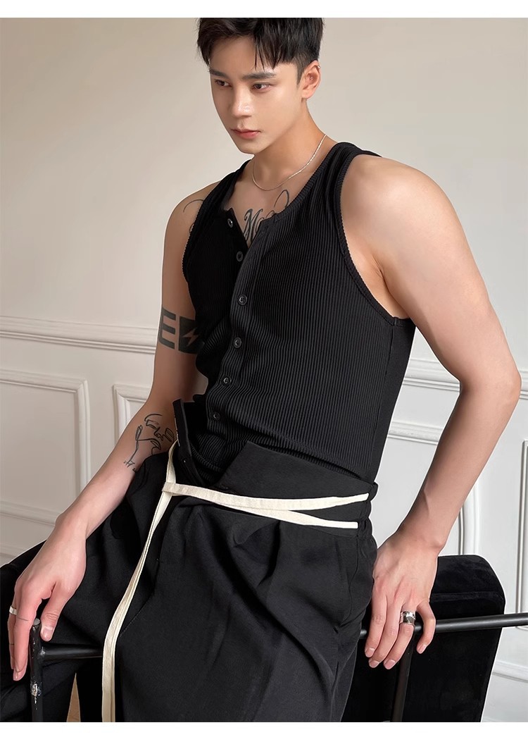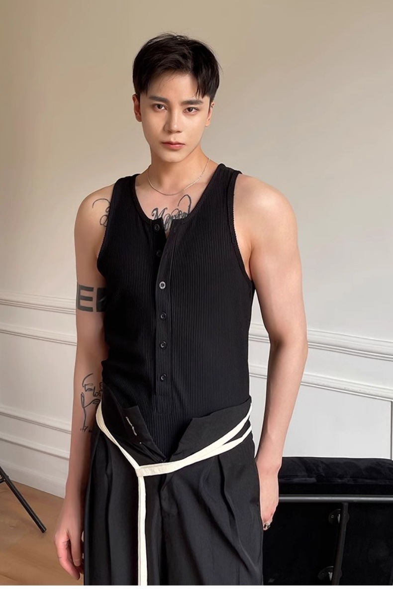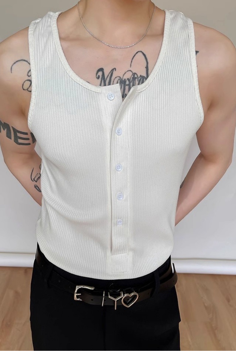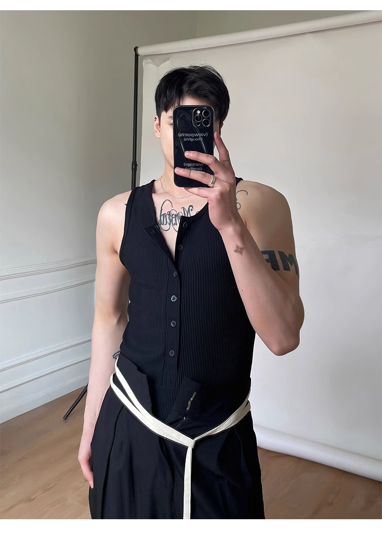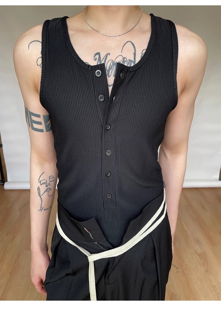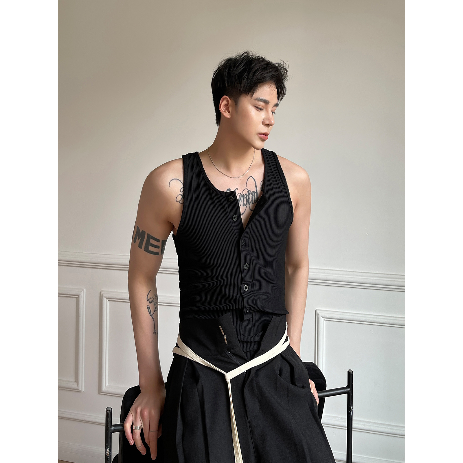 여름 맞춤형 남성 타이트 조끼 한국 버튼 디자인 민소매 남성 조끼 솔리드 컬러 니트 스웨트 조끼 통기성스토어 가기