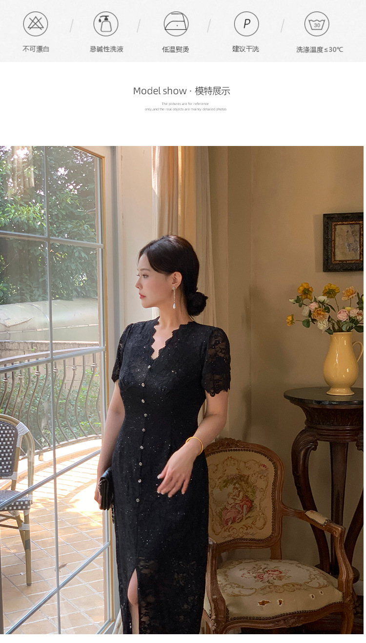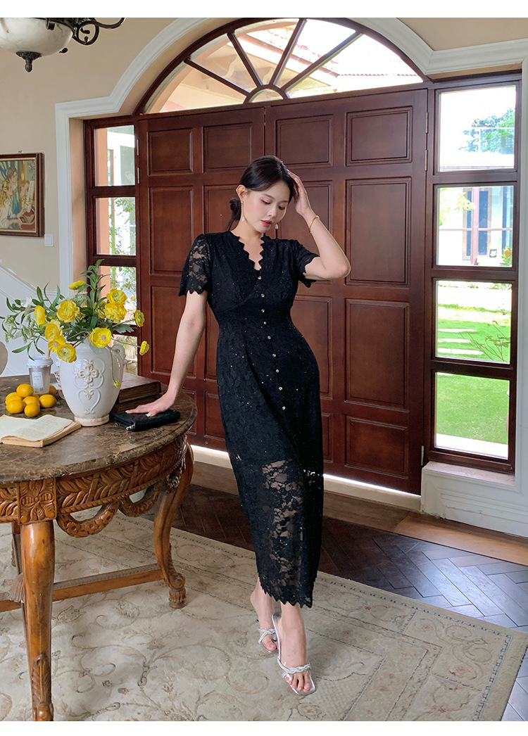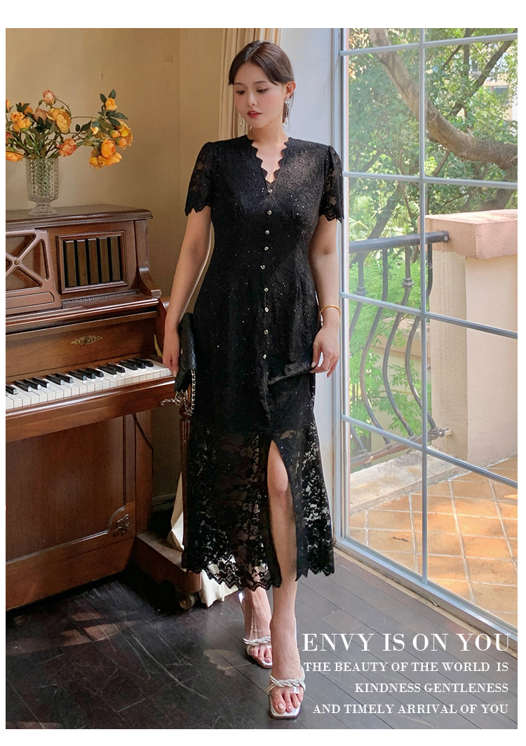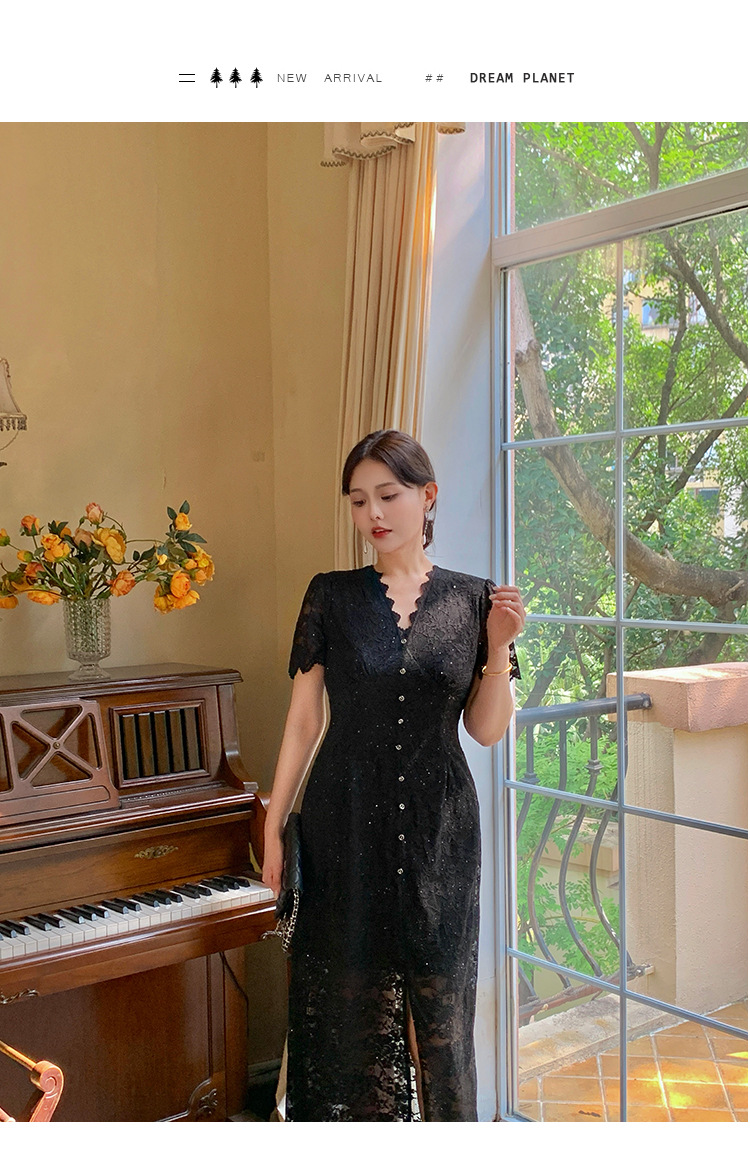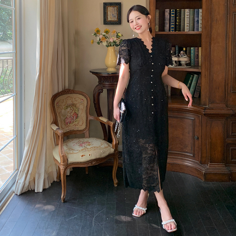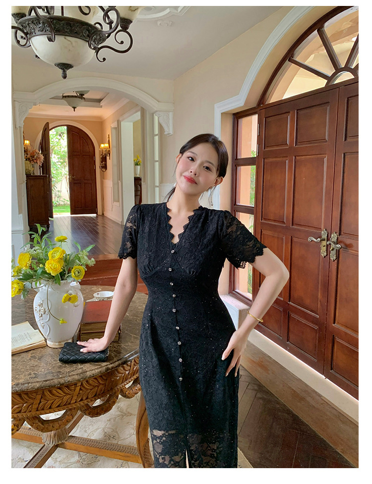 플러스 사이즈 여성의 하이 엔드 느낌 사교계 레이스 엉덩이 원피스 프랑스 섹시한 허리 원피스 2096