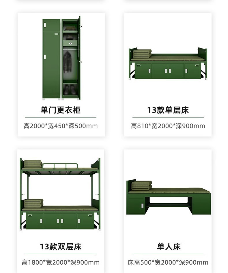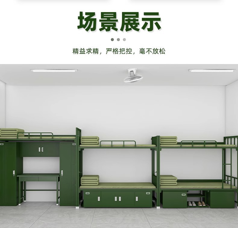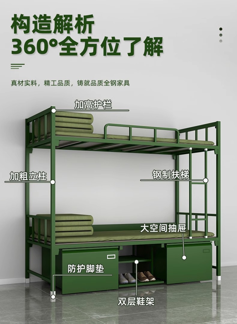 표준 조합 밀리터리 그린 침대 캐비닛 학교 기숙사 이층 침대 내부 캐비닛 학습 테이블과 의자 이층 철제 프레임 침대스토어 가기