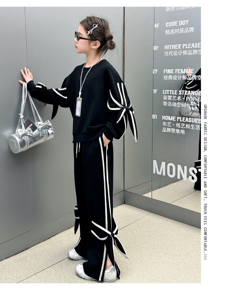 여자 스포츠 세트 2025 새로운 서양식 중대형 어린이 검은 활 땀 캐주얼 바지 리본 투피스 세트스토어 가기