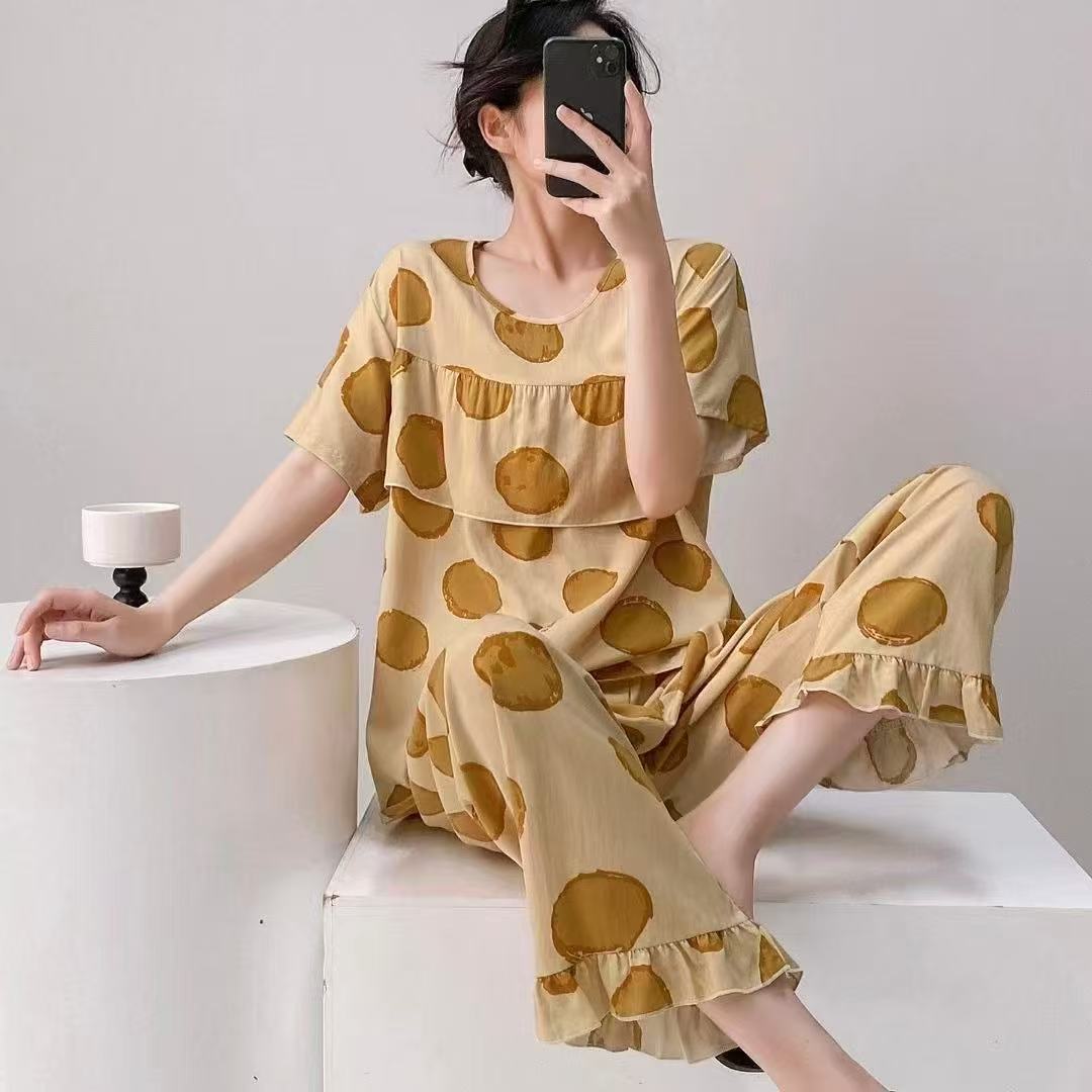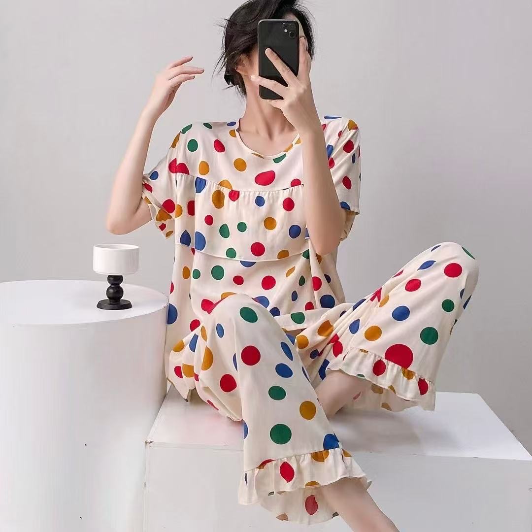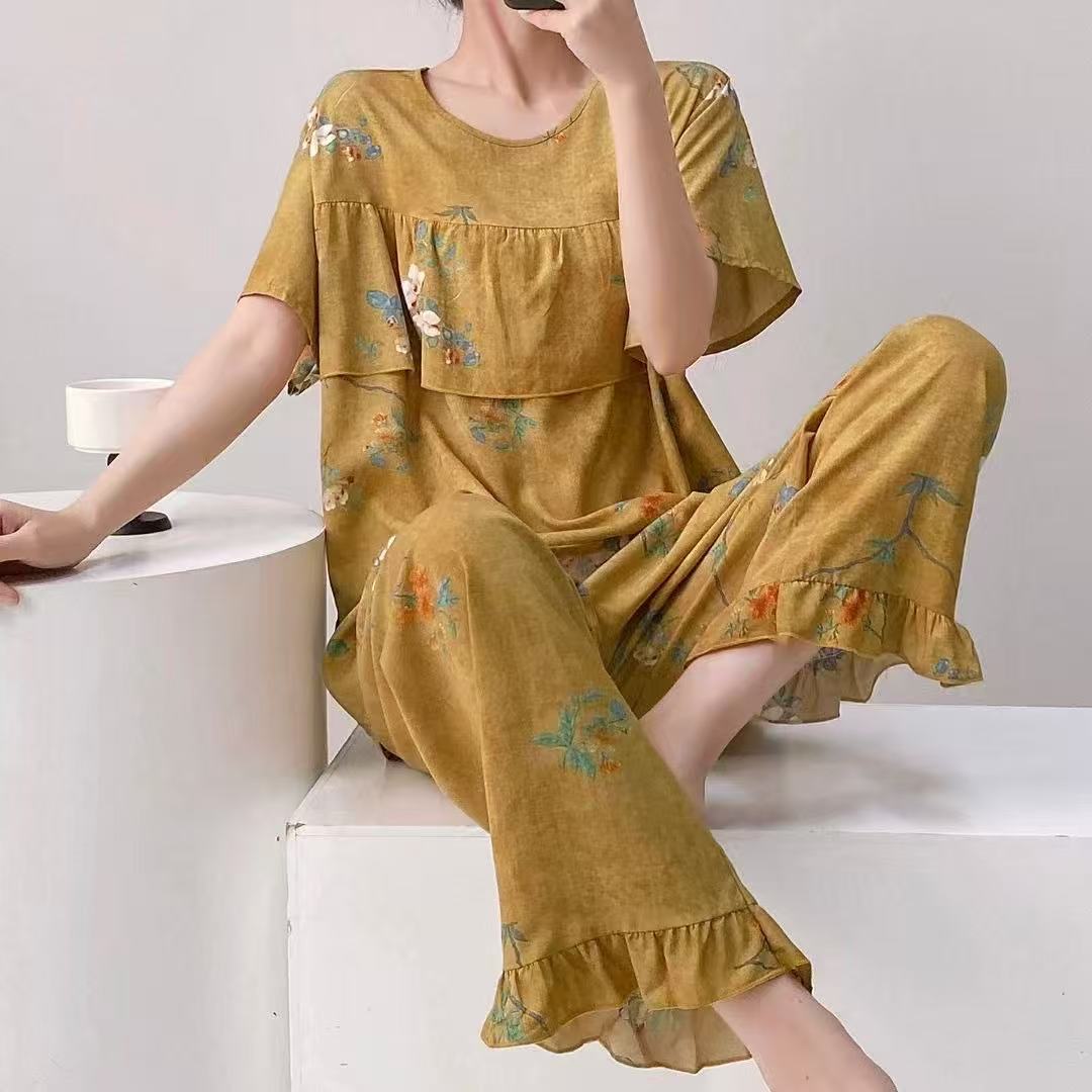 여성을위한 새로운 스타일 잠옷 여름 얇은 인쇄 반팔 바지 정장 코튼 실크 안티 볼록 대형 느슨한 홈웨어