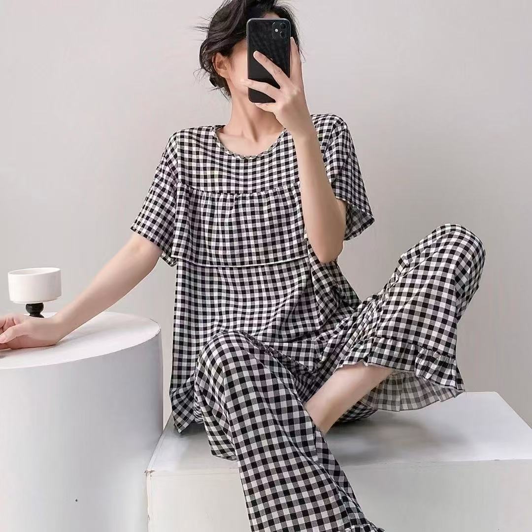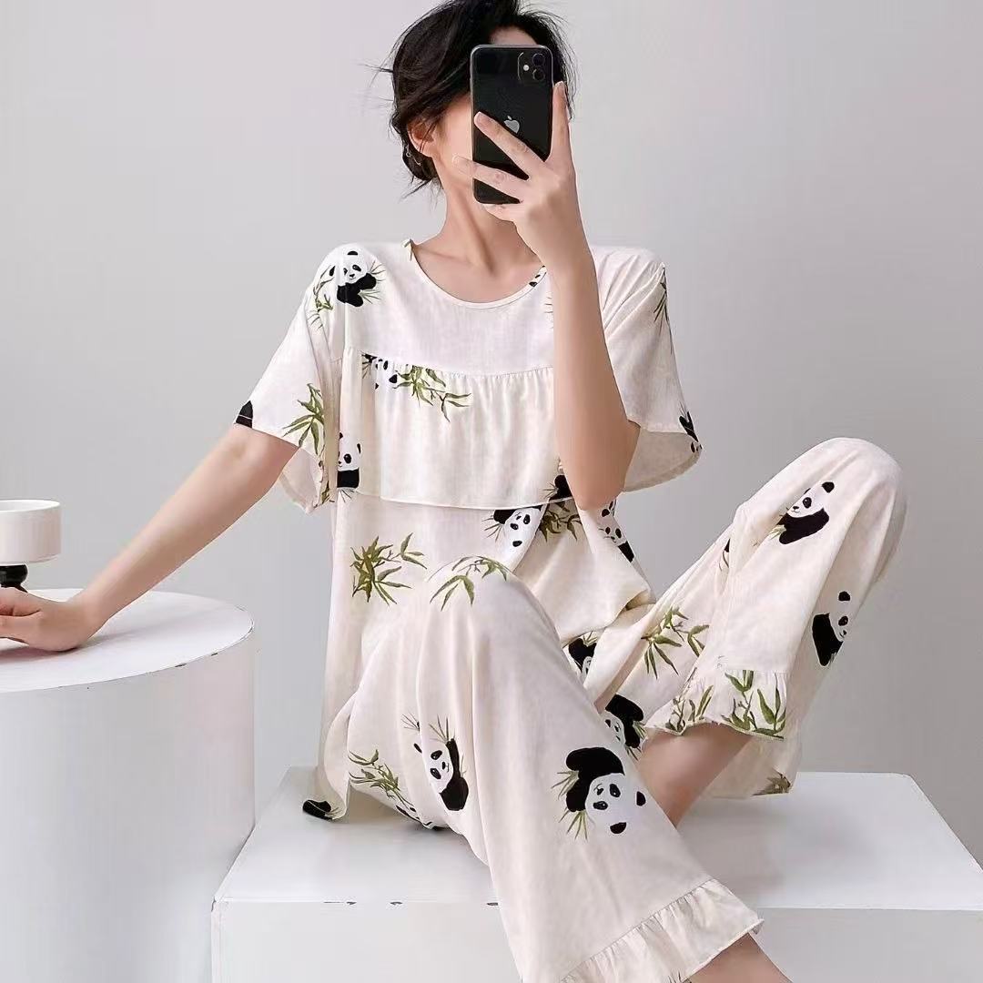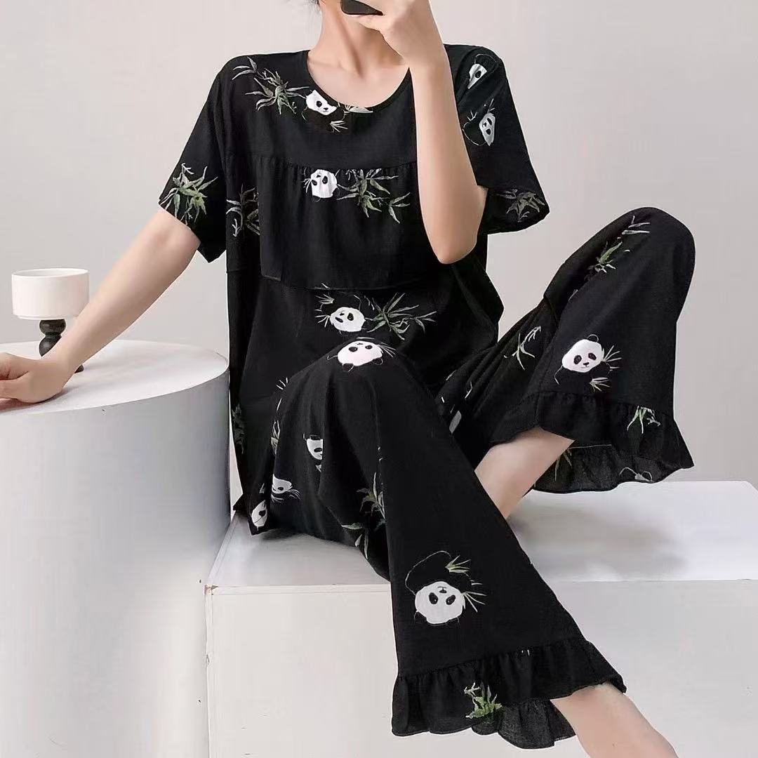 여성을위한 새로운 스타일 잠옷 여름 얇은 인쇄 반팔 바지 정장 코튼 실크 안티 볼록 대형 느슨한 홈웨어