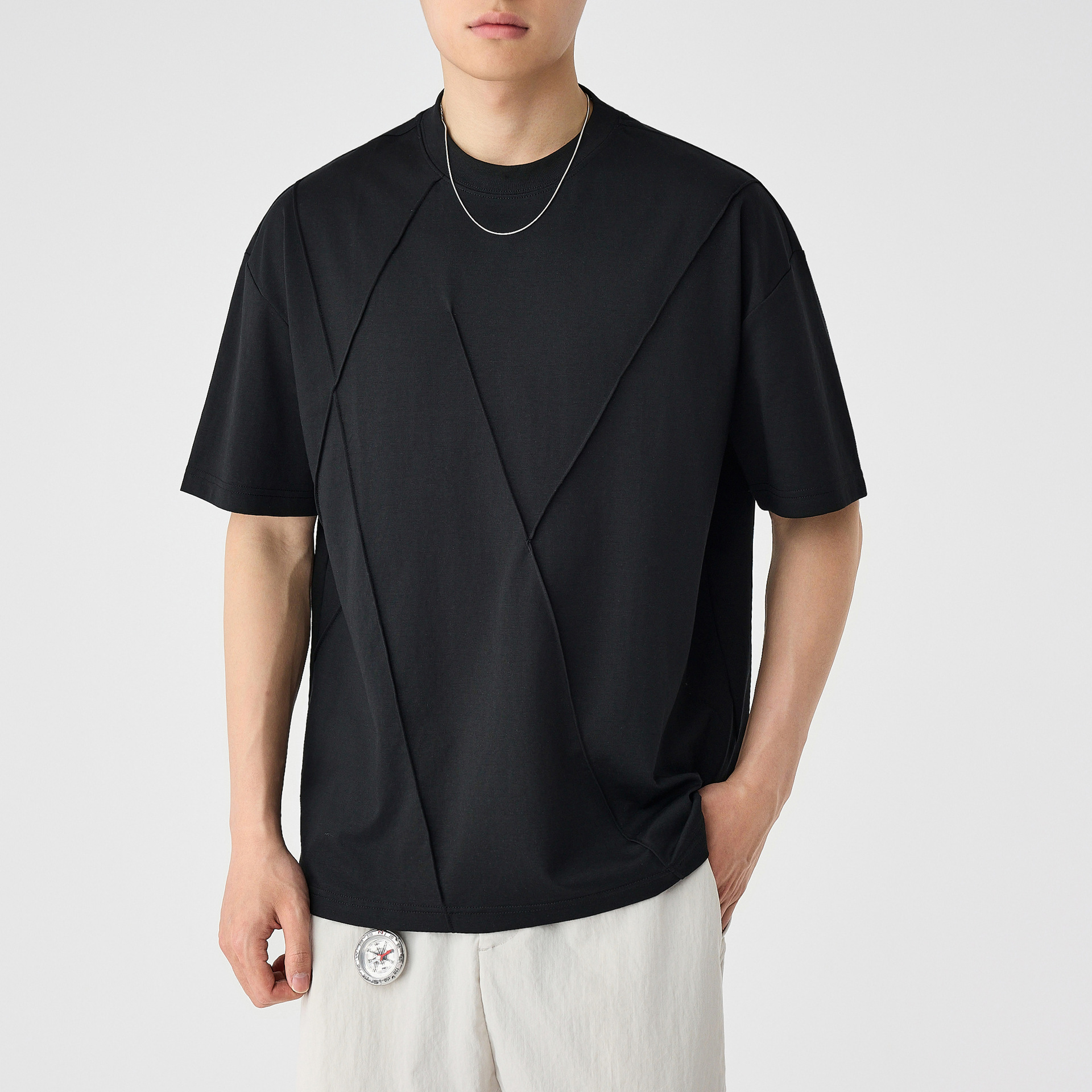 모마이크 남성 수제 주름 라운드넥 반팔 티셔츠 남성 2025 여름 신상 루즈핏 남성 티셔츠 71941스토어 가기