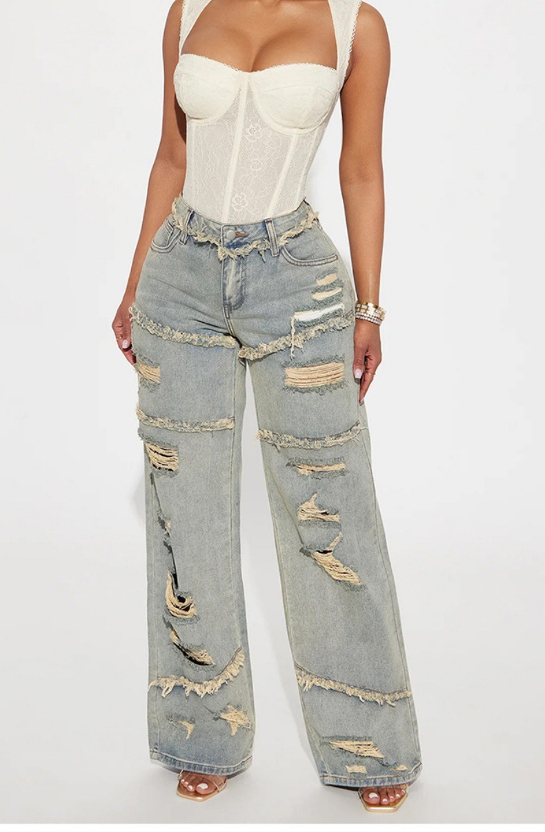 여성을위한 대외 무역 청바지 2025 새로운 핫 판매 유럽과 미국의 찢어진 와이드 팬츠 워시 패션 찢어진 청바지
