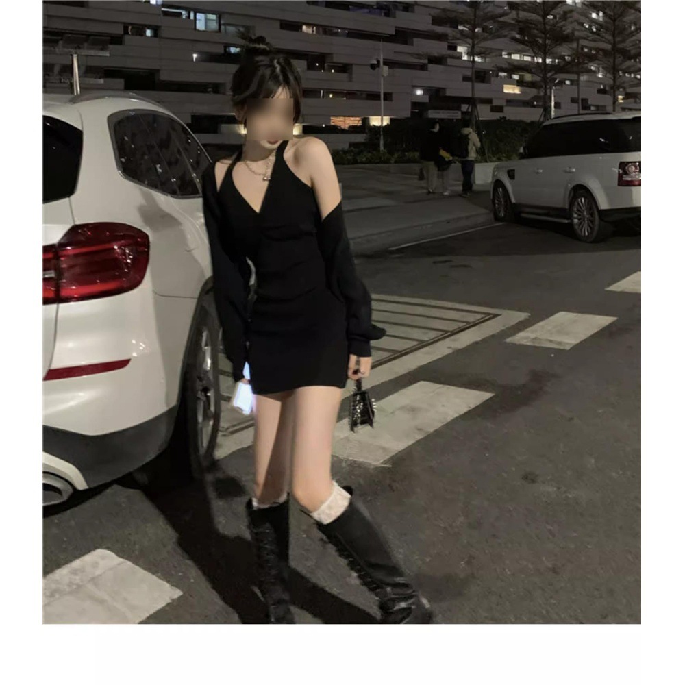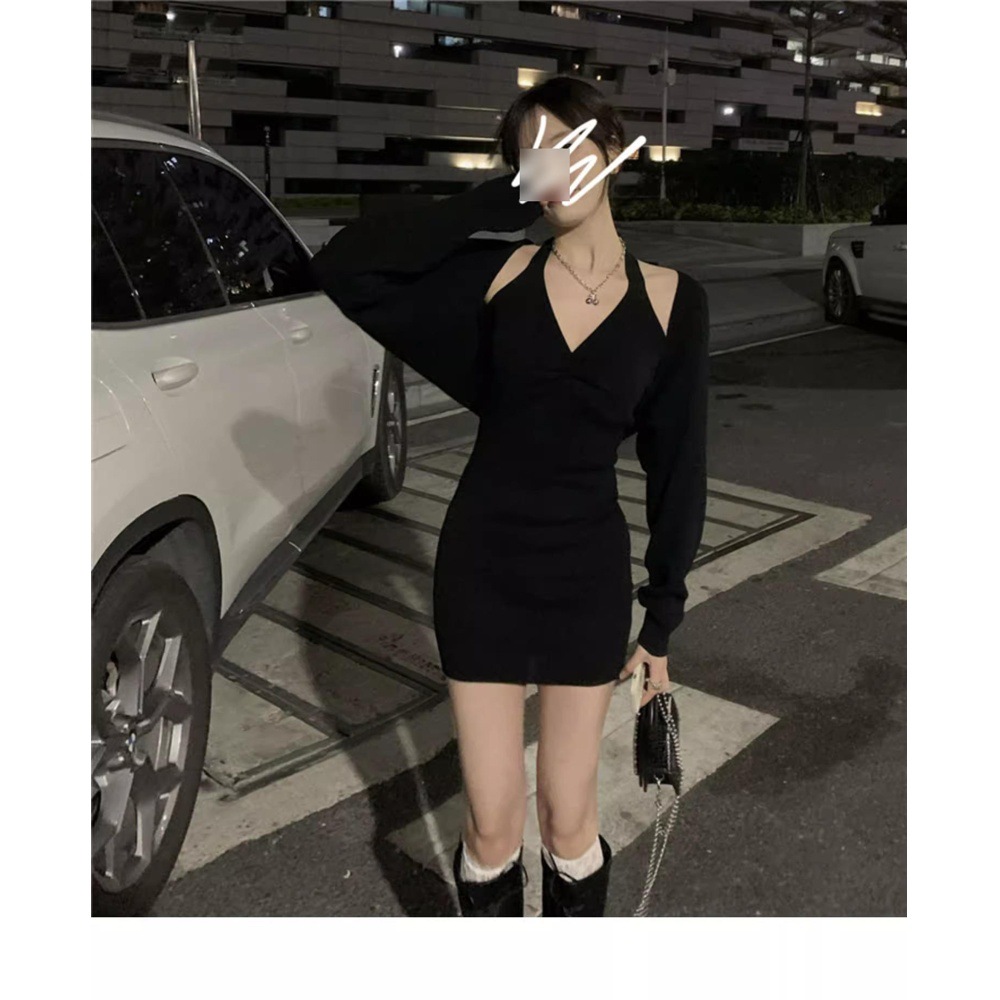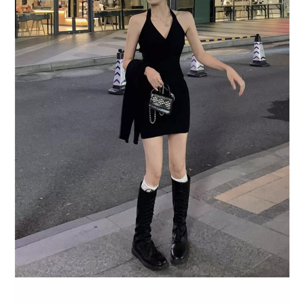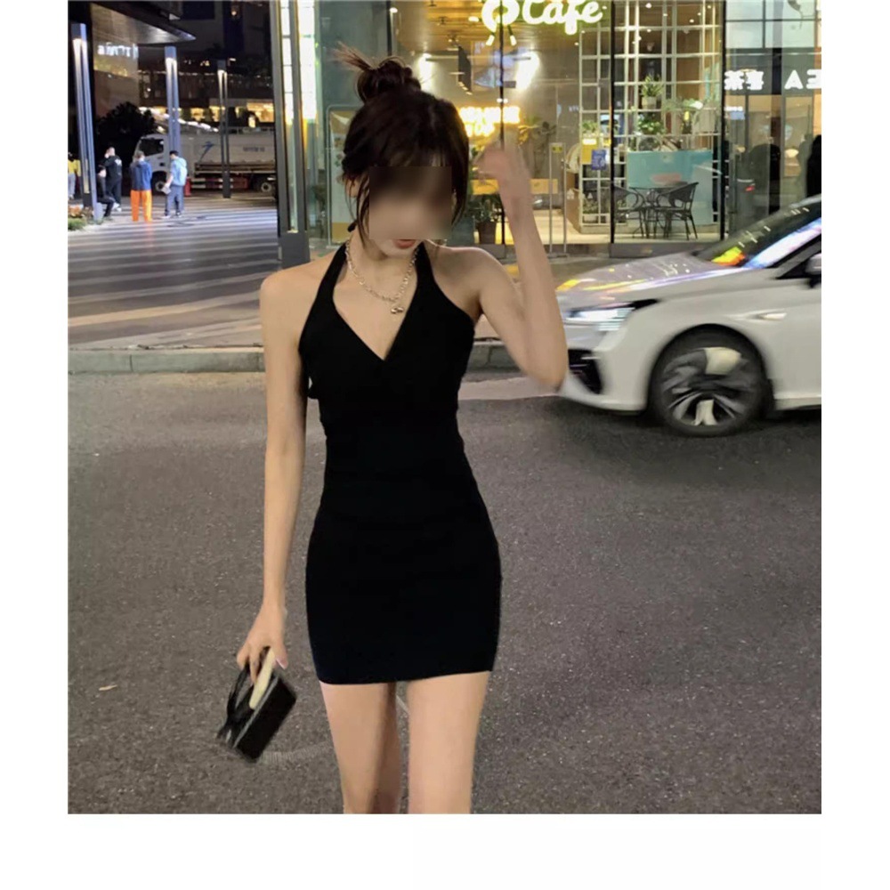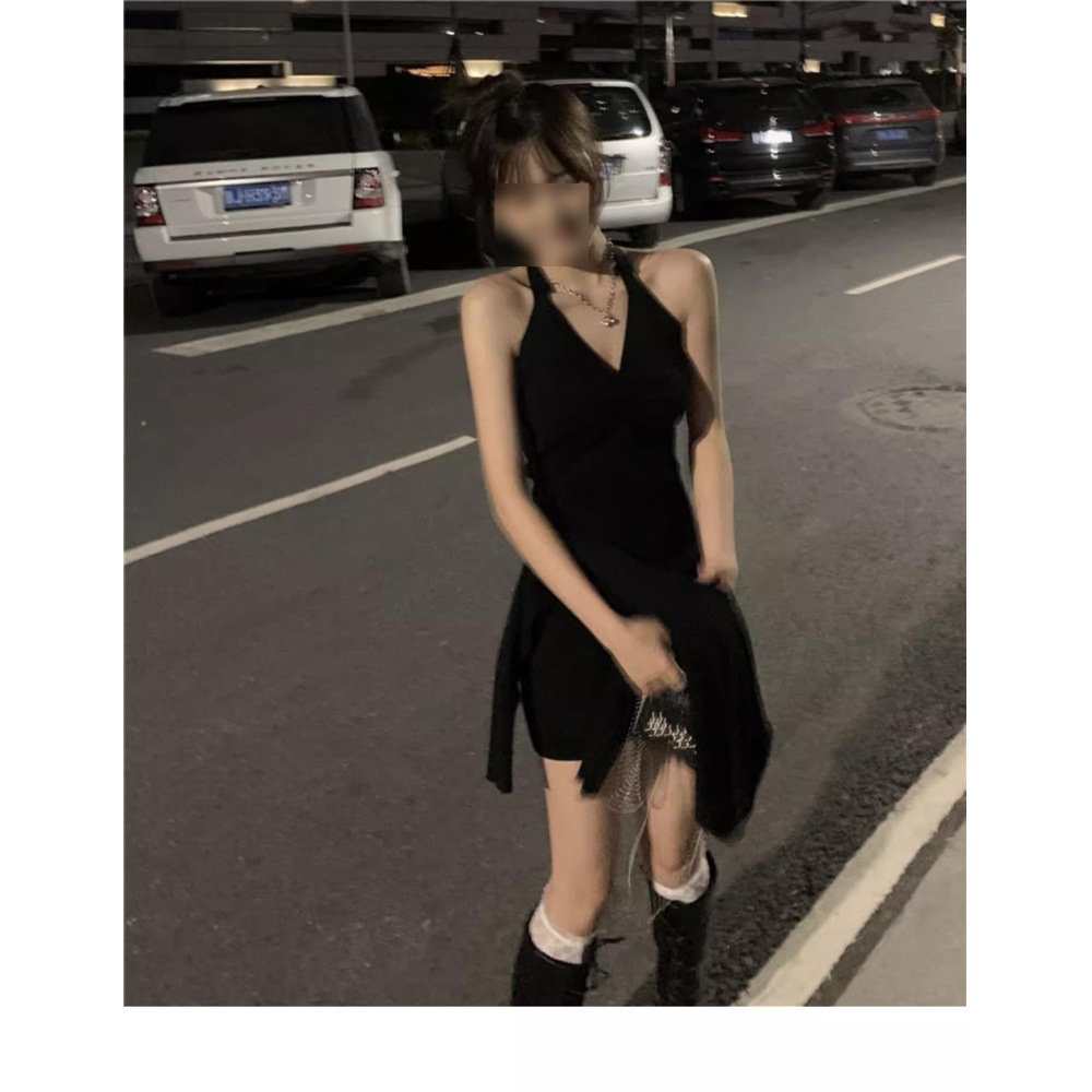 黑色辣妹2025挂脖吊带连衣裙女显瘦小众设计感v领小个子包臀短裙스토어 가기