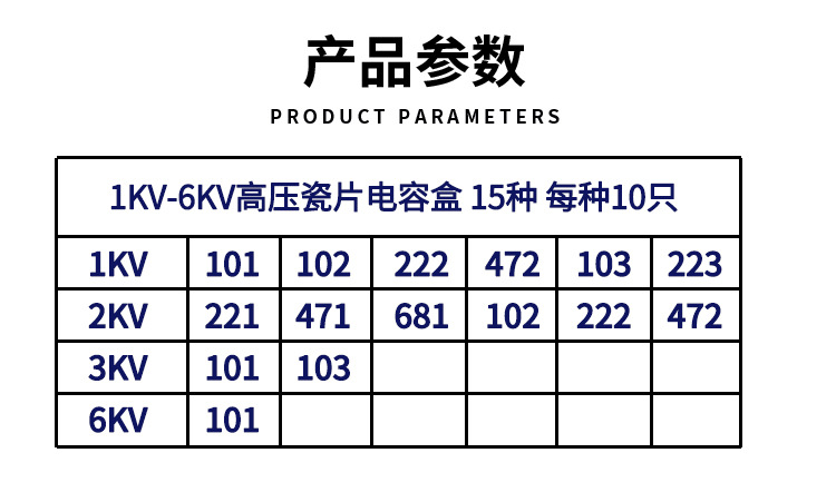 전자 부품 패키지 고전압 세라믹 칩 커패시터 패키지 상자 15가지 일반적으로 사용되는 종류 총 150개 1/2/3/6KV101