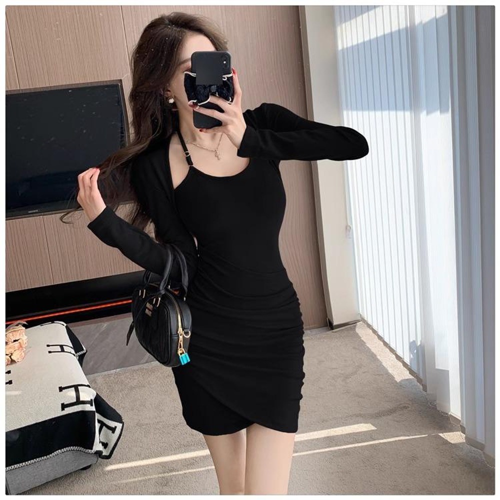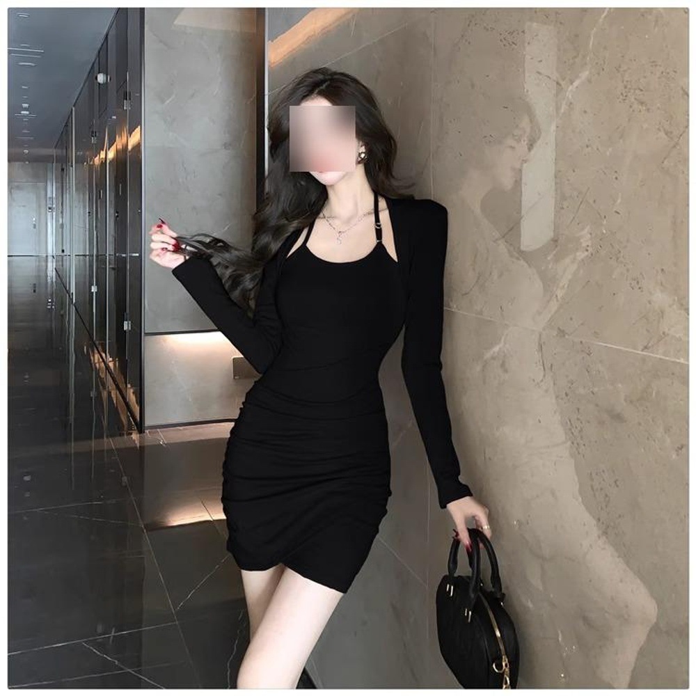 가을 겨울 여성을 위한 크리스마스 레드 홀터넥 드레스, 핫한 소녀 기질, 엉덩이를 덮는 짧은 스커트, 페이크 투피스 이너 스커트스토어 가기