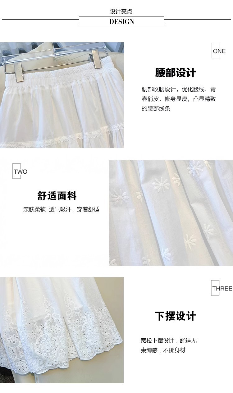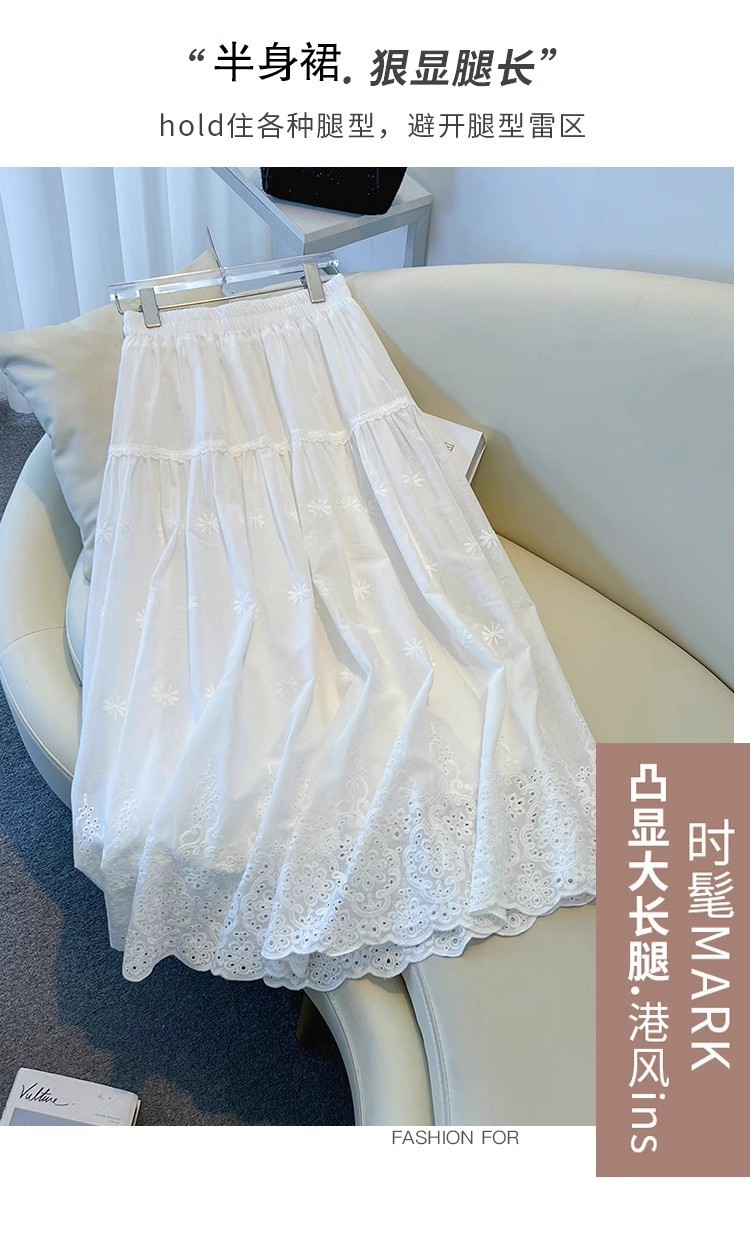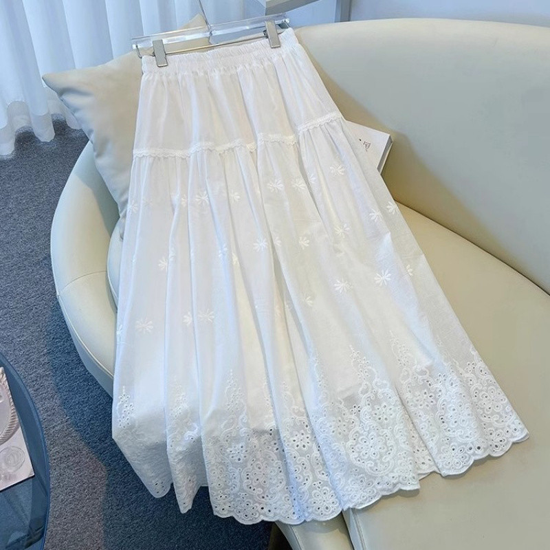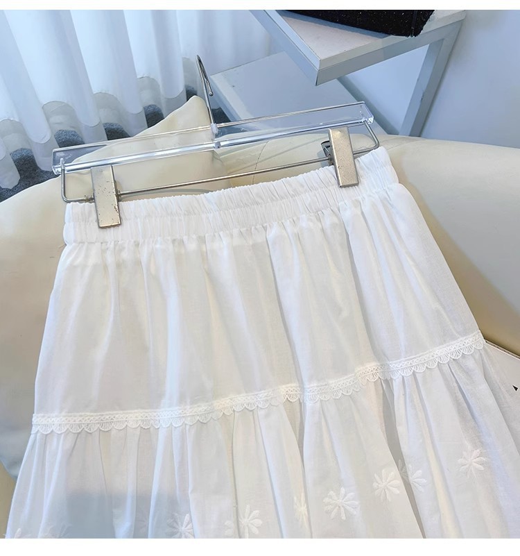 중대형 어린이용 흰색 스커트, 여아용 패셔너블한 롱 스커트, 봄 여름 중간 길이의 달콤한 중공 자수 레이스 스커트