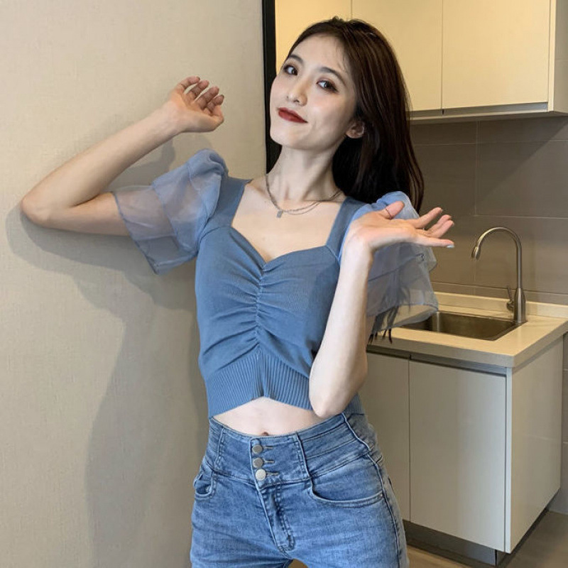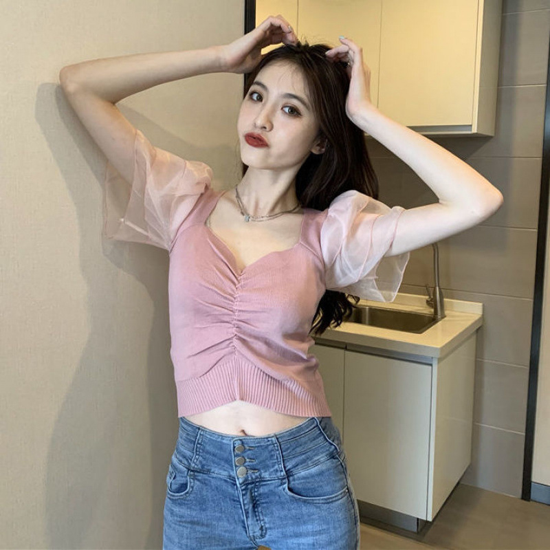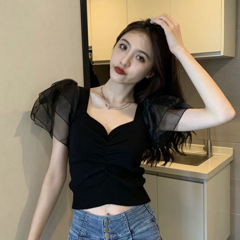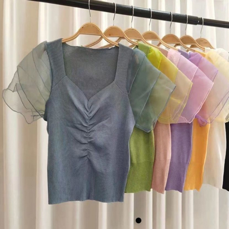 프랑스 레트로 반팔 스웨터 티셔츠 여성 여름 새로운 디자인 센스 메쉬 스티칭 플라잉 슬리브 쇼트 탑