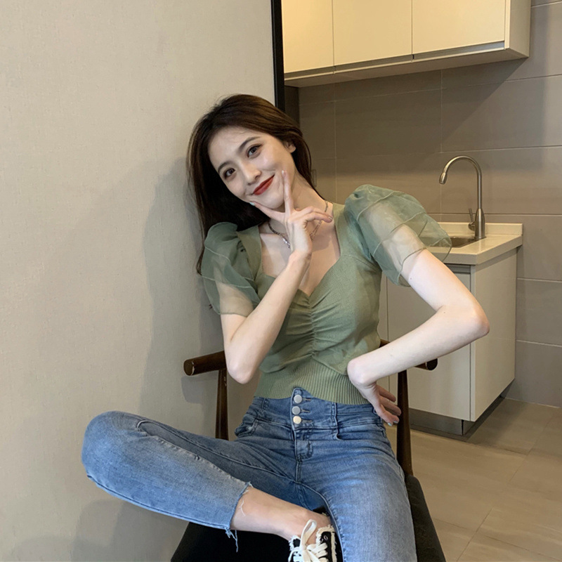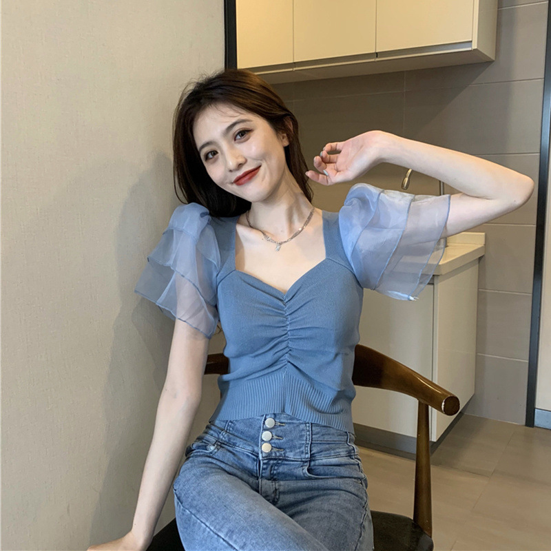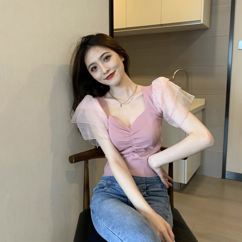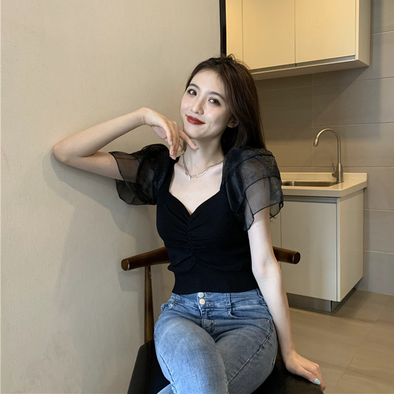 프랑스 레트로 반팔 스웨터 티셔츠 여성 여름 새로운 디자인 센스 메쉬 스티칭 플라잉 슬리브 쇼트 탑