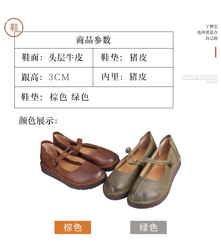 1층 소가죽 핸드메이드 레트로 가죽 여성화, 라운드 투, 에스닉 스타일 버클, 원라인 메리제인 펌프스