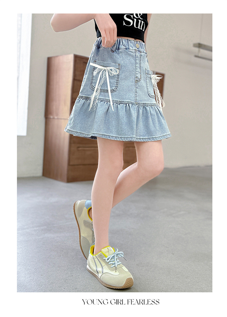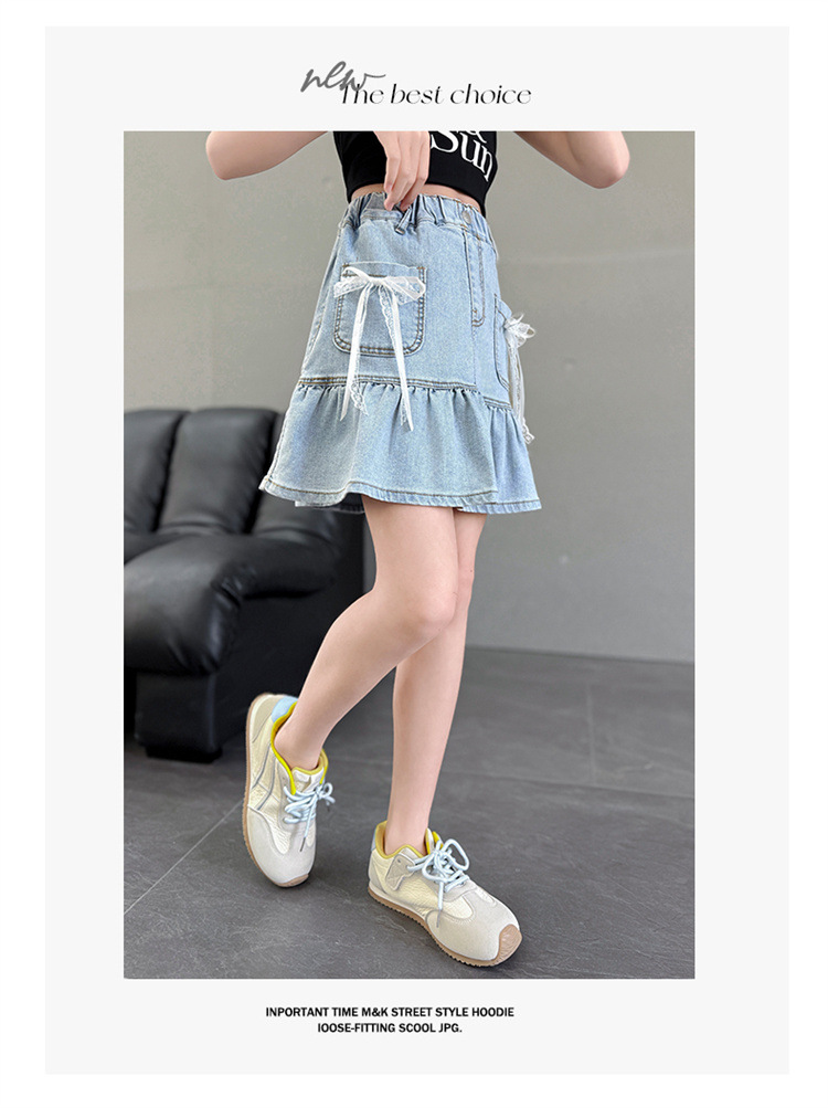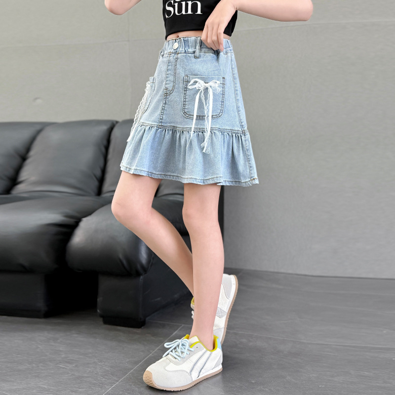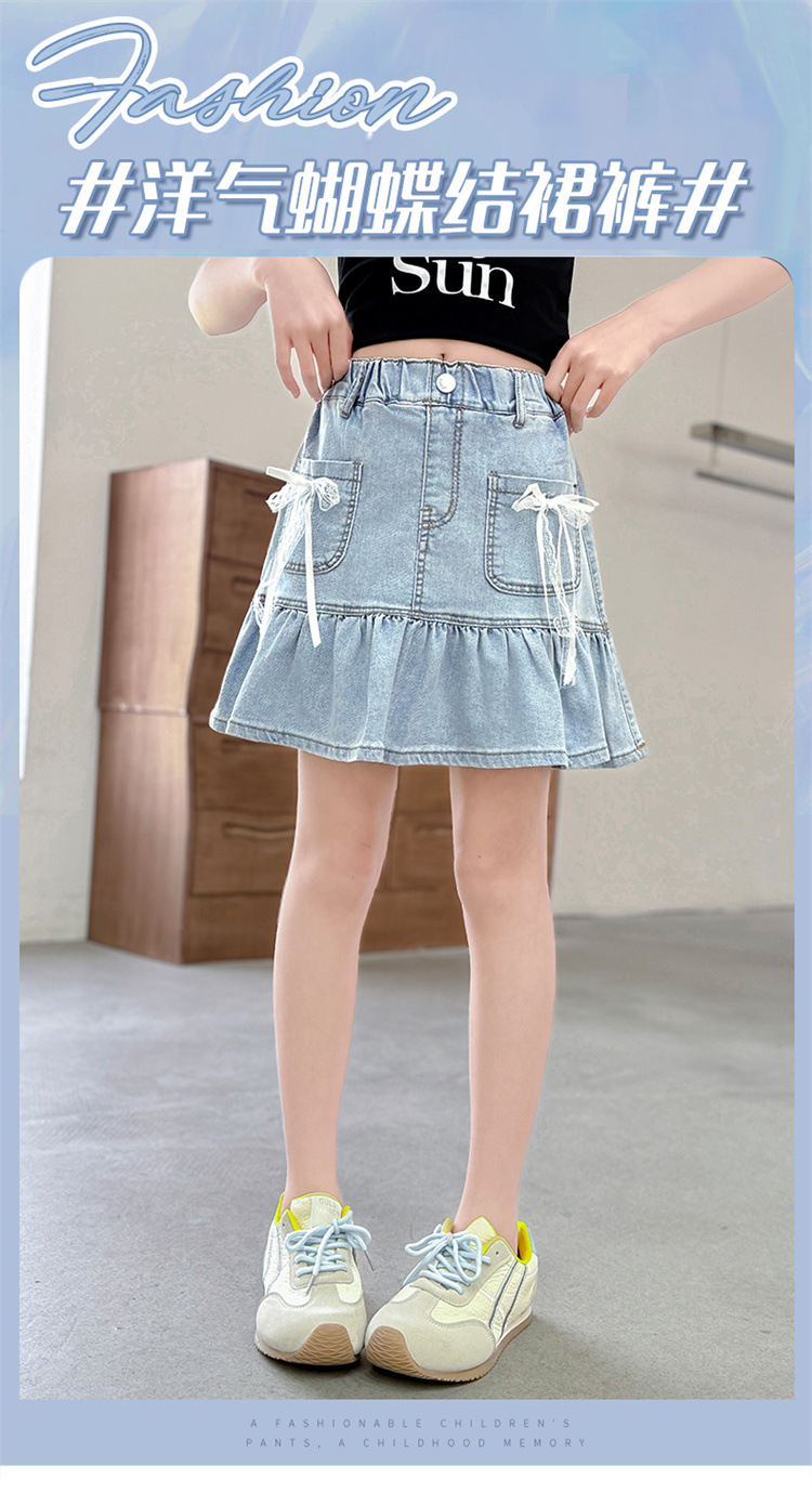 여아 데님 스커트 여름 얇은 2025 새로운 스타일 중대형 어린이 유행 나비 매듭 노출 방지 짧은 스커트 유행
