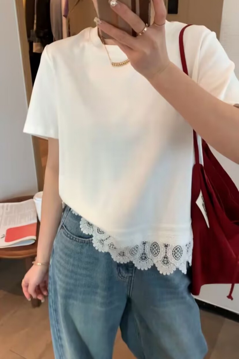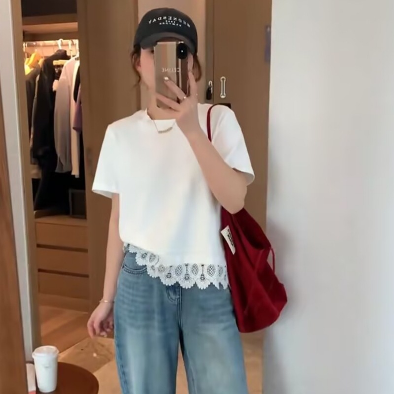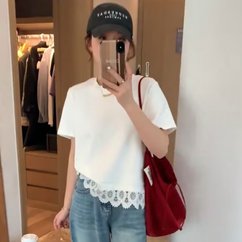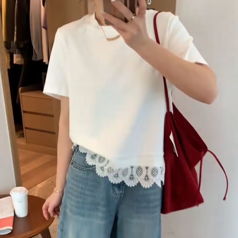 하이 엔드 유럽 제품 2025 봄 여름 새로운 느슨한 슬리밍 밑단 레이스 중공 접합 반팔 티셔츠 여성상의스토어 가기