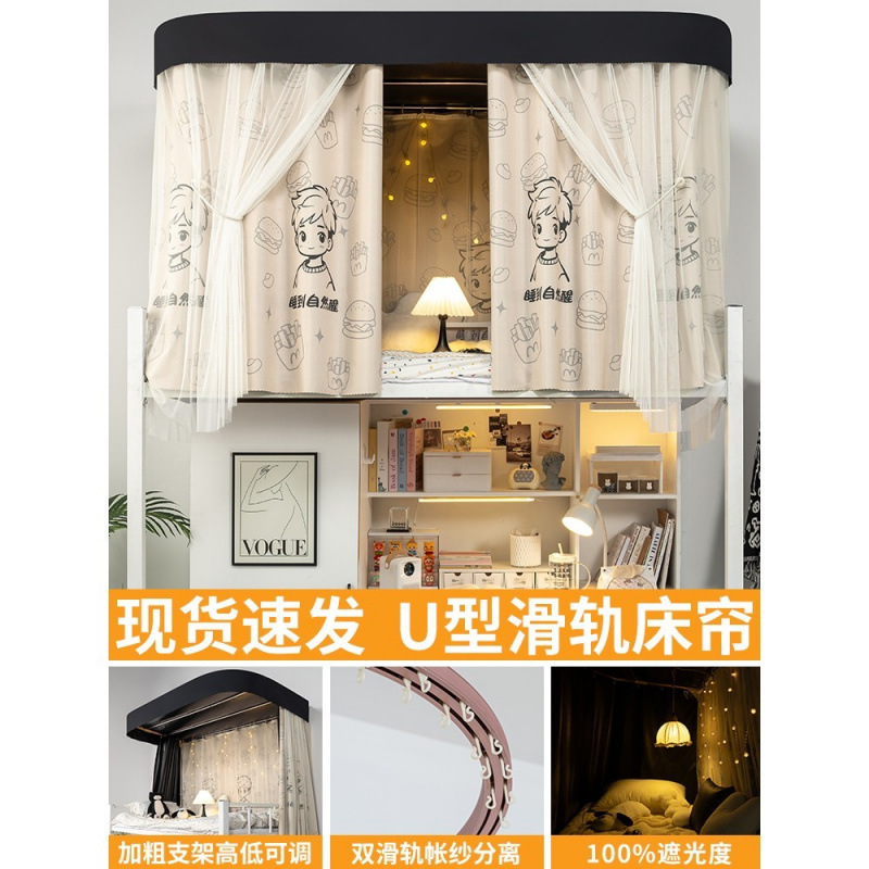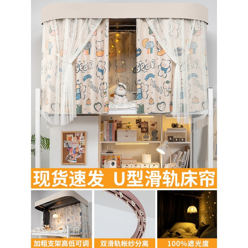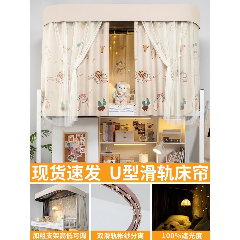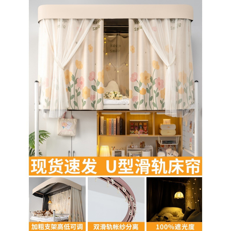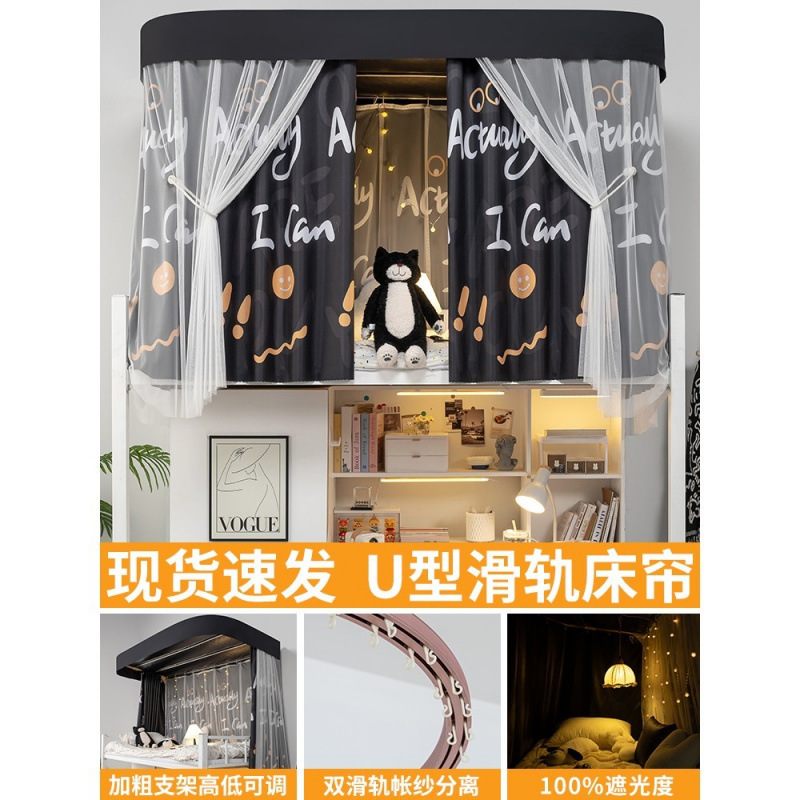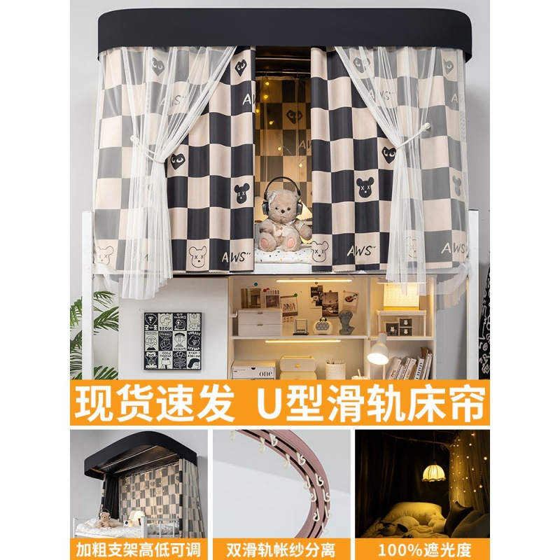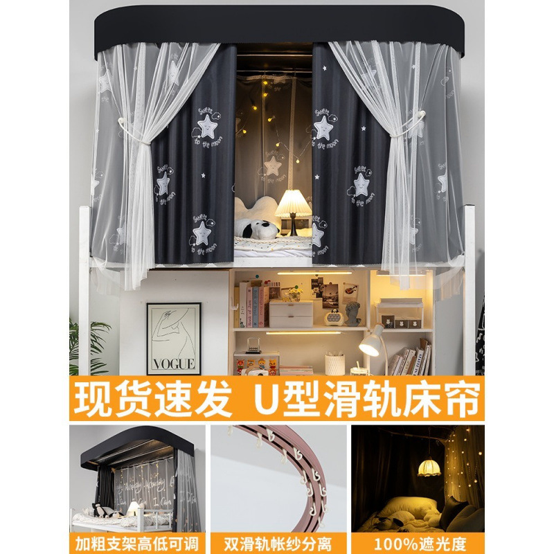 상단 침대용 특수 U자형 이중 슬라이드 레일 완전 차광 침대 커튼, 대학 기숙사 기숙사 일체형 모기장, 두꺼운 U자형 커튼스토어 가기