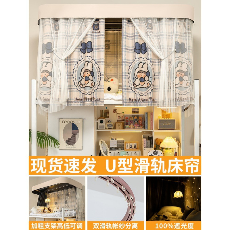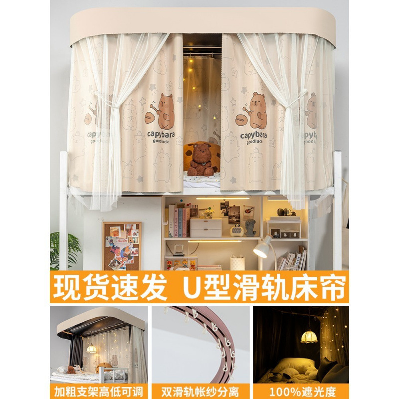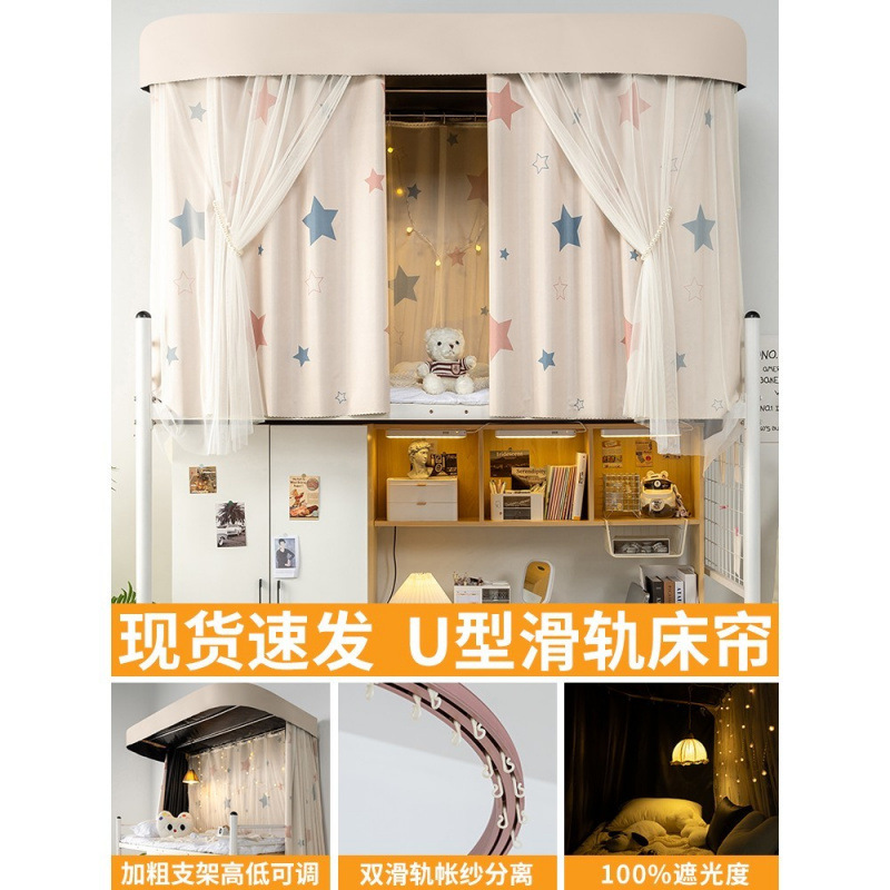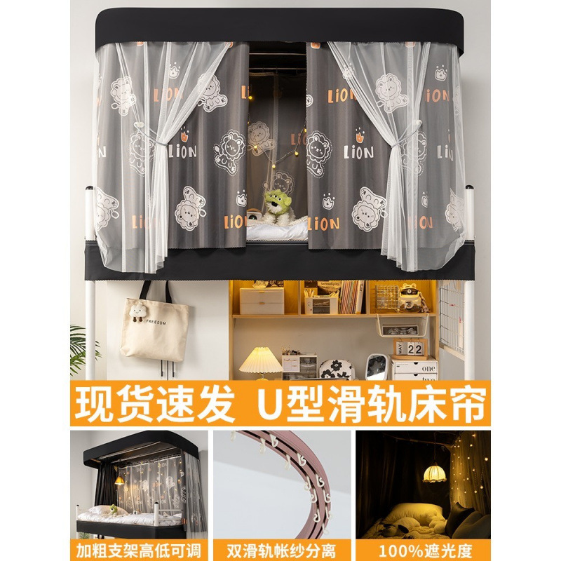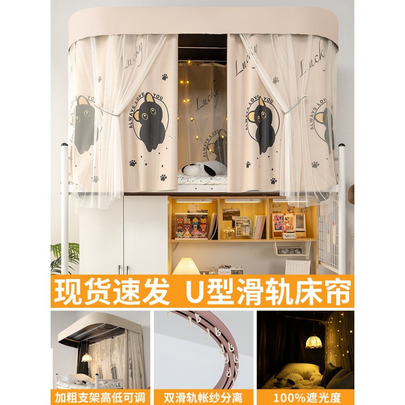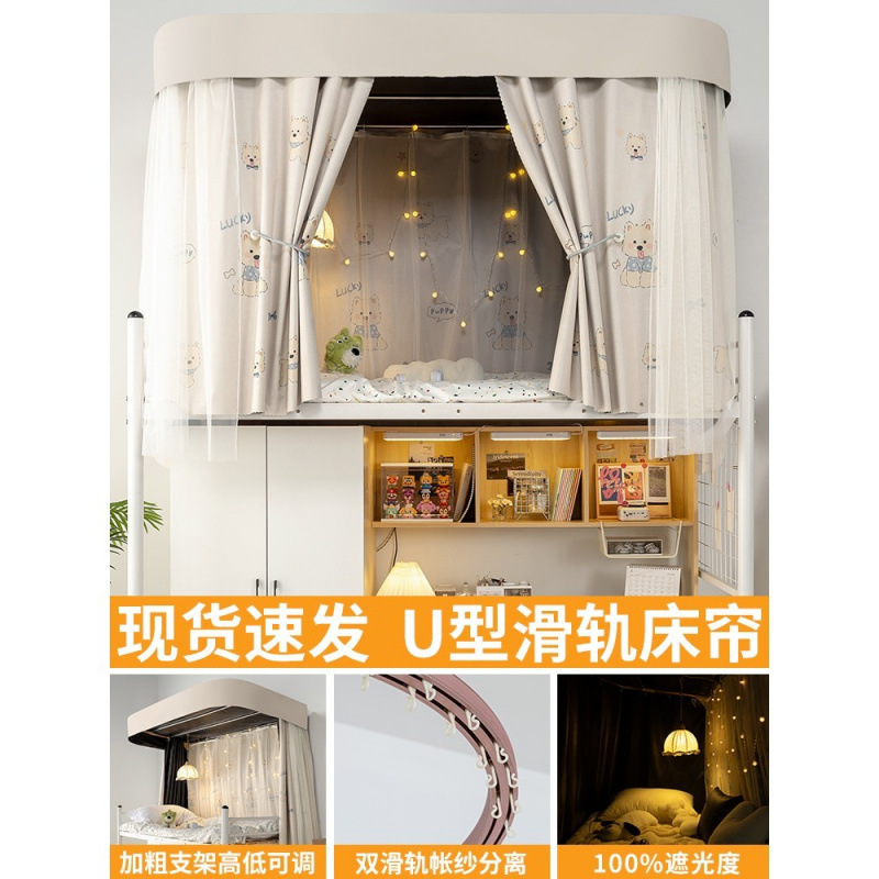 상단 침대용 특수 U자형 이중 슬라이드 레일 완전 차광 침대 커튼, 대학 기숙사 기숙사 일체형 모기장, 두꺼운 U자형 커튼스토어 가기