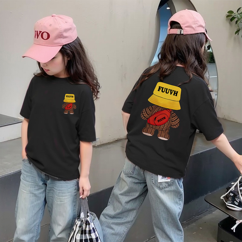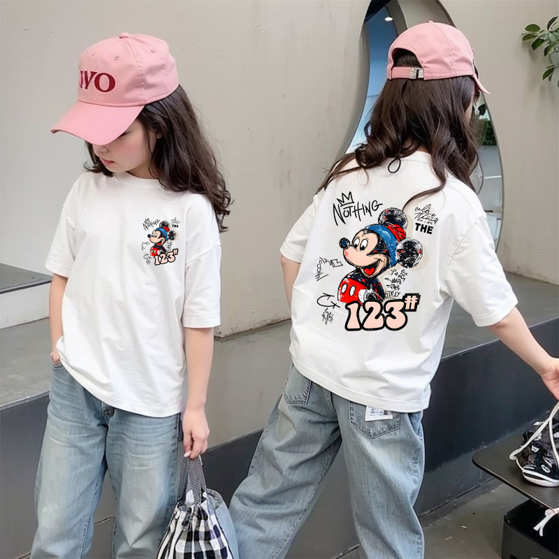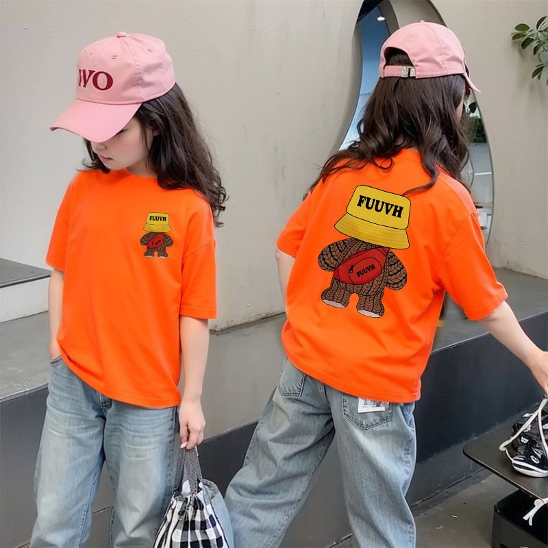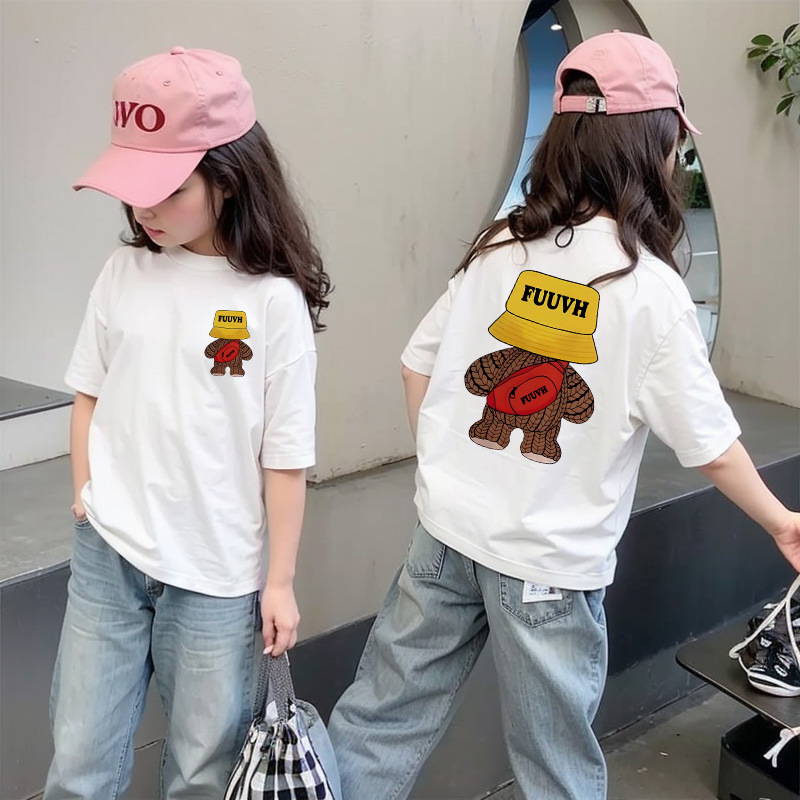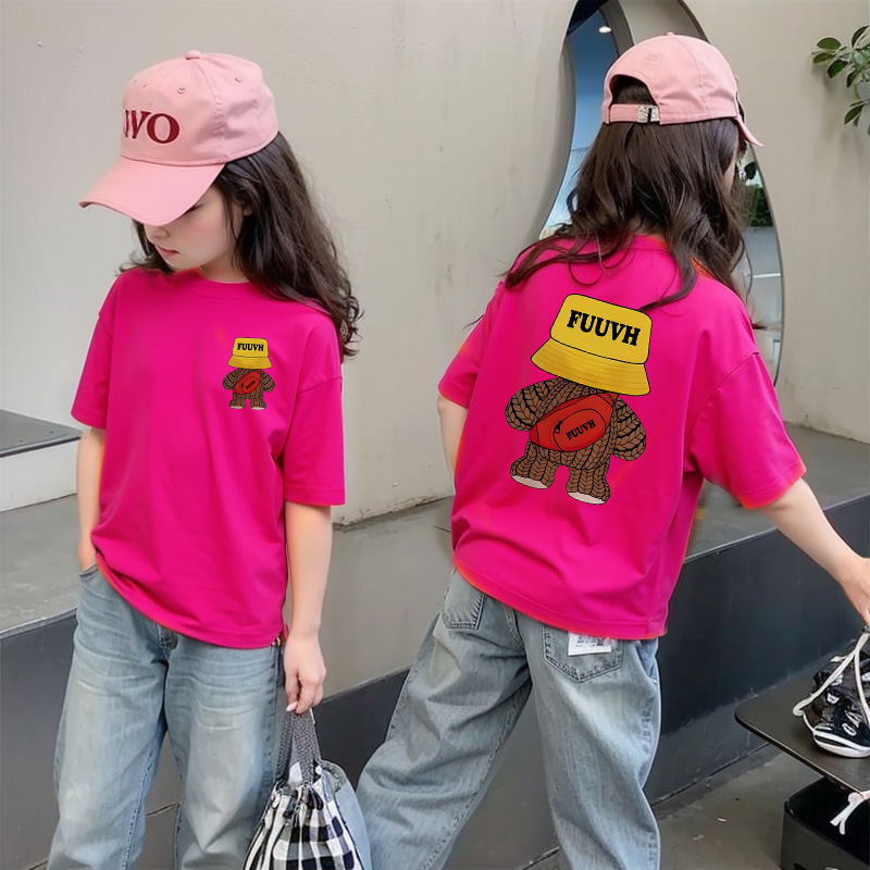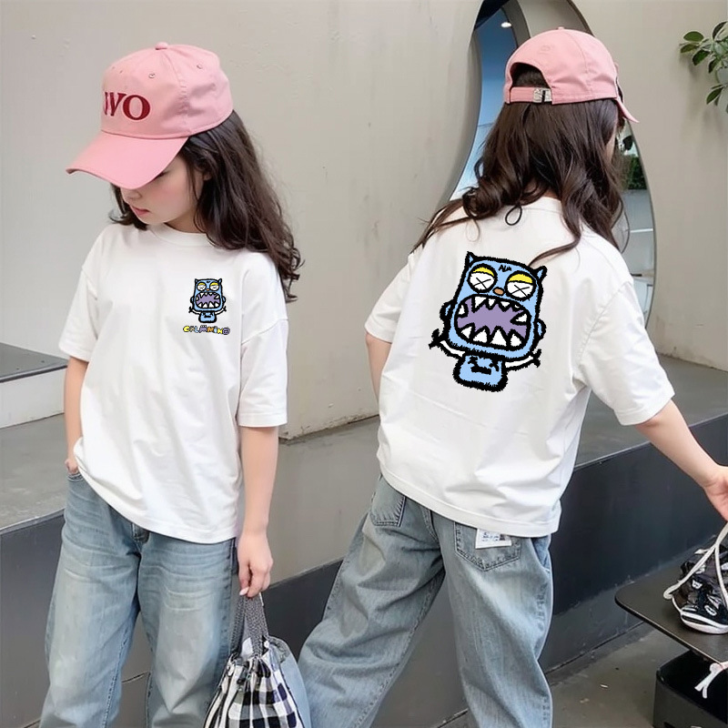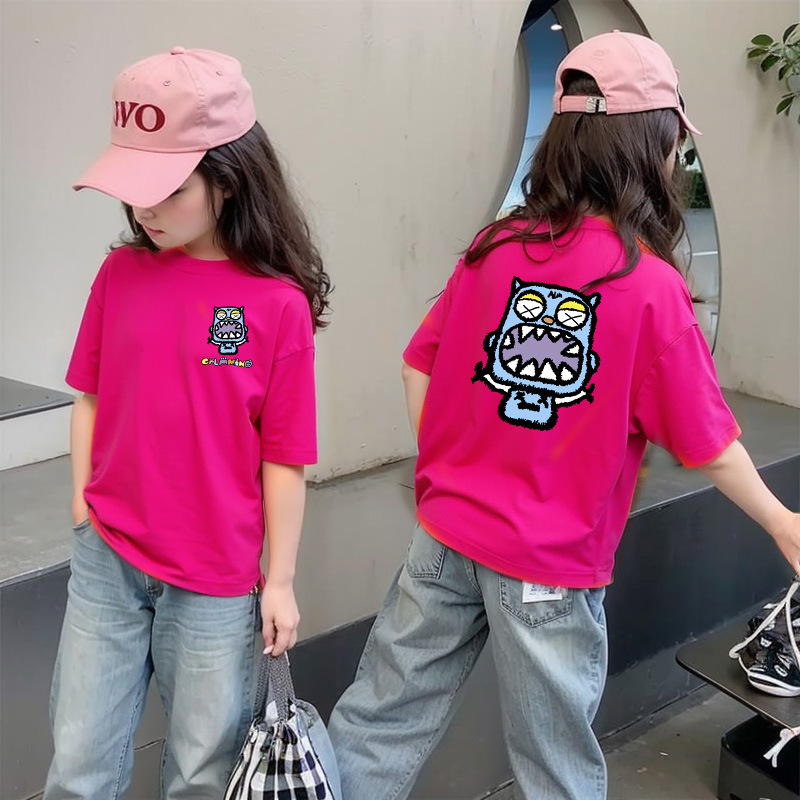 걸스 서머 코튼 반팔 티셔츠 유행 서양식 어린이 캐주얼 루즈 탑 큰 어린이 여름 만화 티셔츠