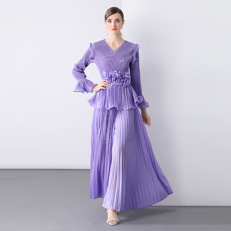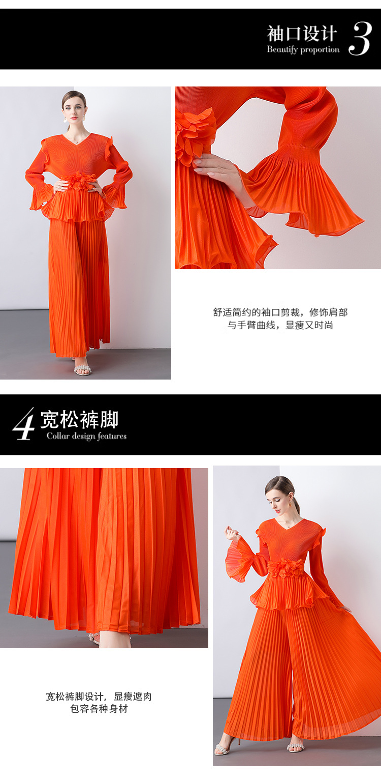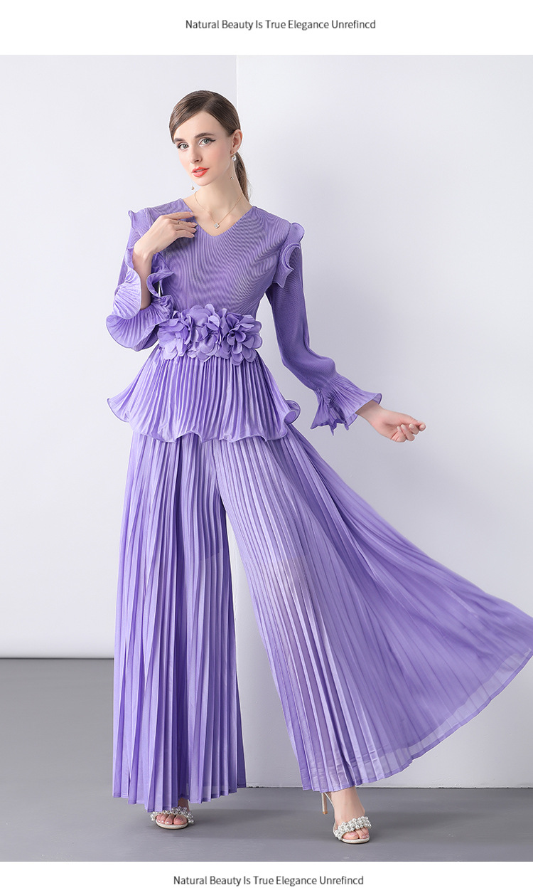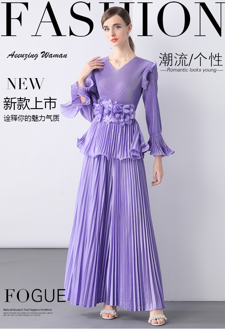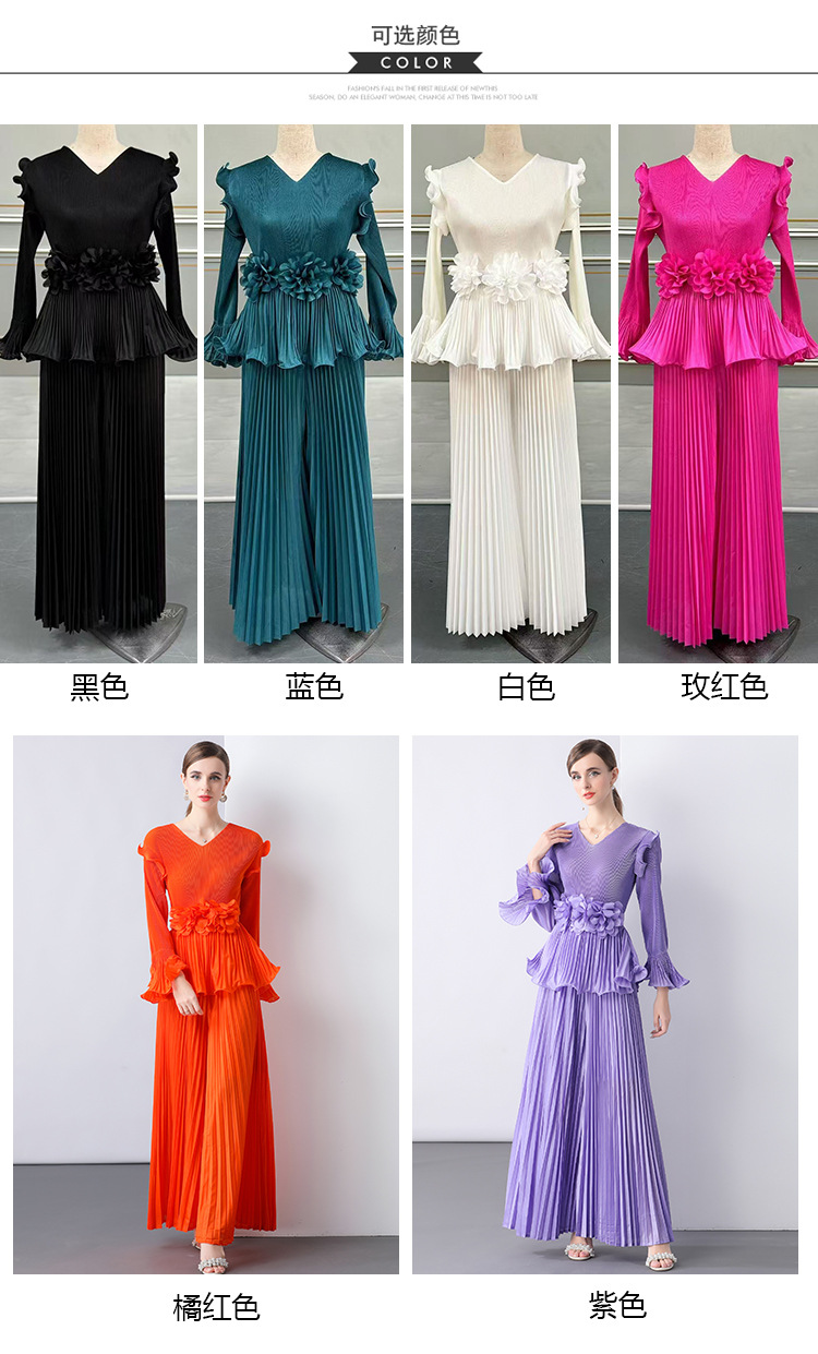 2512 프렌치 입체 플라워 스플라이싱 슈트 여성 봄 신작 미야케 플리츠 러플 탑 하이웨이스트 와이드 팬츠