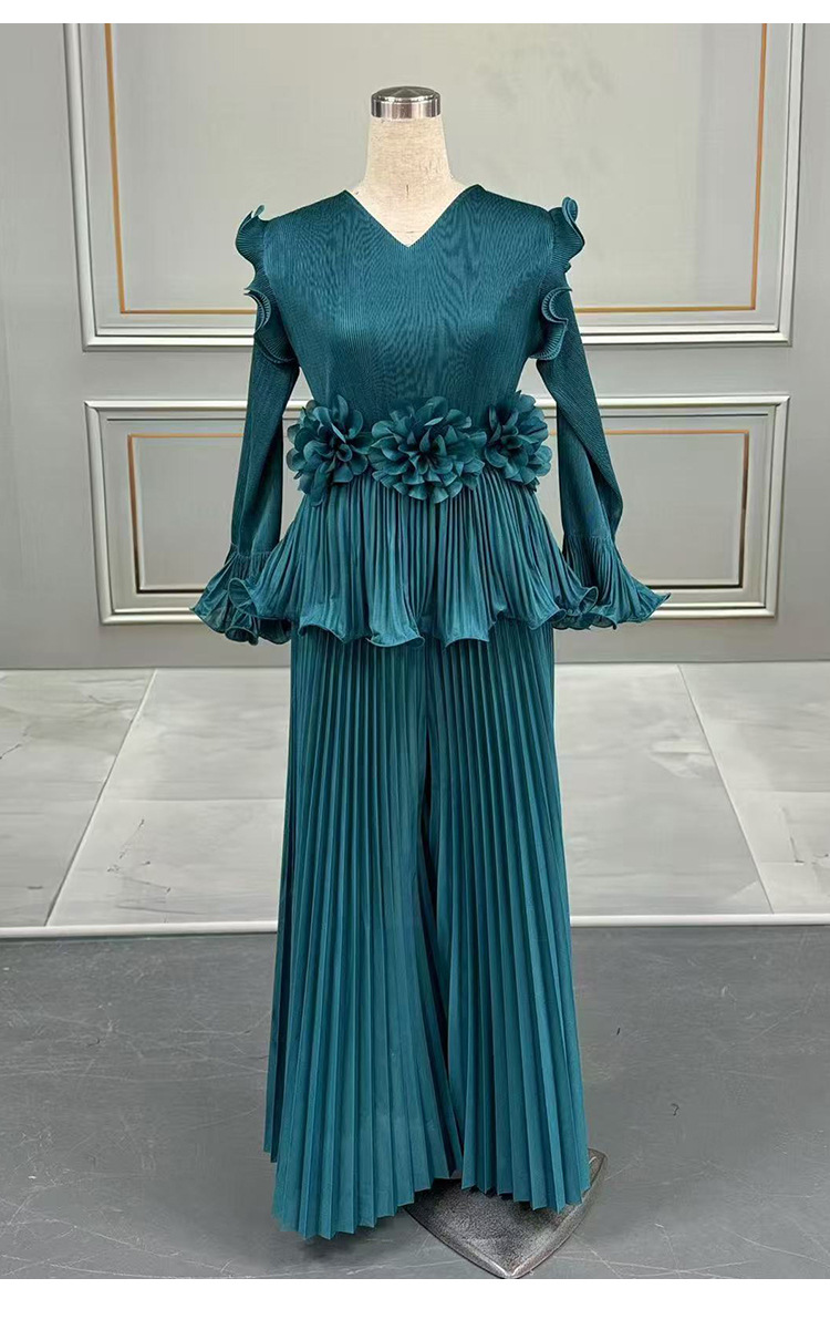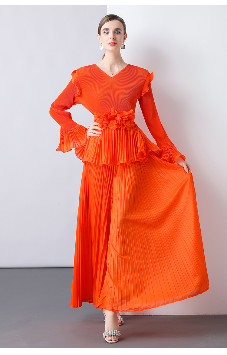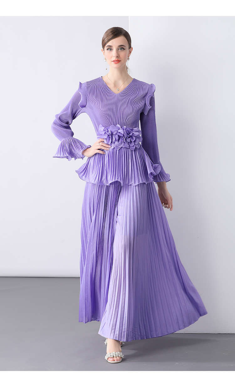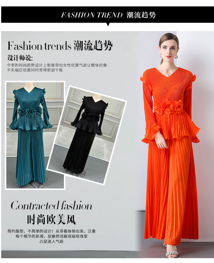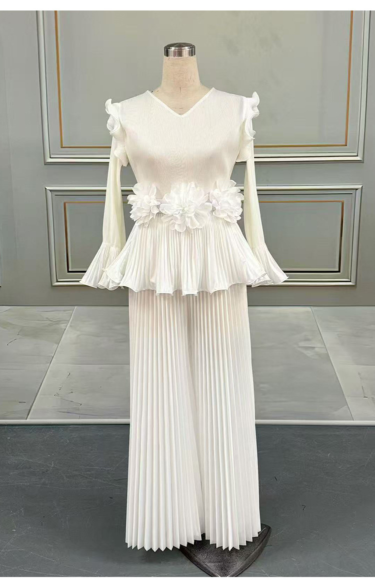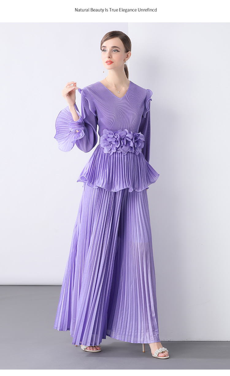 2512 프렌치 입체 플라워 스플라이싱 슈트 여성 봄 신작 미야케 플리츠 러플 탑 하이웨이스트 와이드 팬츠