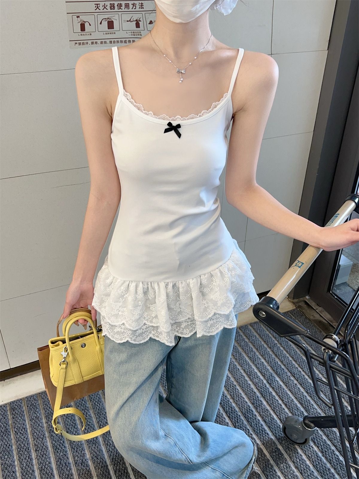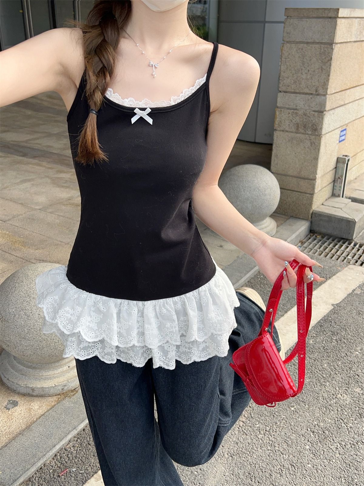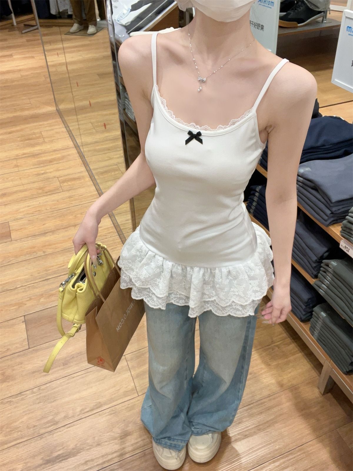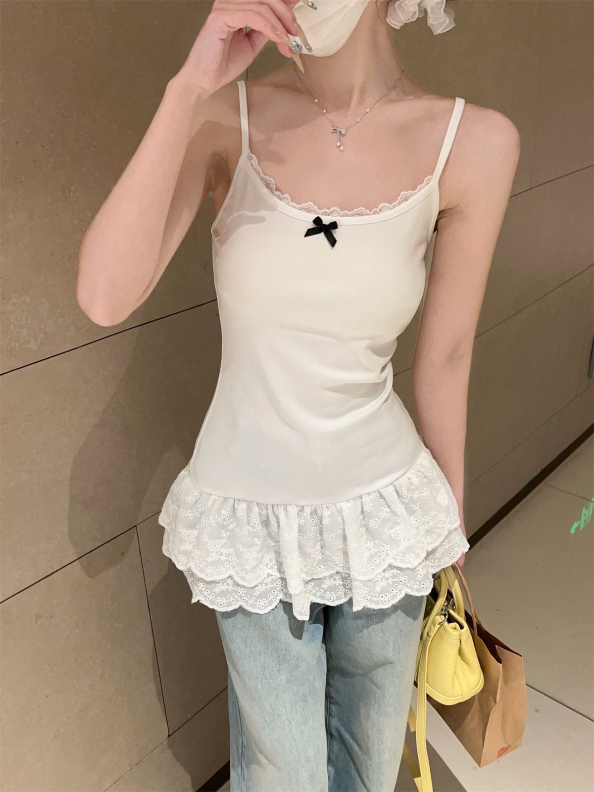 Jane Mani의 순수한 욕망 스타일 보우 레이스 밑단 스플라이싱 여름 캐미솔 여성스러운 슬림 이너 탑