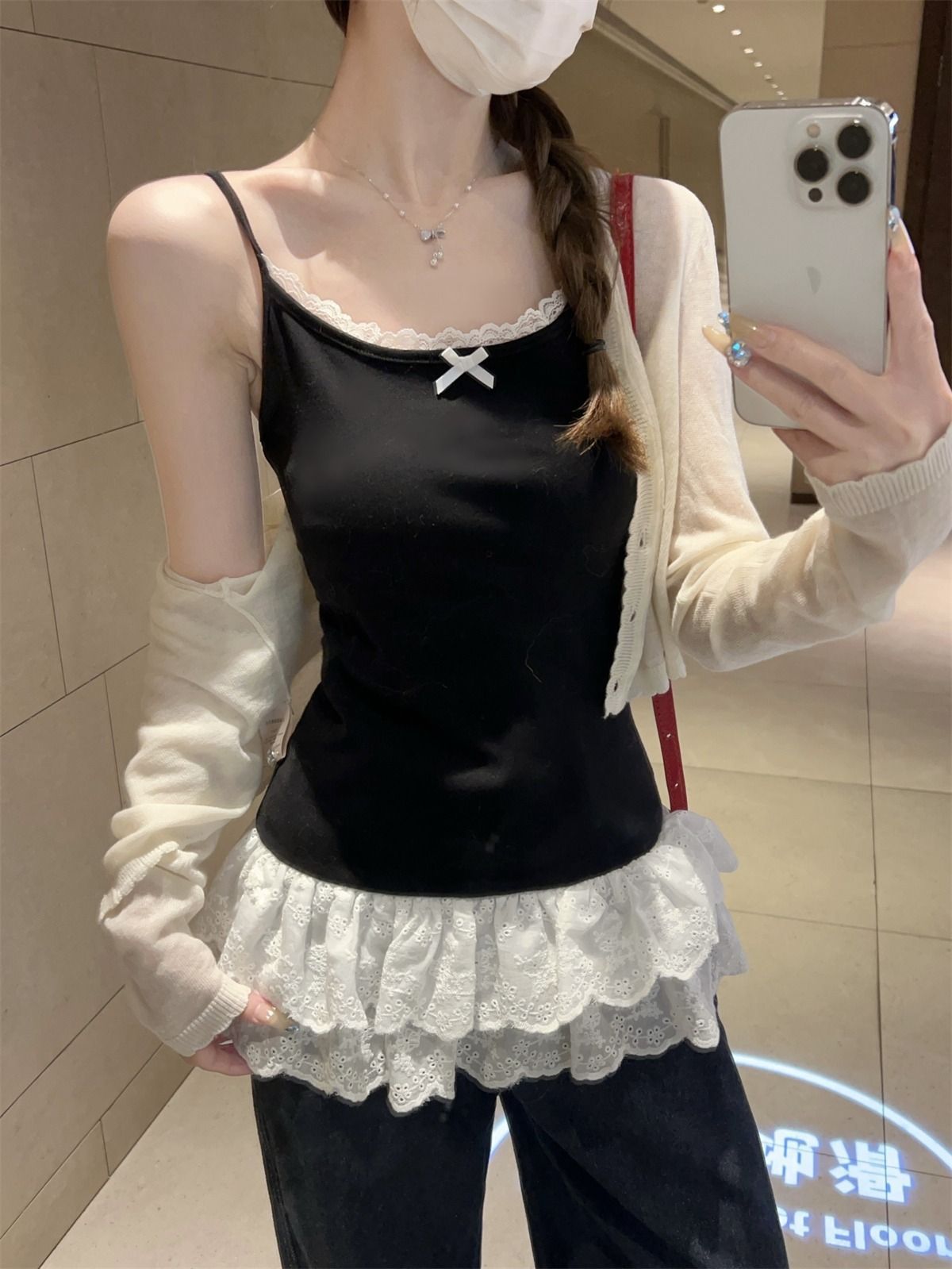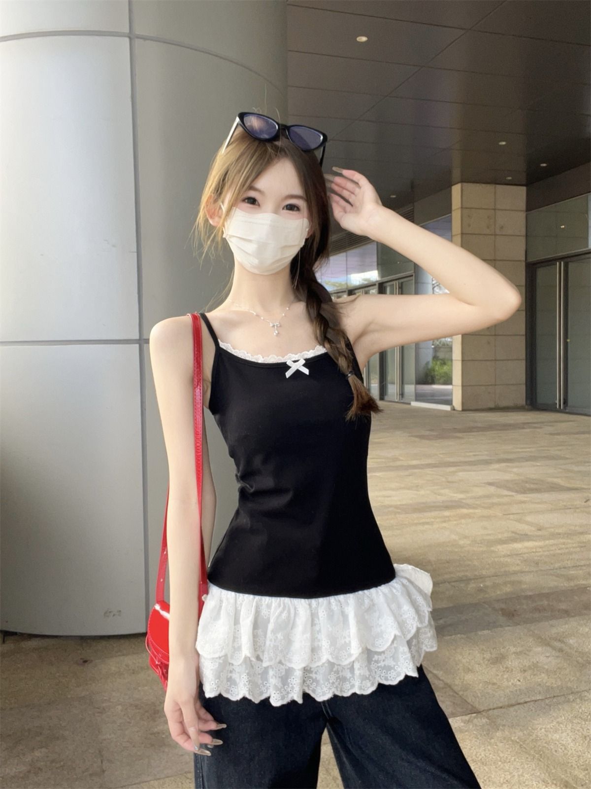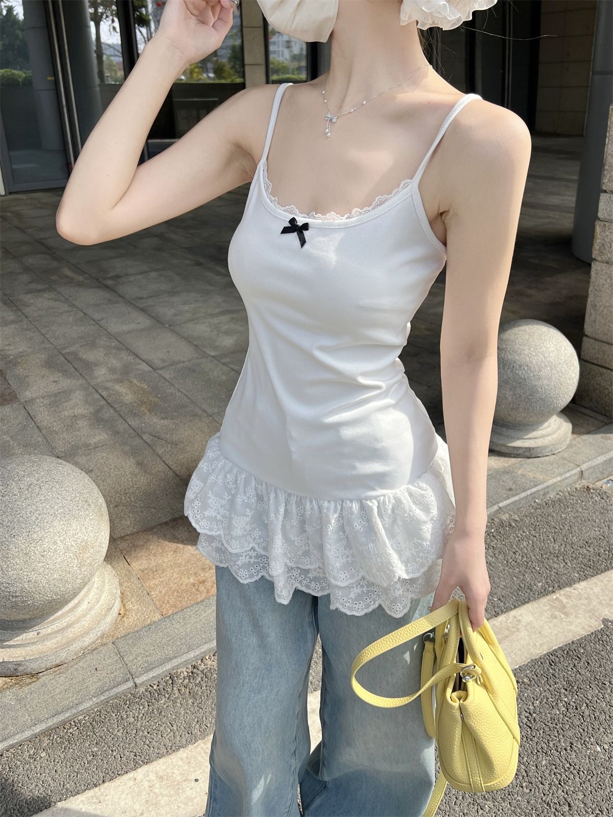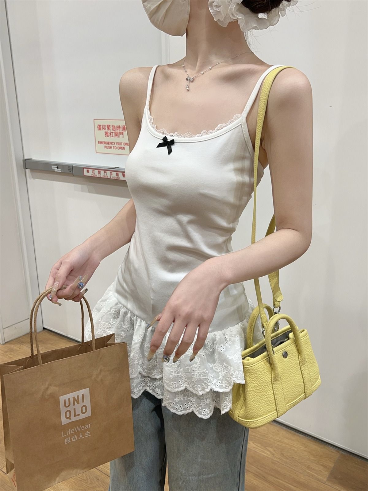 Jane Mani의 순수한 욕망 스타일 보우 레이스 밑단 스플라이싱 여름 캐미솔 여성스러운 슬림 이너 탑