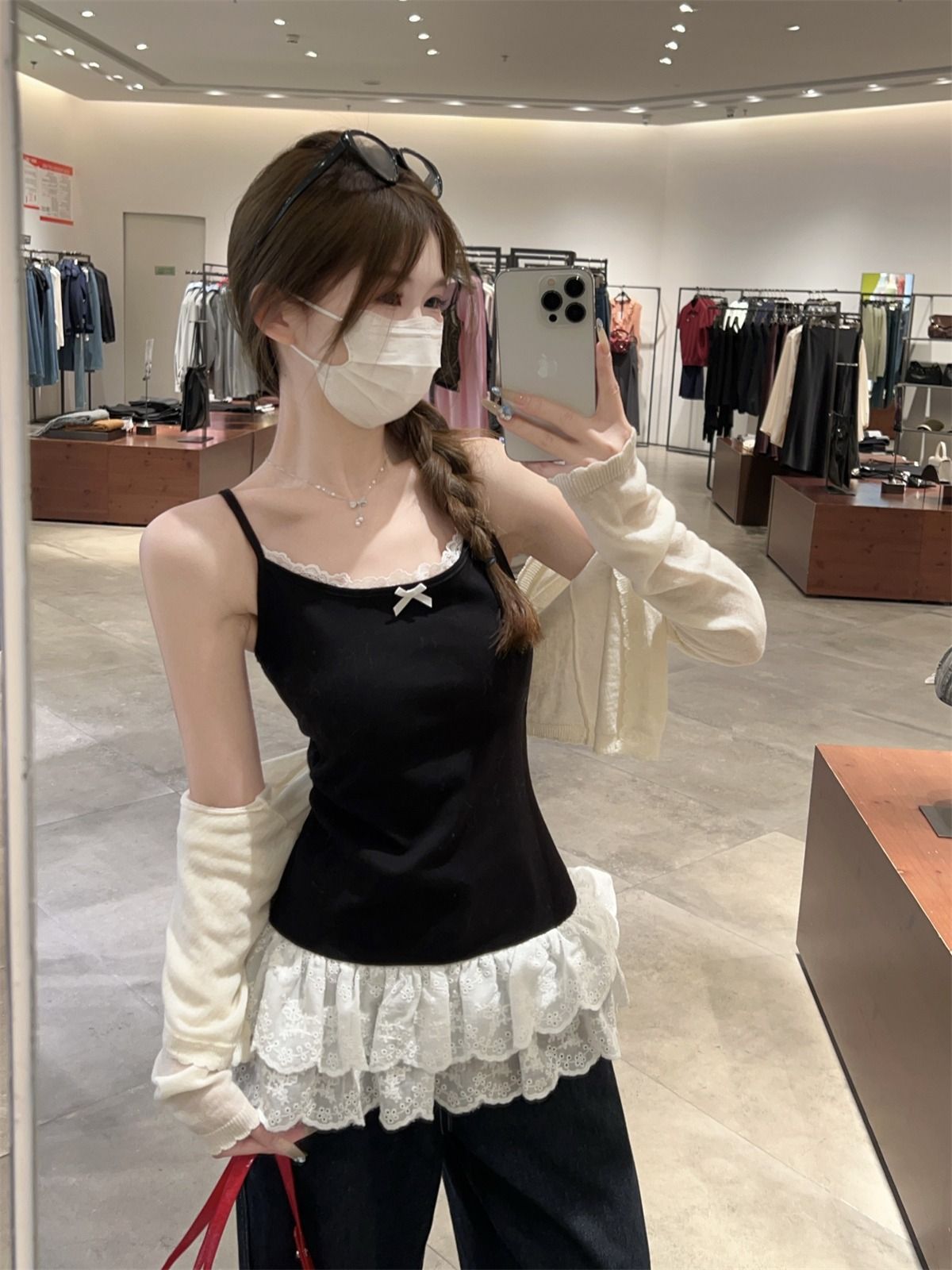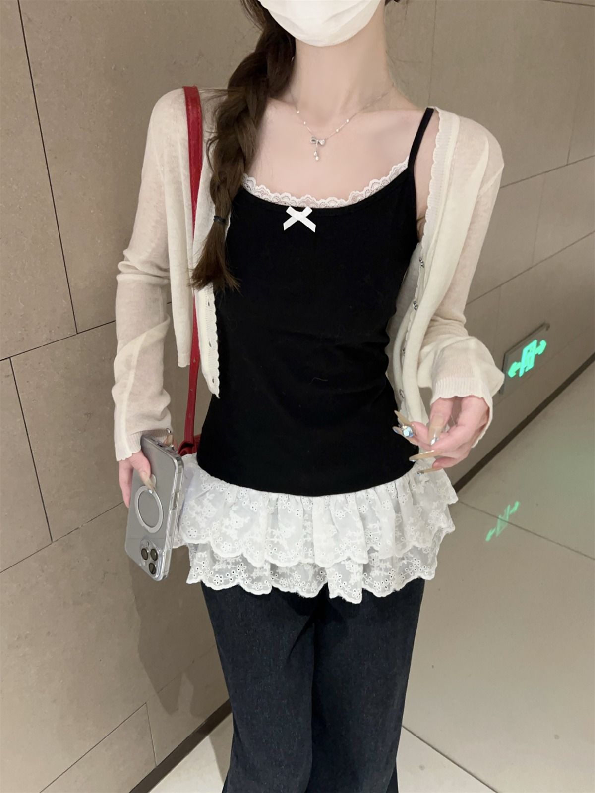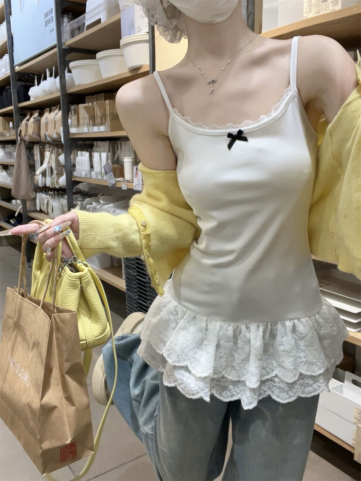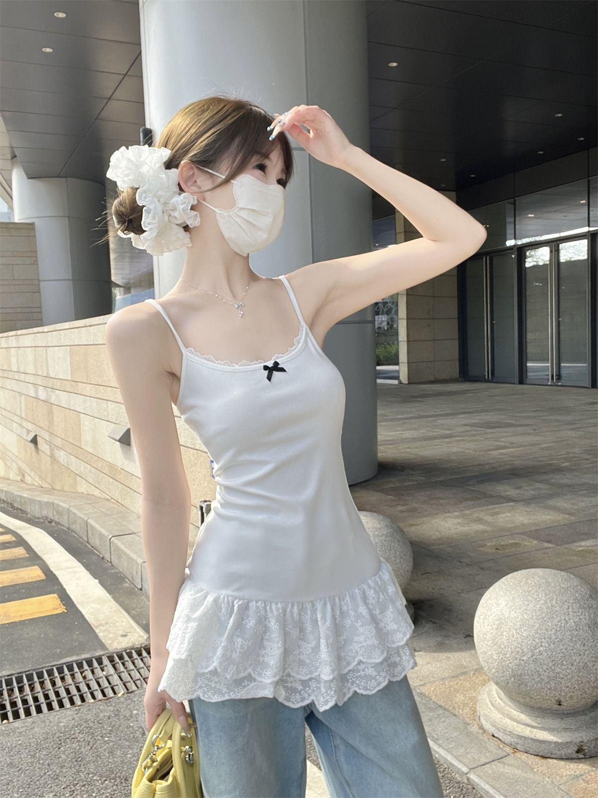 Jane Mani의 순수한 욕망 스타일 보우 레이스 밑단 스플라이싱 여름 캐미솔 여성스러운 슬림 이너 탑