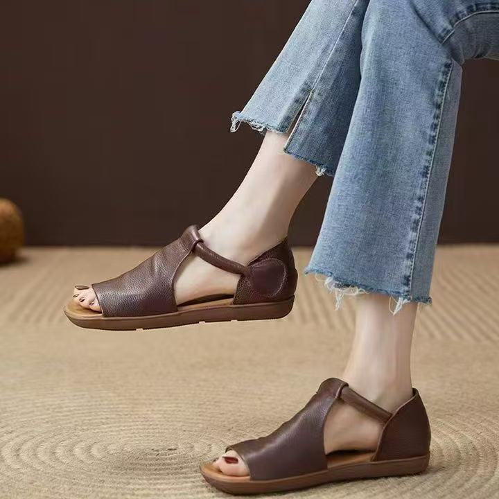 2025 여름 새로운 스타일 진짜 부드러운 가죽 영국 스타일 수제 벨크로 오픈 발가락 샌들 로마 신발 여성을위한 플랫 힐 샌들